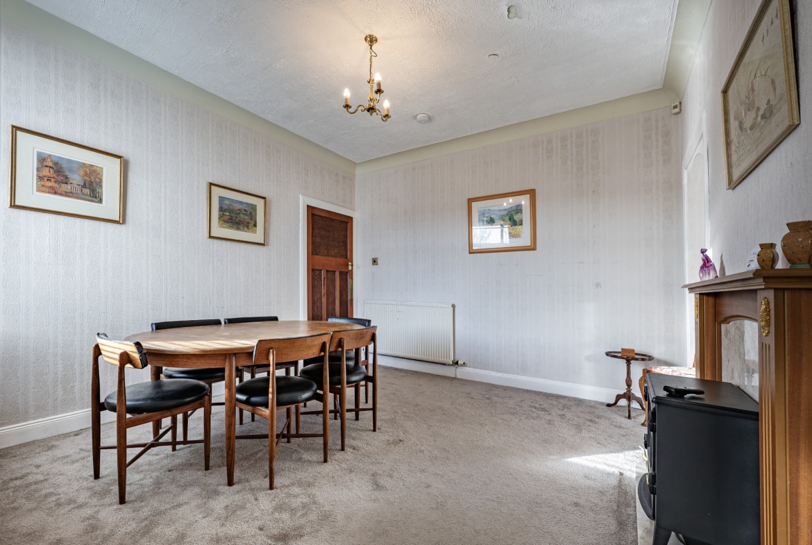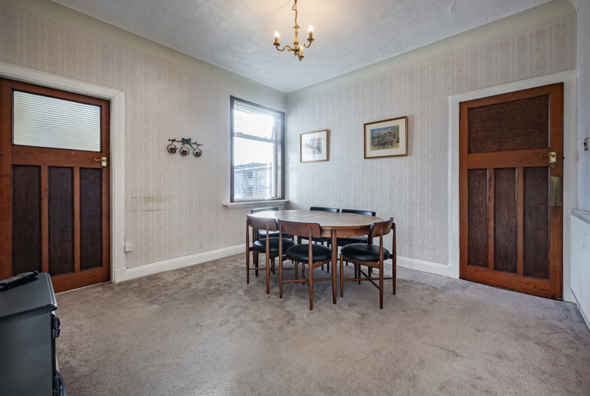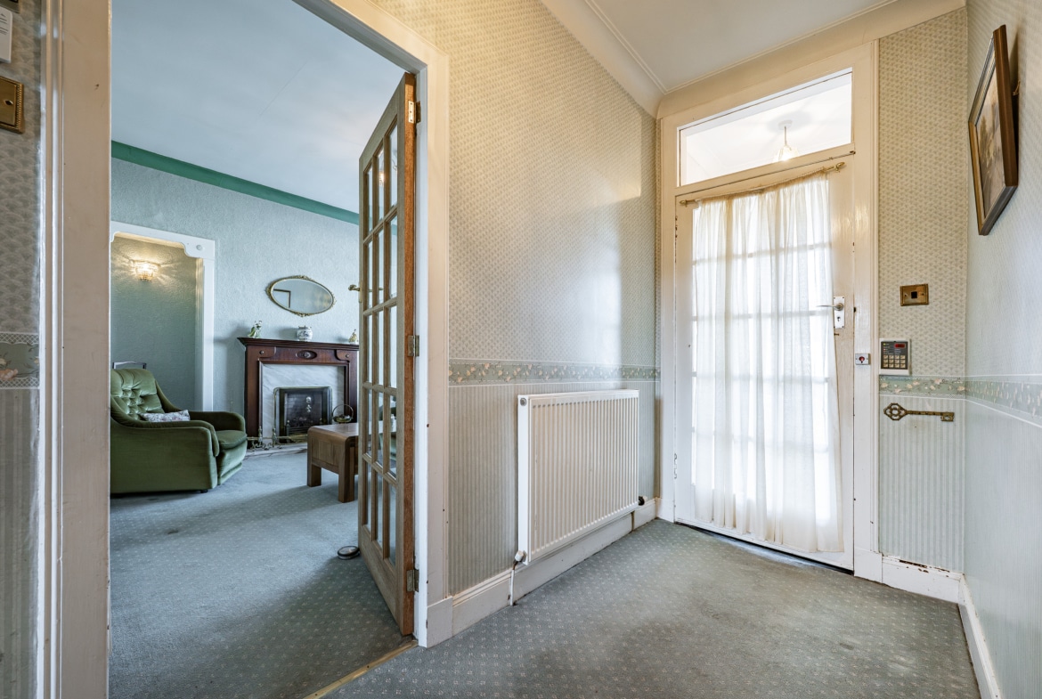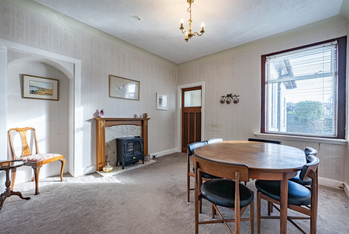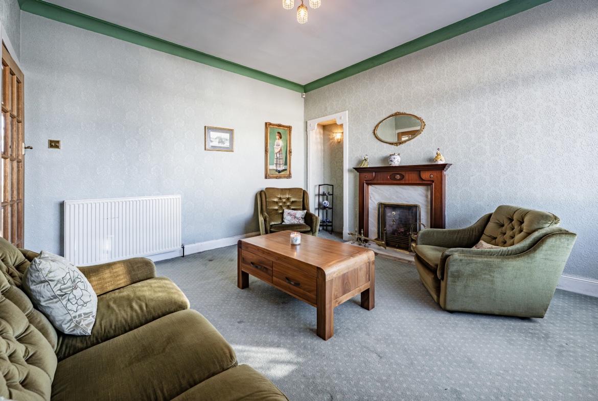 The accommodation begins with a practical entrance vestibule leading into a welcoming reception hallway. The elegant formal lounge features an attractive fireplace detail to the focal wall and a broad box bay window overlooking the front gardens. To the rear of the property lies a versatile dining or sitting room, which in turn provides access to a well-equipped kitchen with a door leading directly to the side of the house.