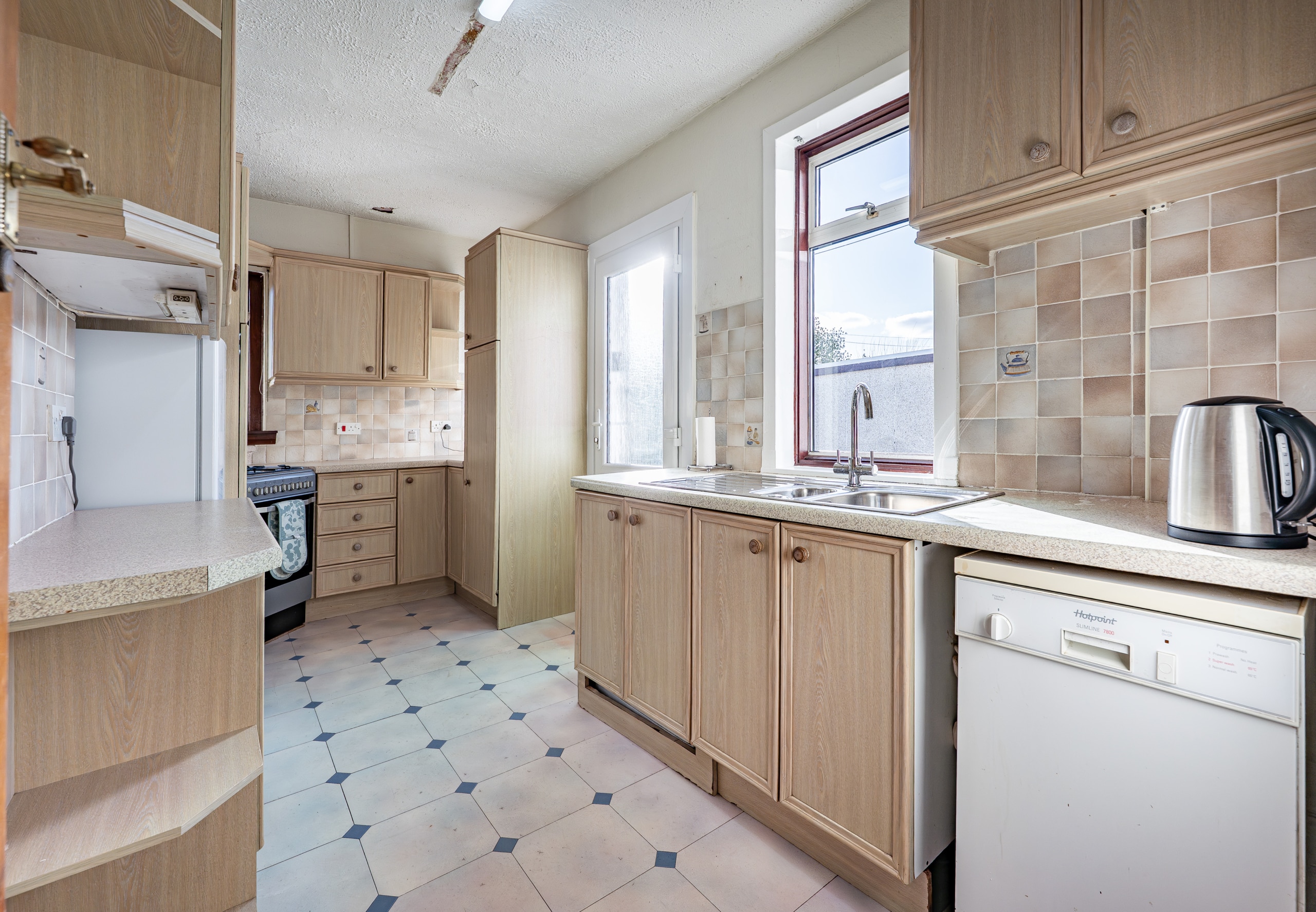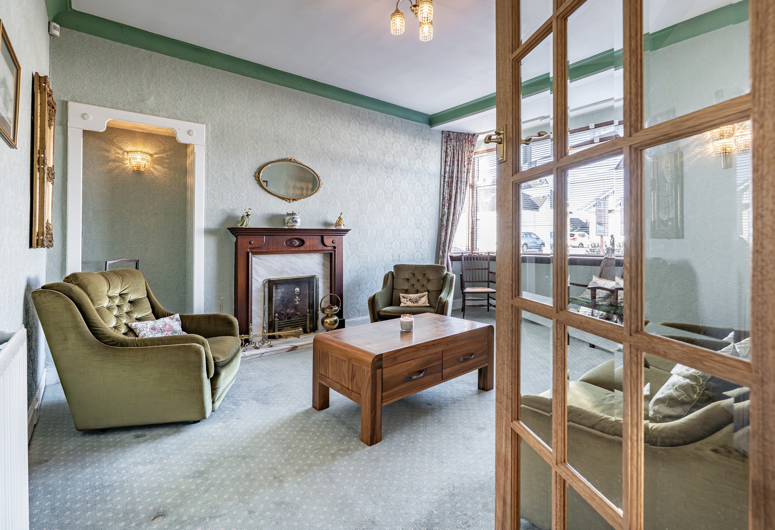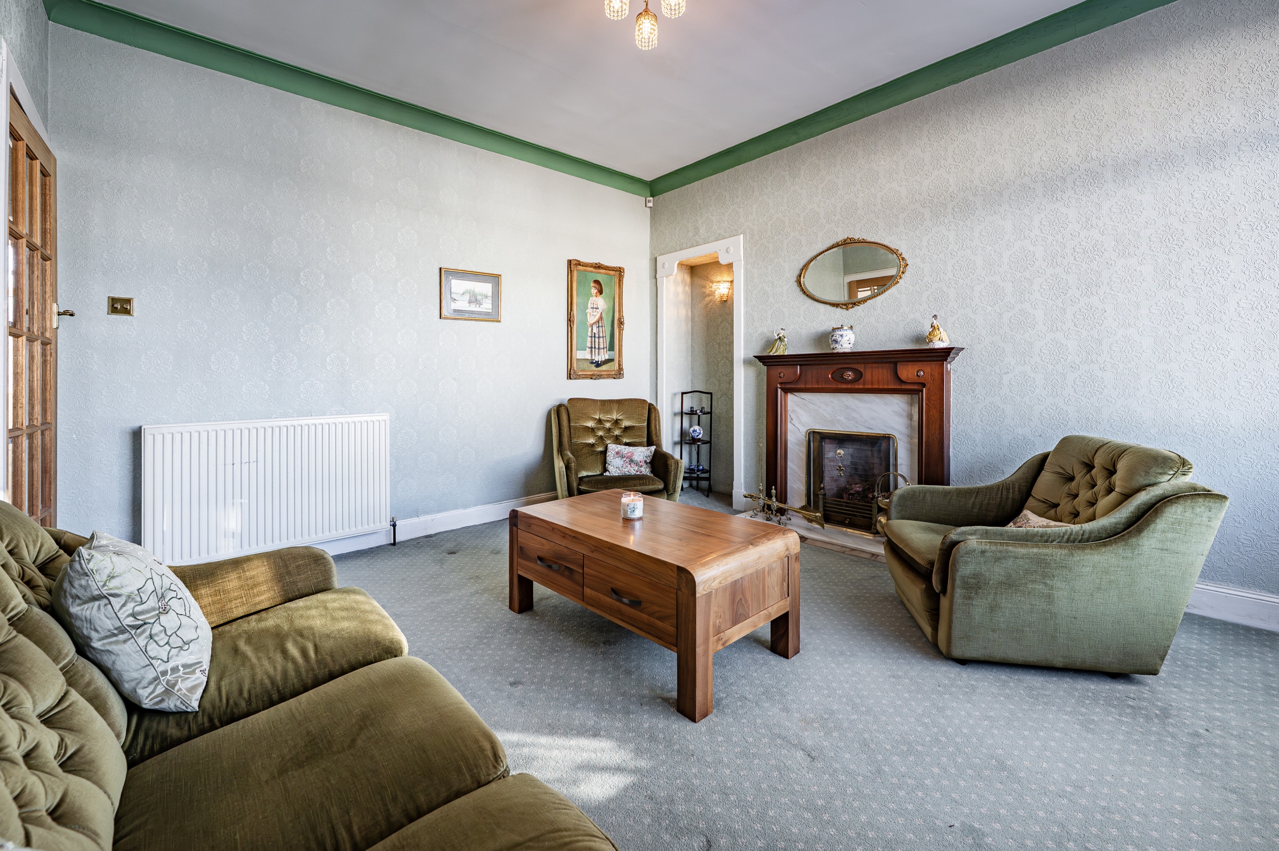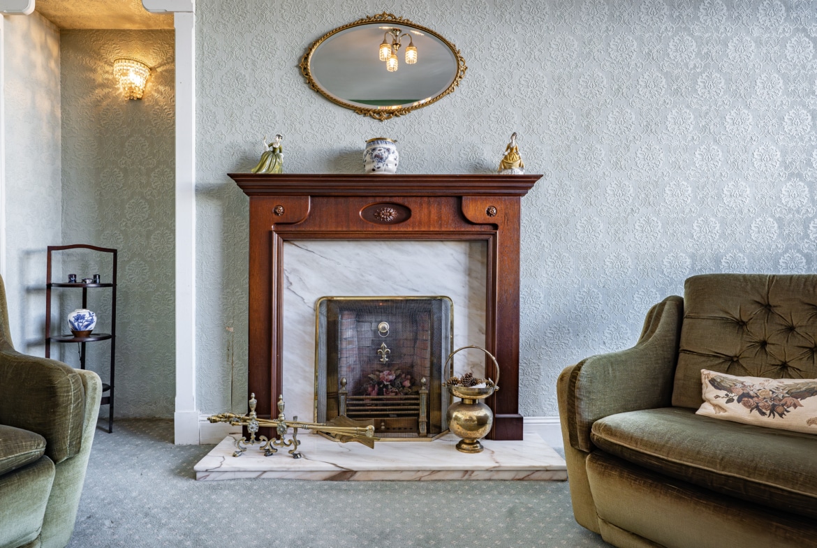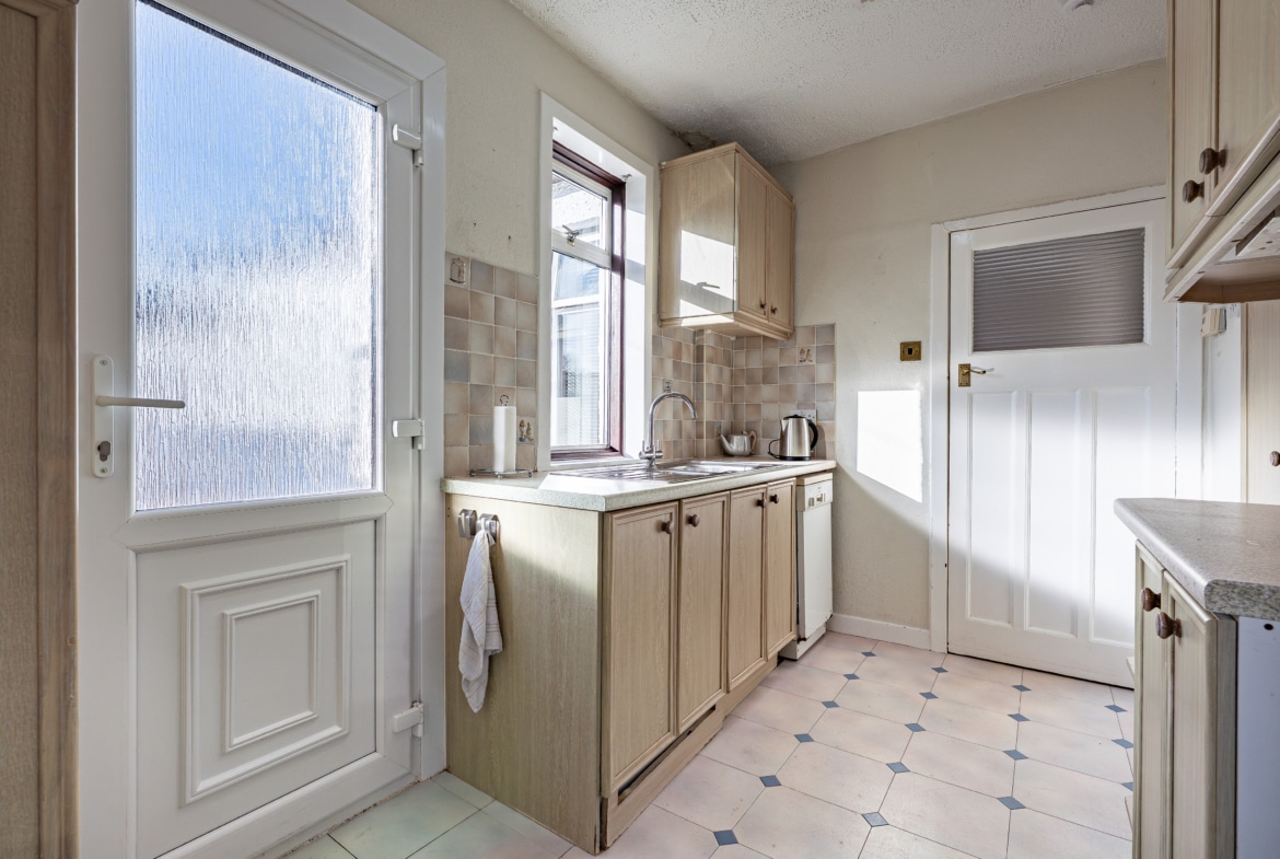 The accommodation begins with a practical entrance vestibule leading into a welcoming reception hallway. The elegant formal lounge features an attractive fireplace detail to the focal wall and a broad box bay window overlooking the front gardens. To the rear of the property lies a versatile dining or sitting room, which in turn provides access to a well-equipped kitchen with a door leading directly to the side of the house.