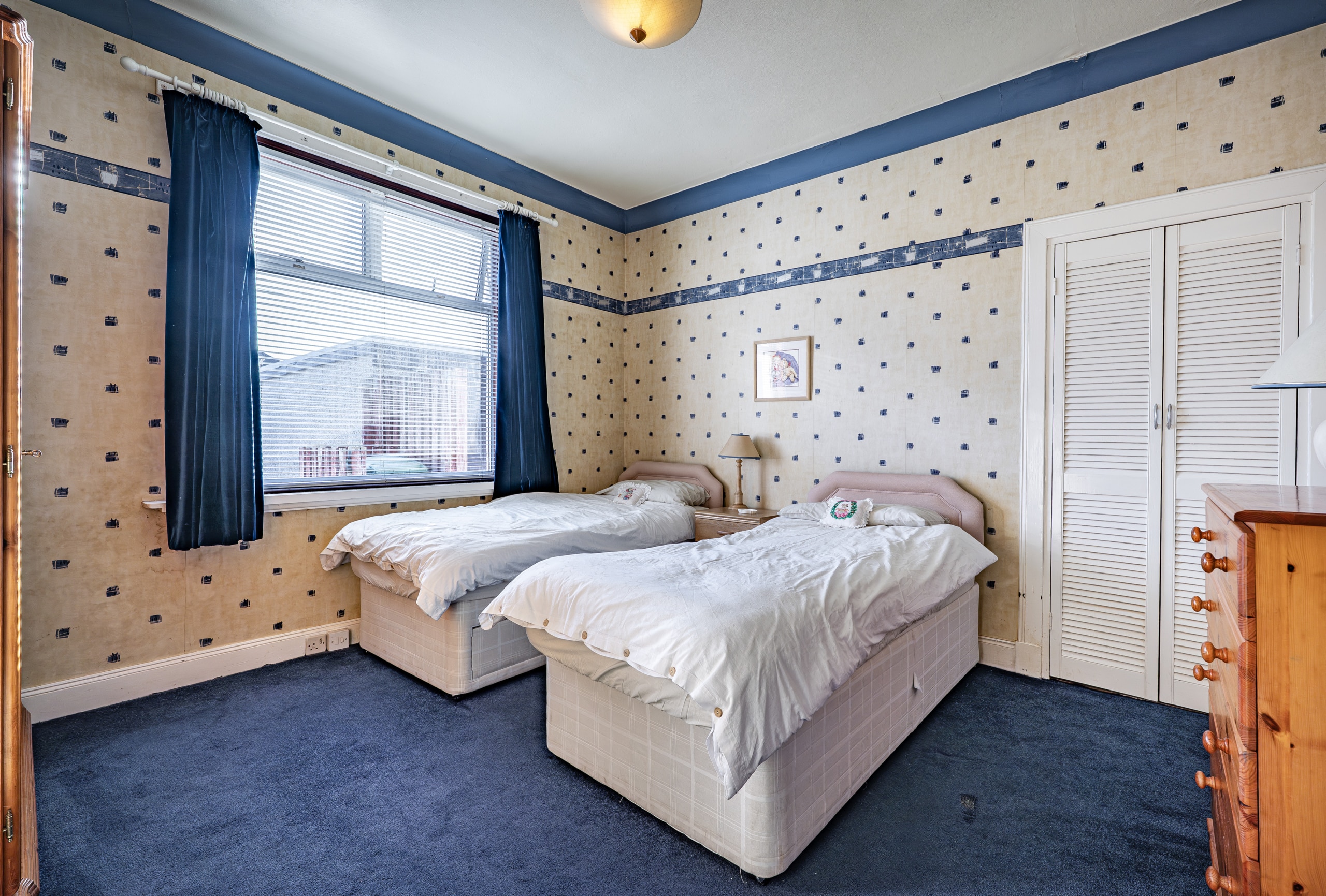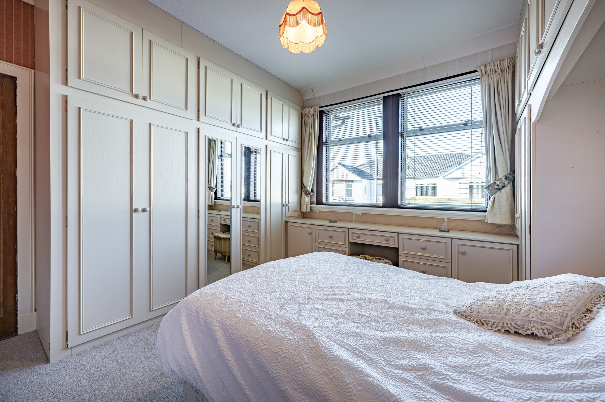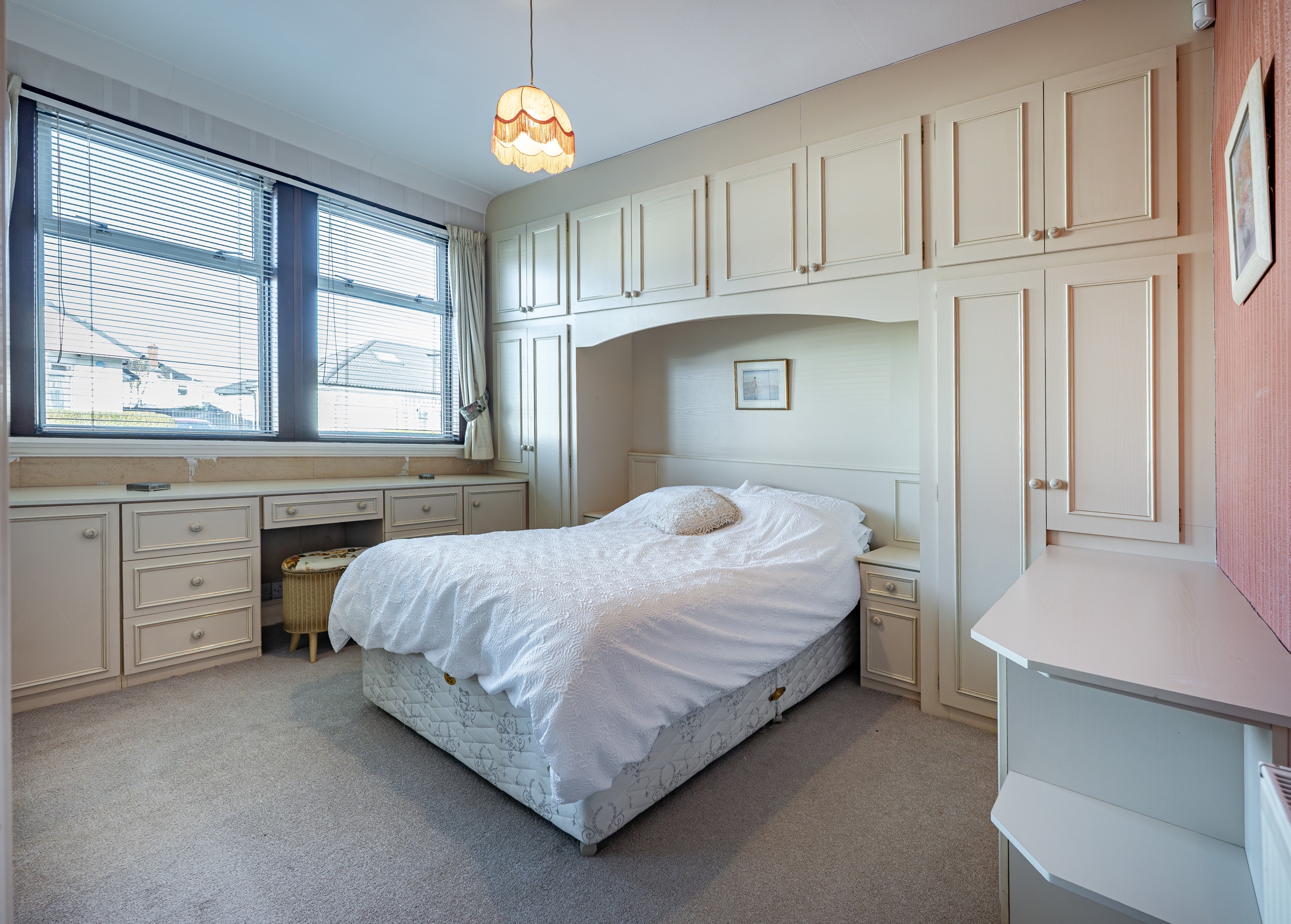 There are two spacious double bedrooms, including a generous principal bedroom with fitted bedroom furniture, and a well-appointed three-piece bathroom completing the internal accommodation.