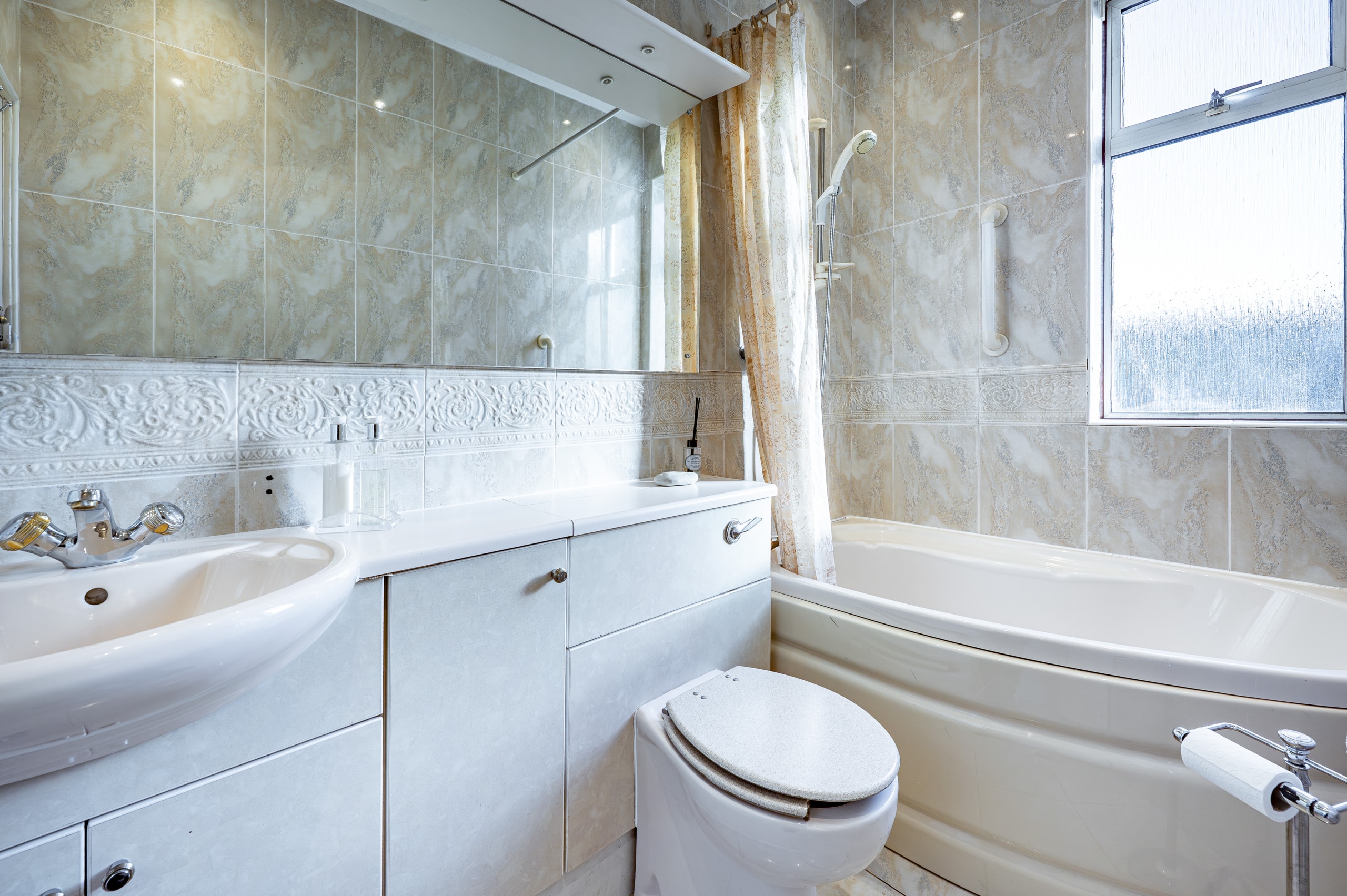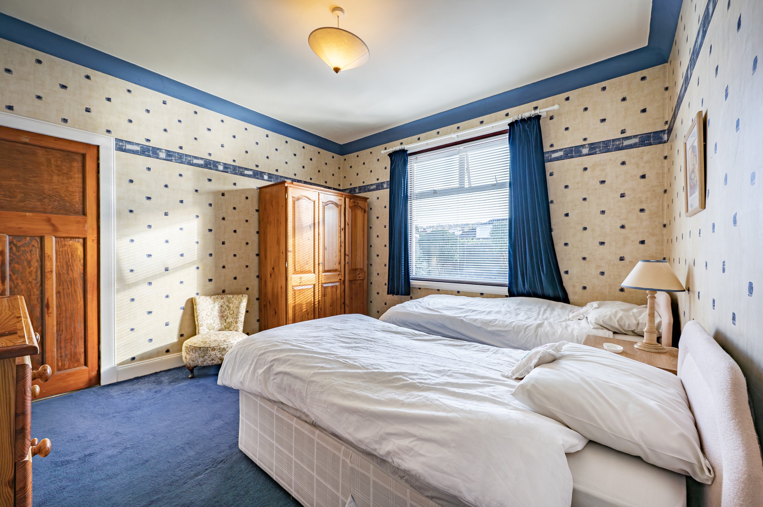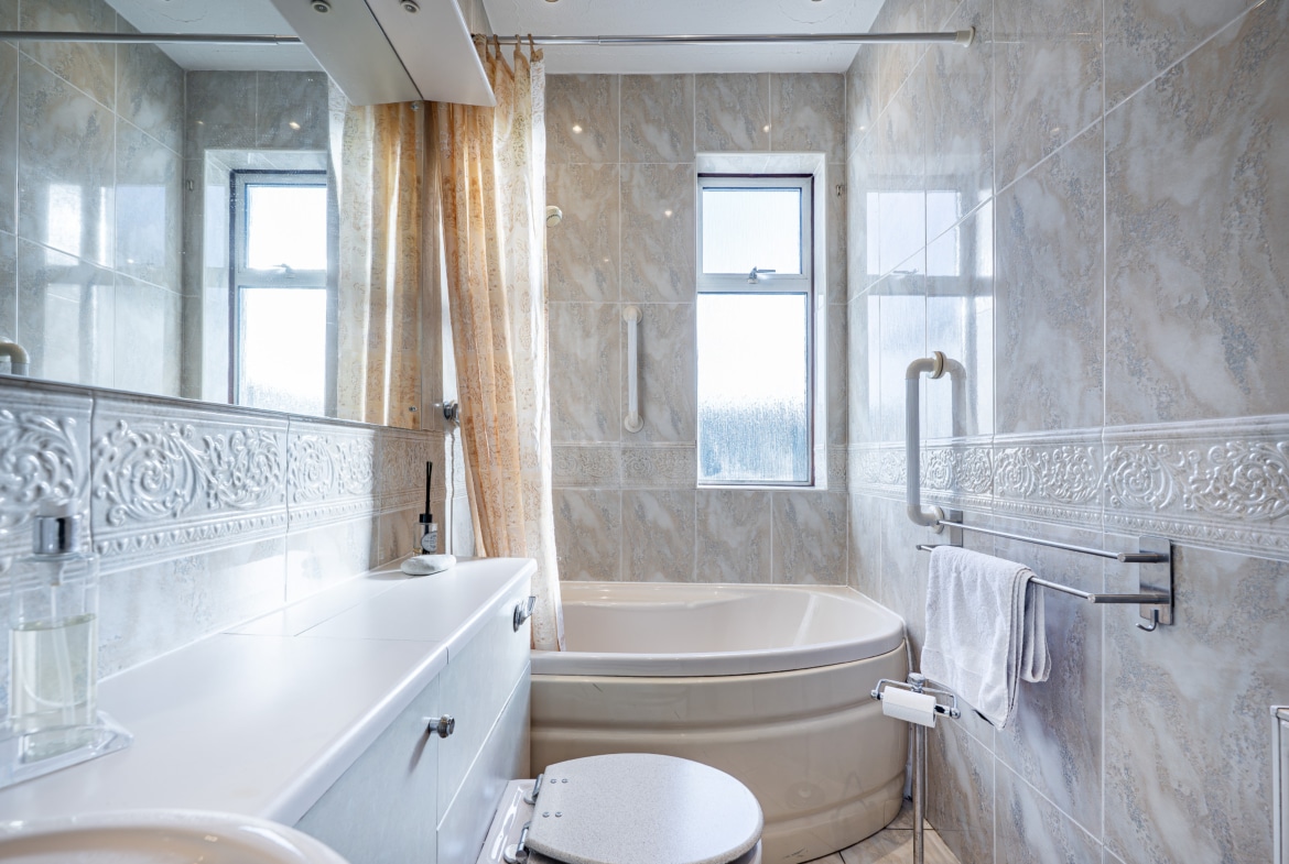 There are two spacious double bedrooms, including a generous principal bedroom with fitted bedroom furniture, and a well-appointed three-piece bathroom completing the internal accommodation.