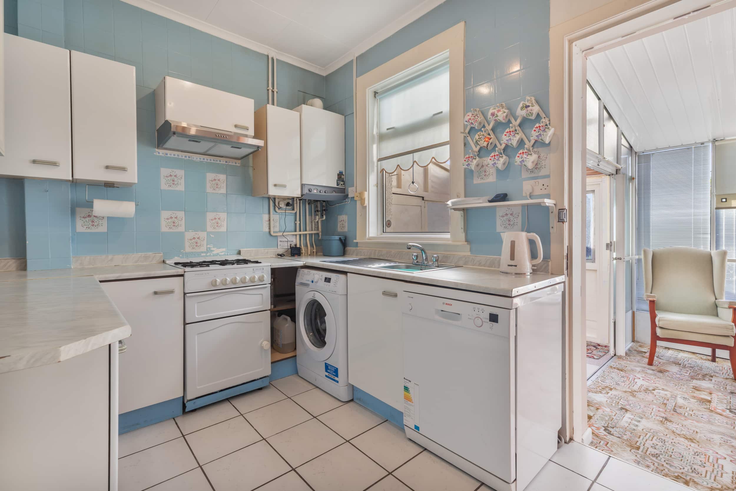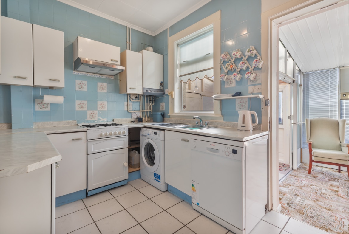 At the end of the hallway is the kitchen, fitted with a range of classic styled cabinets with contrasting work tops, freestanding cooker, washing machine, and dishwasher. A door from the kitchen opens to the conservatory, this is a great addition to the property providing another public room which could be utilised for dining space where views of the rear garden can be enjoyed, alternatively it could be a peaceful sitting room enjoying the south facing position. A rear porch provides additional storage and access to the driveway and garden. Gas central heating and double glazing throughout ensure year-round comfort and efficiency.
