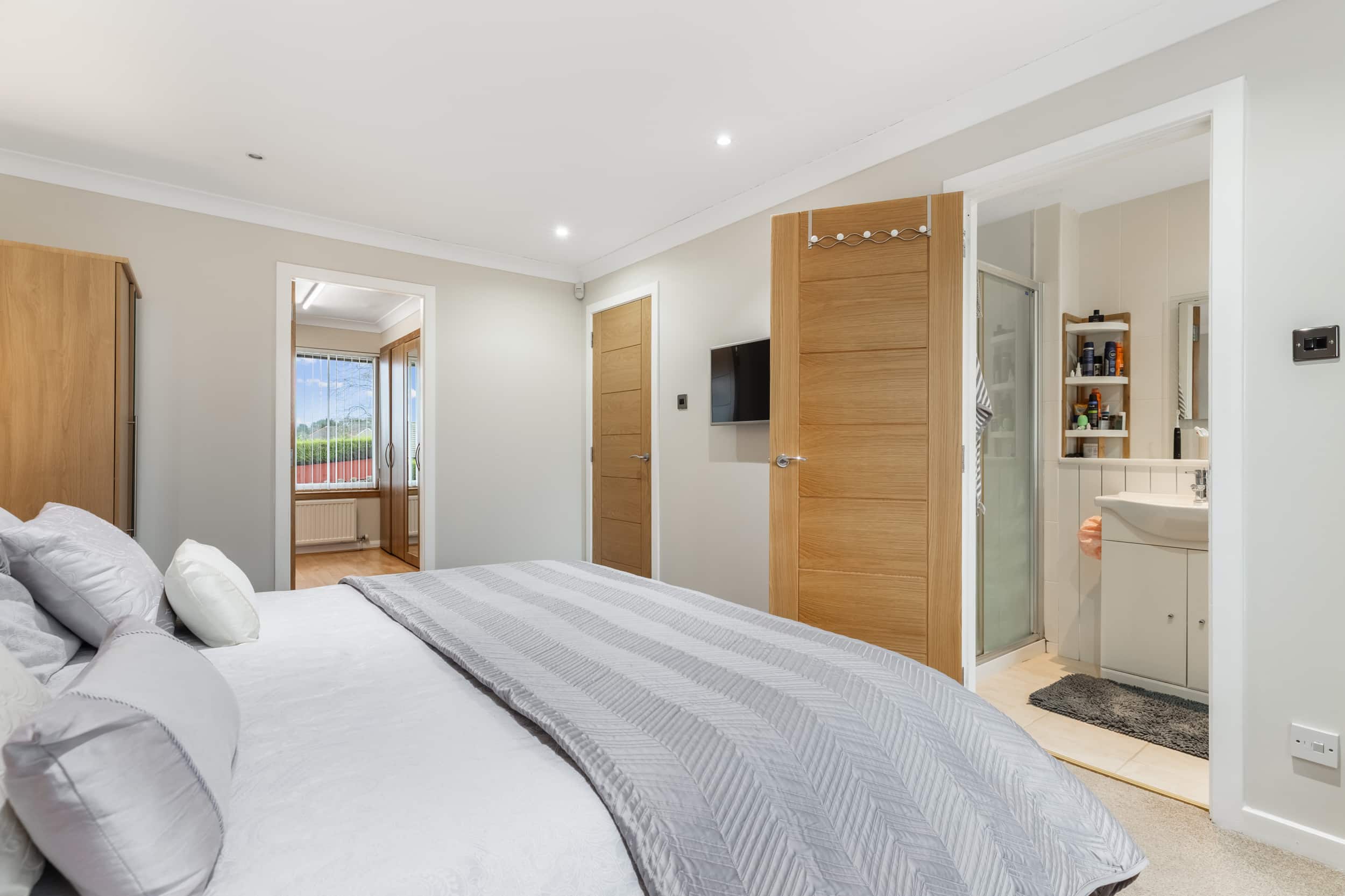 The bedroom accommodation is thoughtfully arranged to provide comfort and privacy. The principal bedroom is a particularly impressive double room, enhanced by a private, fully tiled en-suite shower room and a generous dressing room, offering excellent storage and a luxurious feel. There are two further well-proportioned bedrooms, comprising one double bedroom and one single bedroom, the latter benefiting from double fitted wardrobes (x2). Both rooms are beautifully presented and offer flexible accommodation for family living, guests or home working.