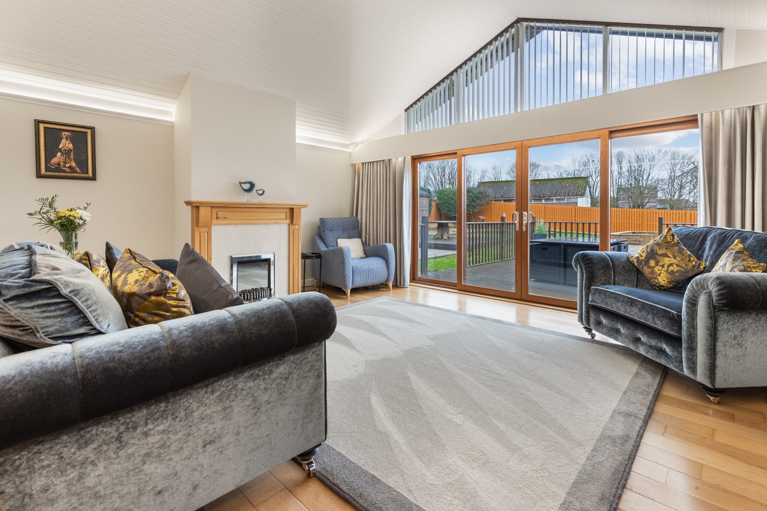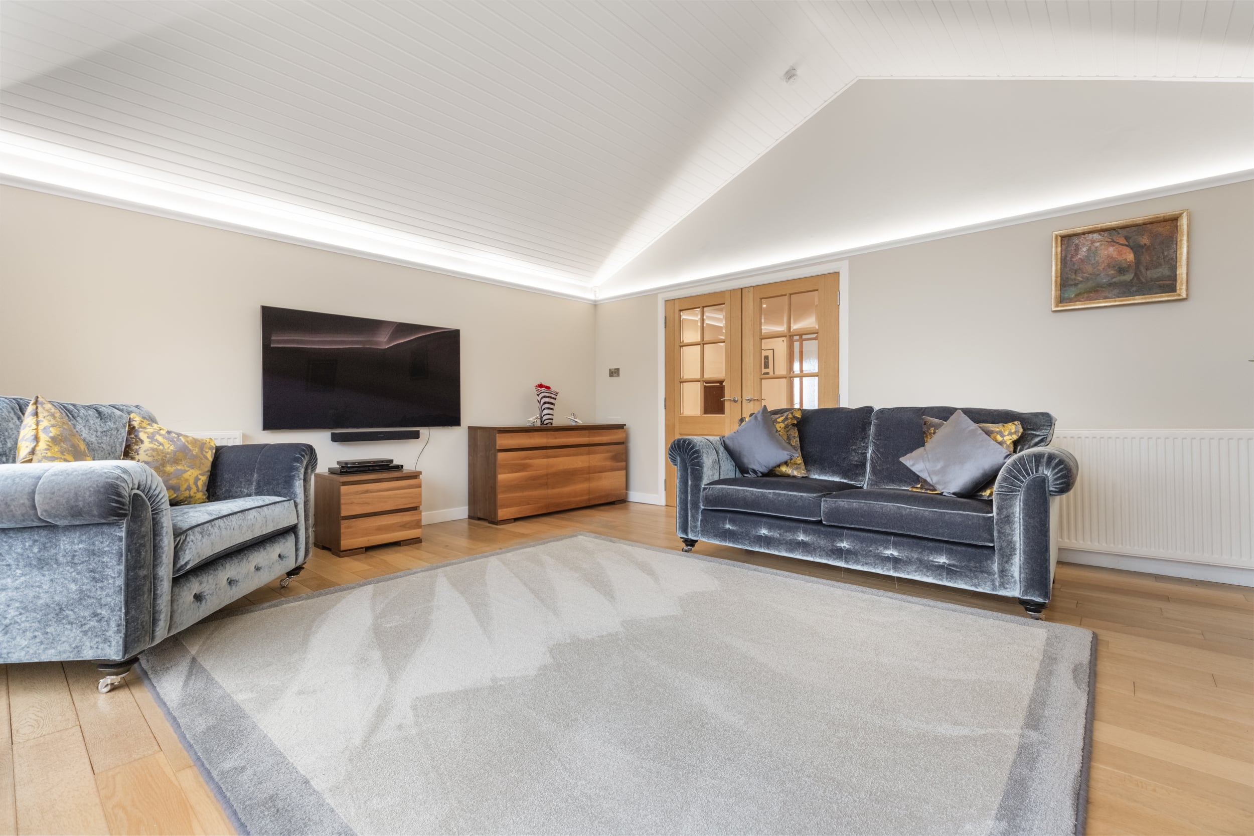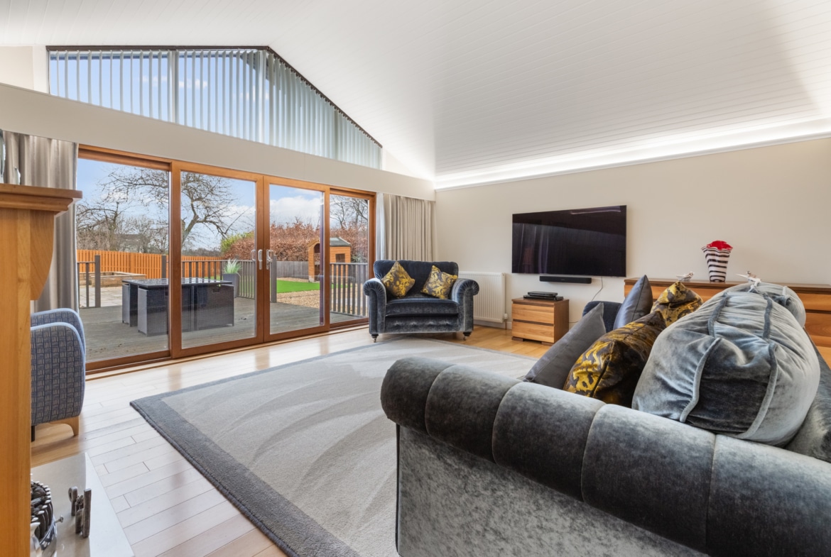 The principal living room is centrally positioned and is an elegant and inviting reception space, featuring a fireplace and perimeter shadow-gap lighting. This generously proportioned room enjoys a wide set of timber-framed glazed patio doors opening onto the garden, complemented by full-height glass panels and a striking band of clerestory glazing above, which together flood the room with natural light. The room offers ample space for a full range of furniture and provides an ideal setting for both relaxed family living and more formal entertaining.
