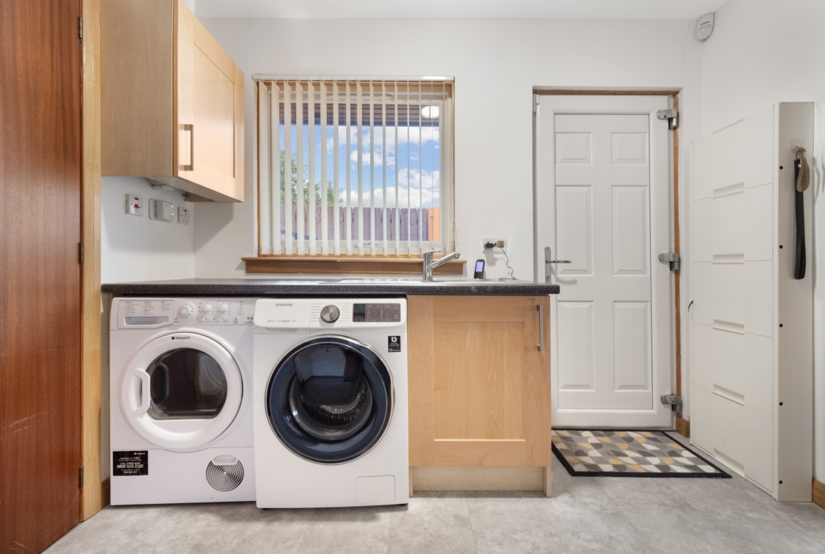 A door from the kitchen area leads to a well-equipped utility room, providing additional storage and workspace, along with space for a freestanding fridge freezer, washing machine and tumble dryer. The utility room also offers internal access to the integral garage, adding a high level of practicality and convenience.