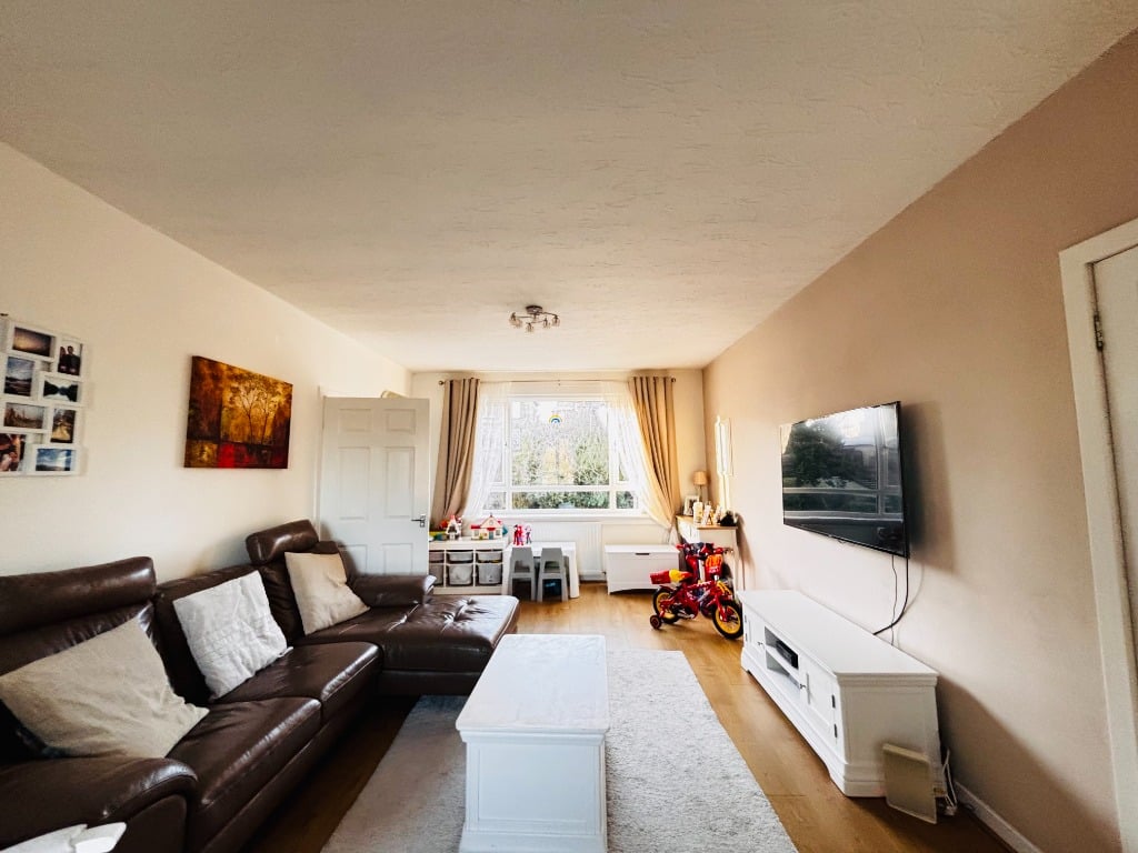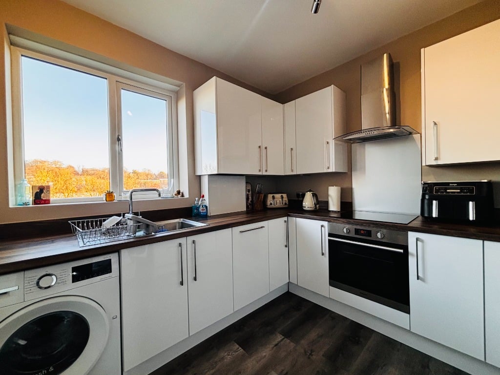 Internal accommodation comprises entrance hallway with storage cupboards off, large, and bright living area with dining area to the rear, fully fitted modern kitchen with a range of appliances. There are two spacious double bedrooms, and bathroom with three-piece suite and shower positioned over bath.