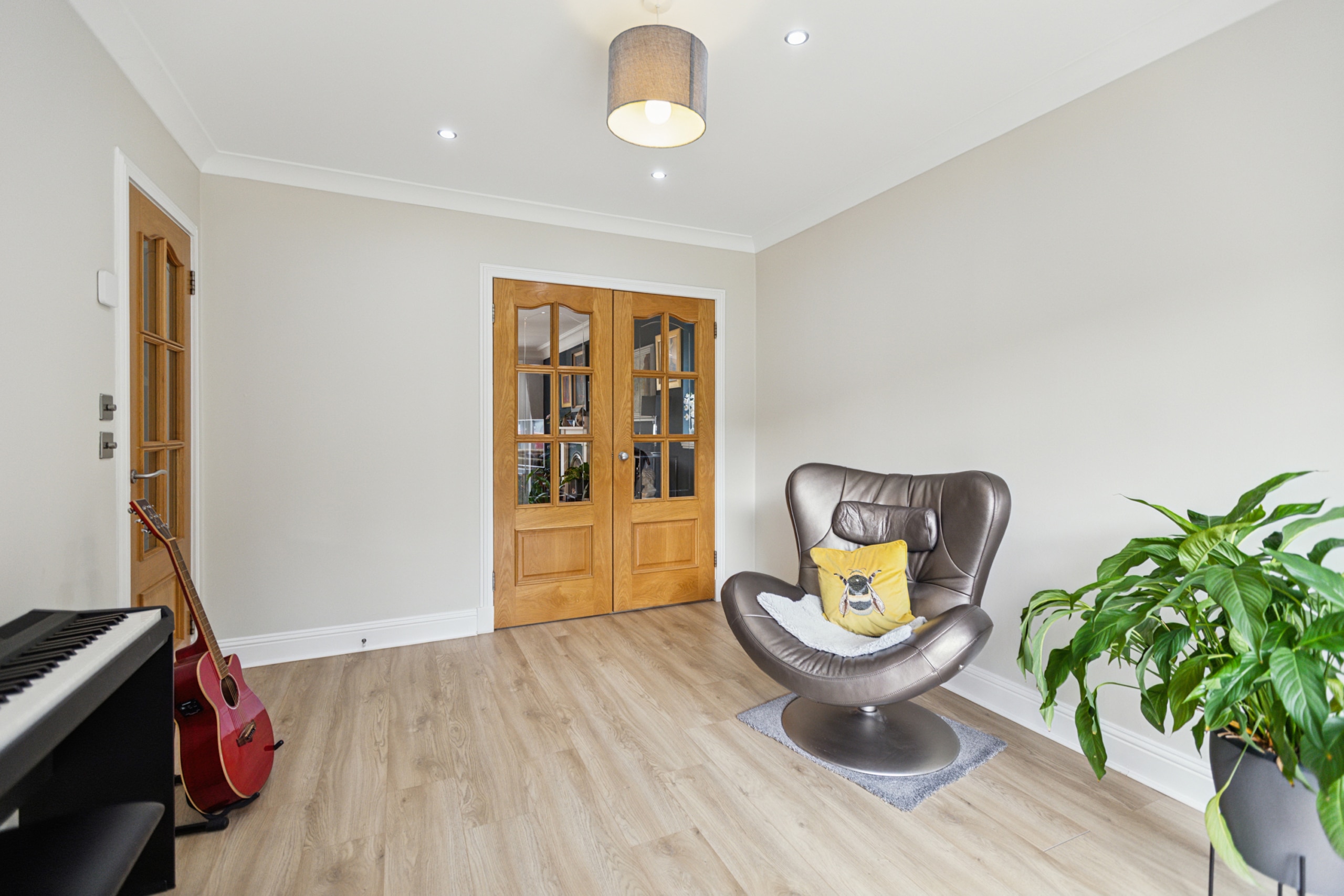 The accommodation begins with a welcoming entrance hallway, giving access to the integral garage, a useful under stairs cupboard, guest WC, and the ground-floor apartments. To the front, a striking formal lounge features a broad box bay window and a fireplace detail as its focal point. An adjoining open study area flows seamlessly into the elegant dining room, where French doors open directly onto the rear garden. The adjacent kitchen is superbly appointed, fitted with a comprehensive range of wall and base units, a breakfasting bar, integral double oven, gas hob, microwave, and dishwasher, while still providing ample space for informal dining. A separate utility room offers further storage, plumbing for laundry appliances, and direct access to the side of the property.