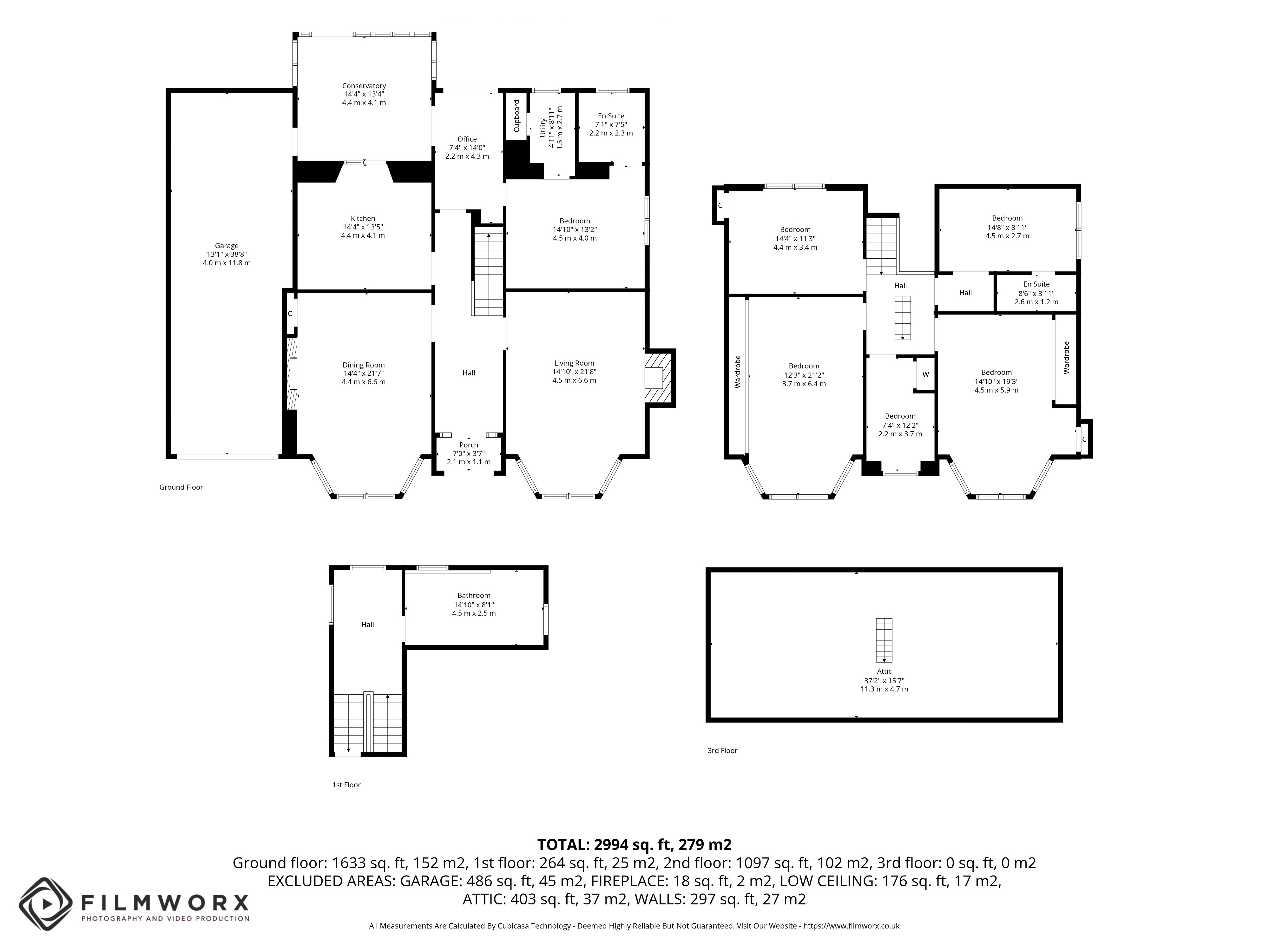 On the upper level, a spacious double-aspect half landing, offering excellent potential as a relaxing seating area or study, leads to a luxurious family bathroom fitted with a five-piece suite. The main landing provides access to four generous double bedrooms, two of which feature bay windows, along with a fifth single bedroom. One bedroom benefits from the convenience of an en-suite shower room. There is also a hatch with a pull-down ladder providing access to a substantial floored attic, which offers further development potential, subject to the necessary consents.