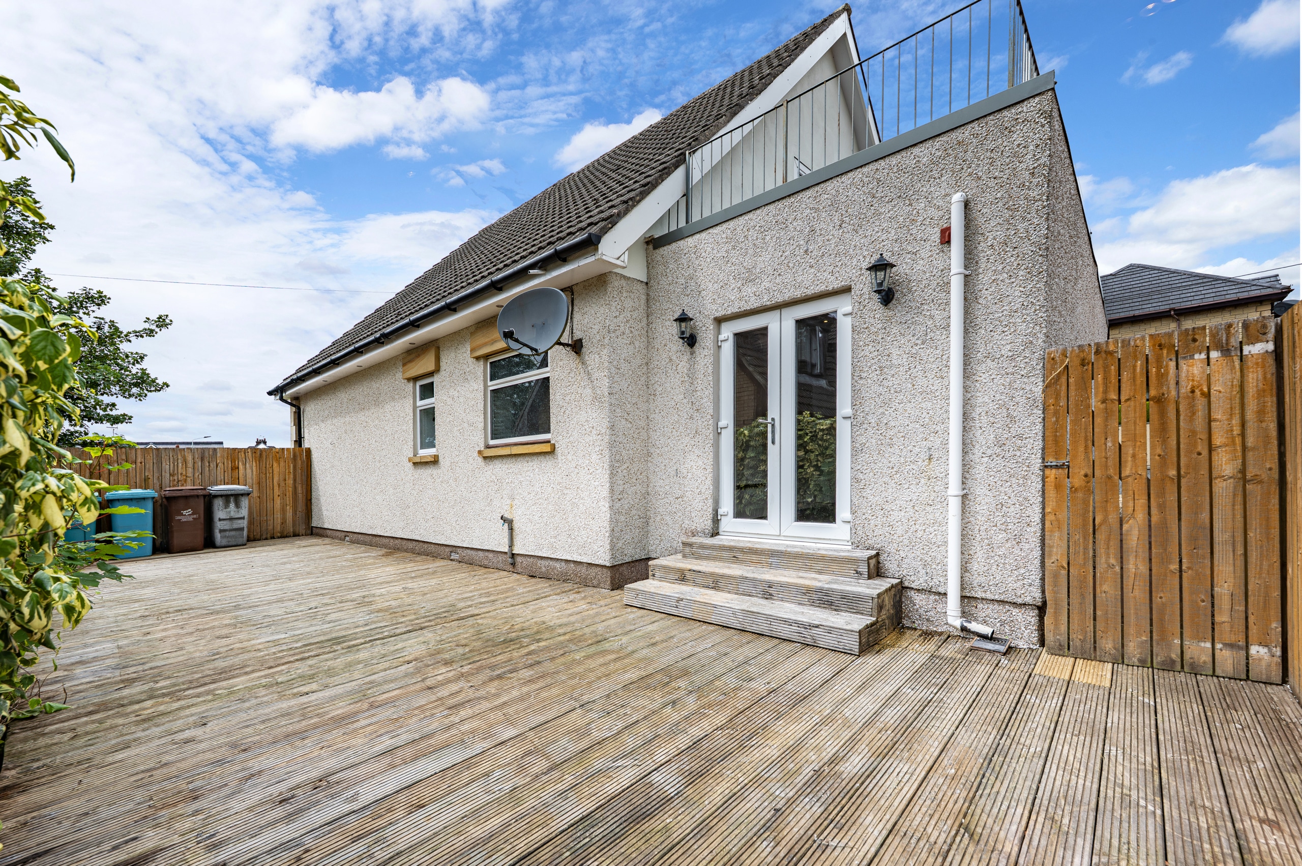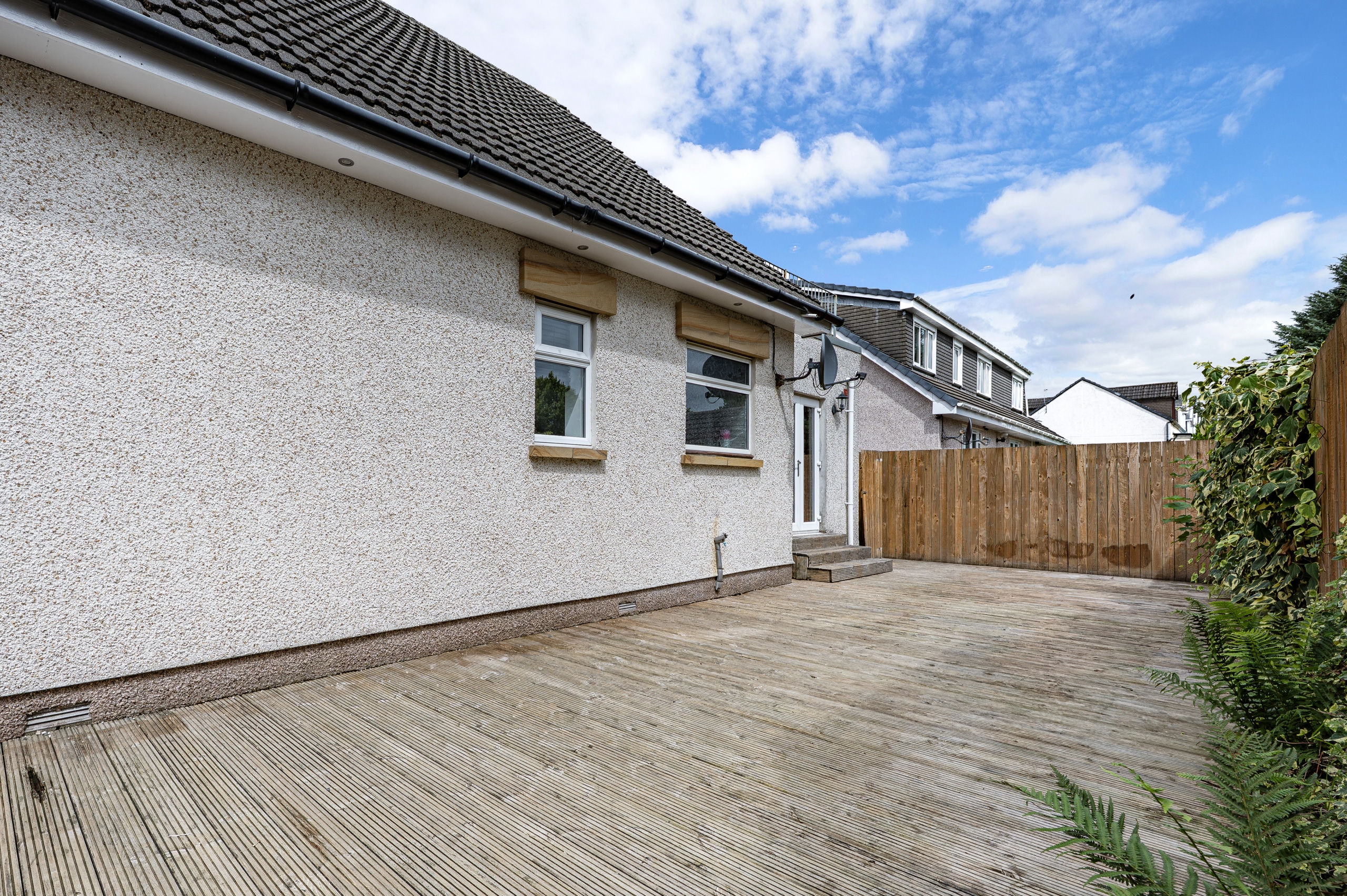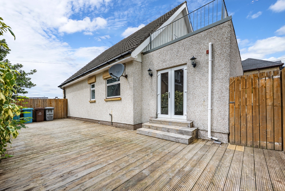 The house is set on an attractive level plot with a mixture of lawn and decked seating areas. There is a driveway at the side of the house.