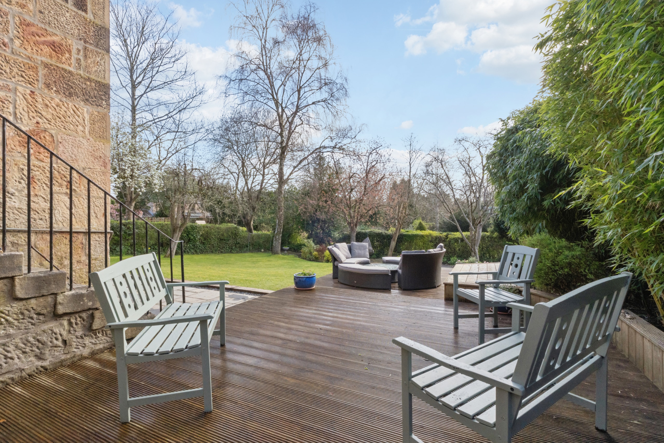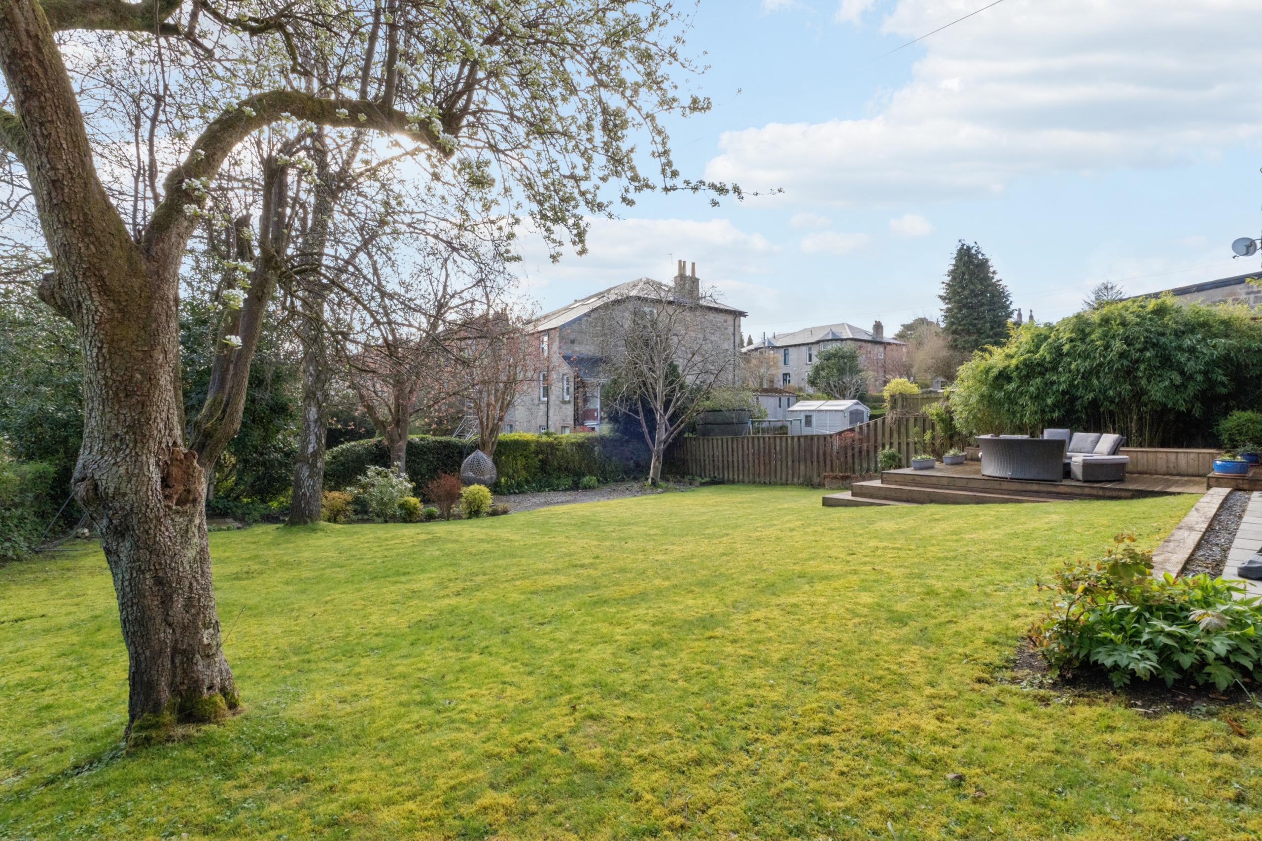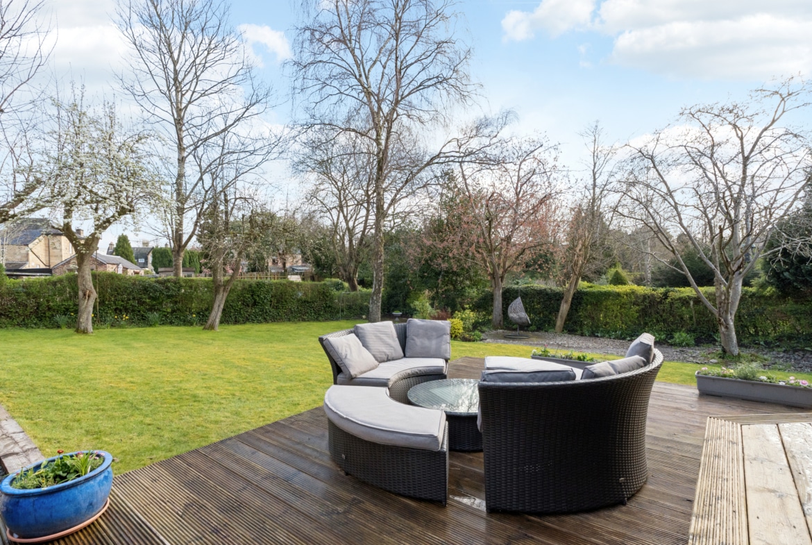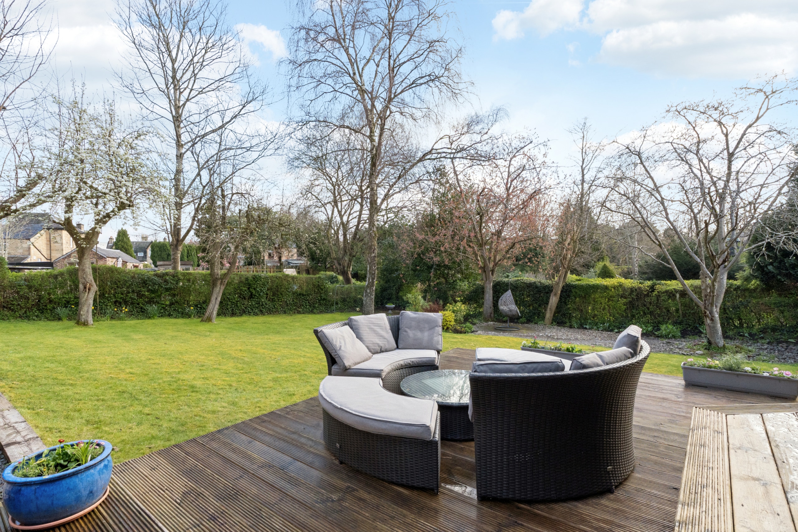 Externally, the property is set within generous and private garden grounds. The rear garden is particularly appealing, offering a secluded setting with mature tree screening, a well-maintained lawn, and a substantial split-level decking area ideally suited to family living and entertaining. A substantial main basement, complete with power and lighting, provides excellent storage and is further complemented by an additional separate basement area. An attached double garage offers further practicality, with front access, rear door to the garden, internal lighting and power, as well as an electric vehicle charging point.