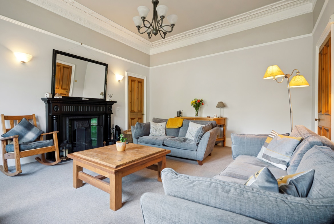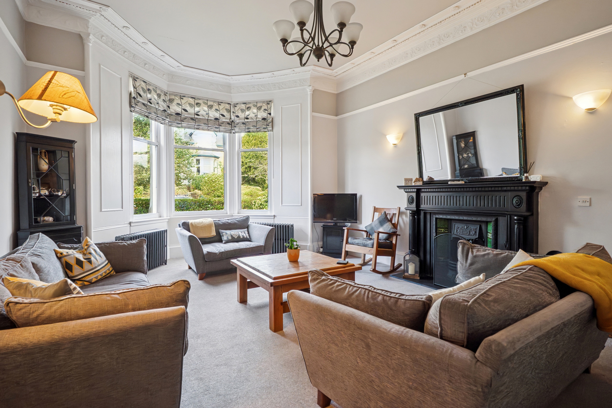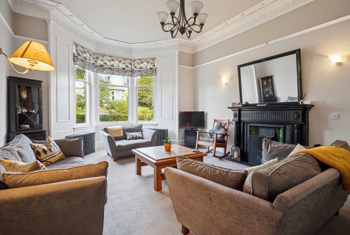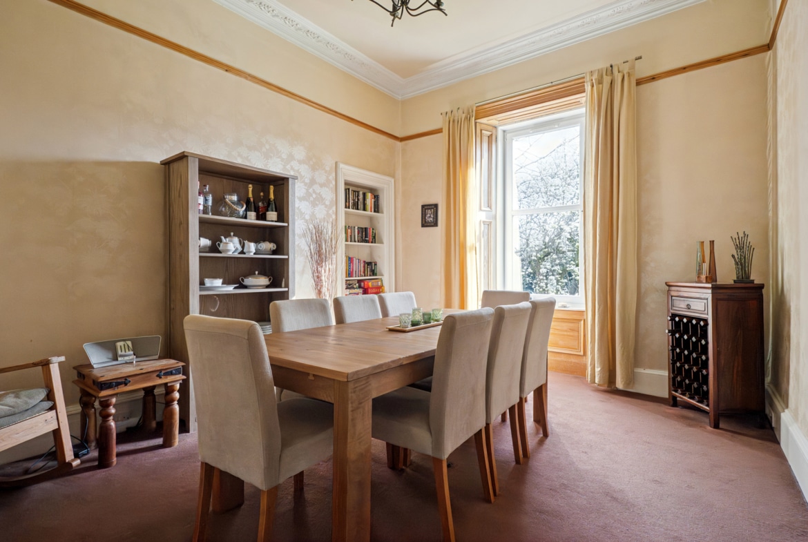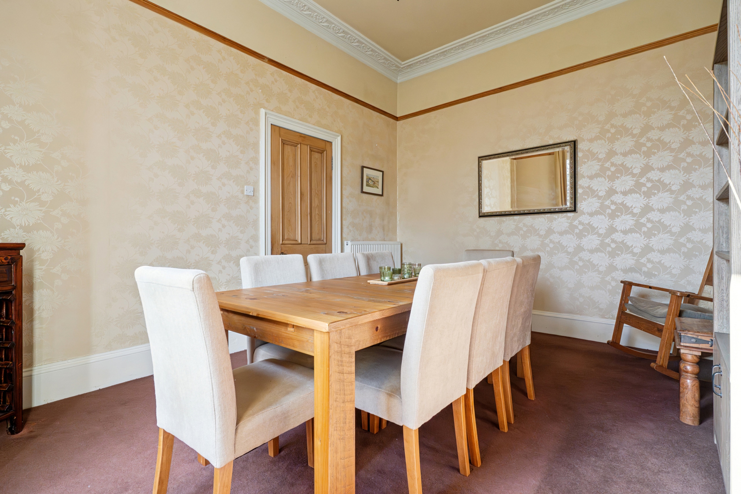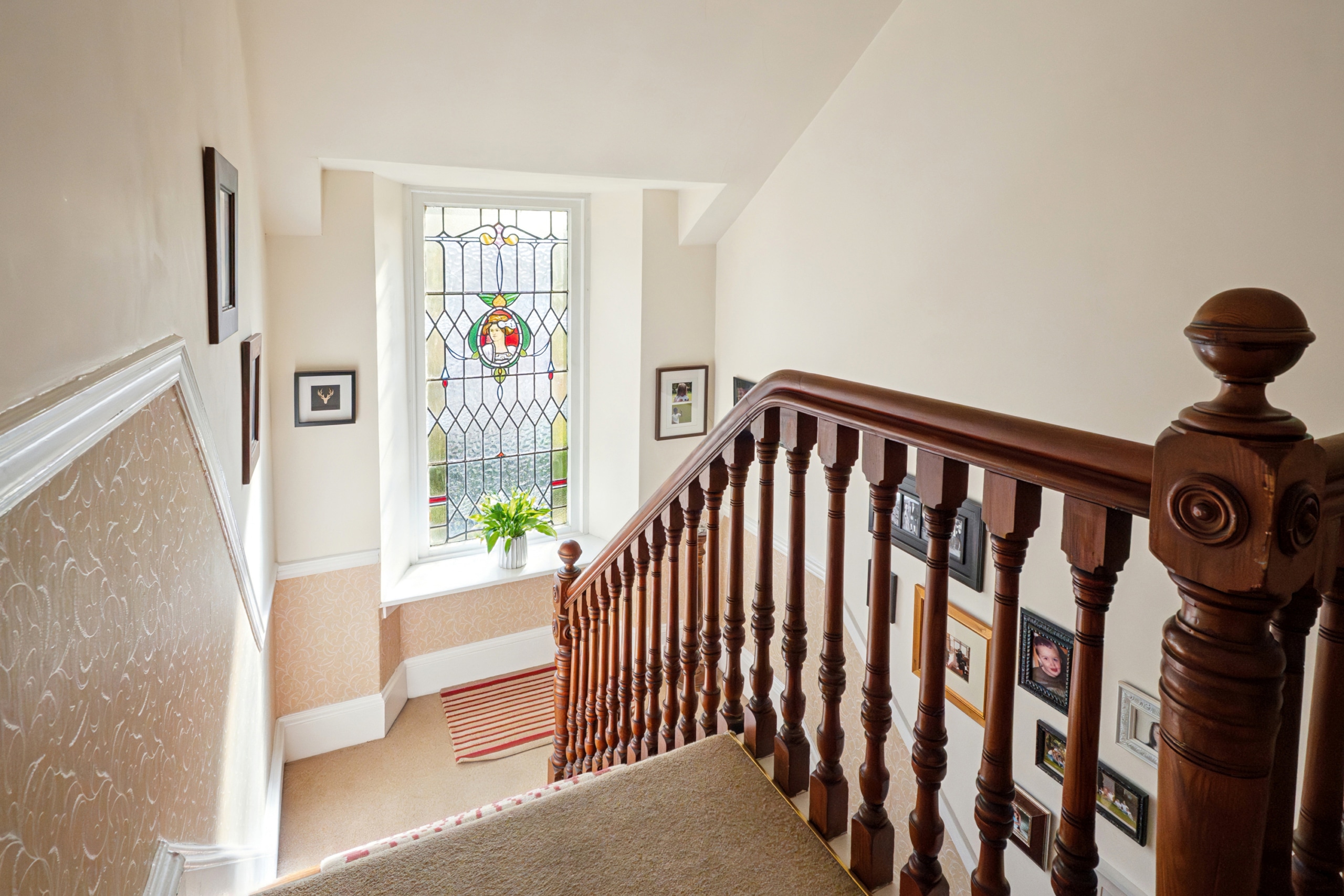 The internal layout comprises a welcoming entrance vestibule leading to a broad and elegant reception hallway, complete with storage and a staircase rising to the upper level. The principal lounge is an impressive bay-windowed apartment, rich in period detail and featuring an open fireplace, while a separate front-facing sitting room offers additional flexibility. To the rear, a generously proportioned dining room enjoys pleasant views over the garden. The breakfasting kitchen is particularly well equipped, incorporating a range of Bosch appliances including a double oven, induction hob, dishwasher and fridge freezer, and flows through to a large utility room with direct garden access. A contemporary shower room completes the ground floor accommodation, while a striking stained-glass window provides a focal point at half-landing level.