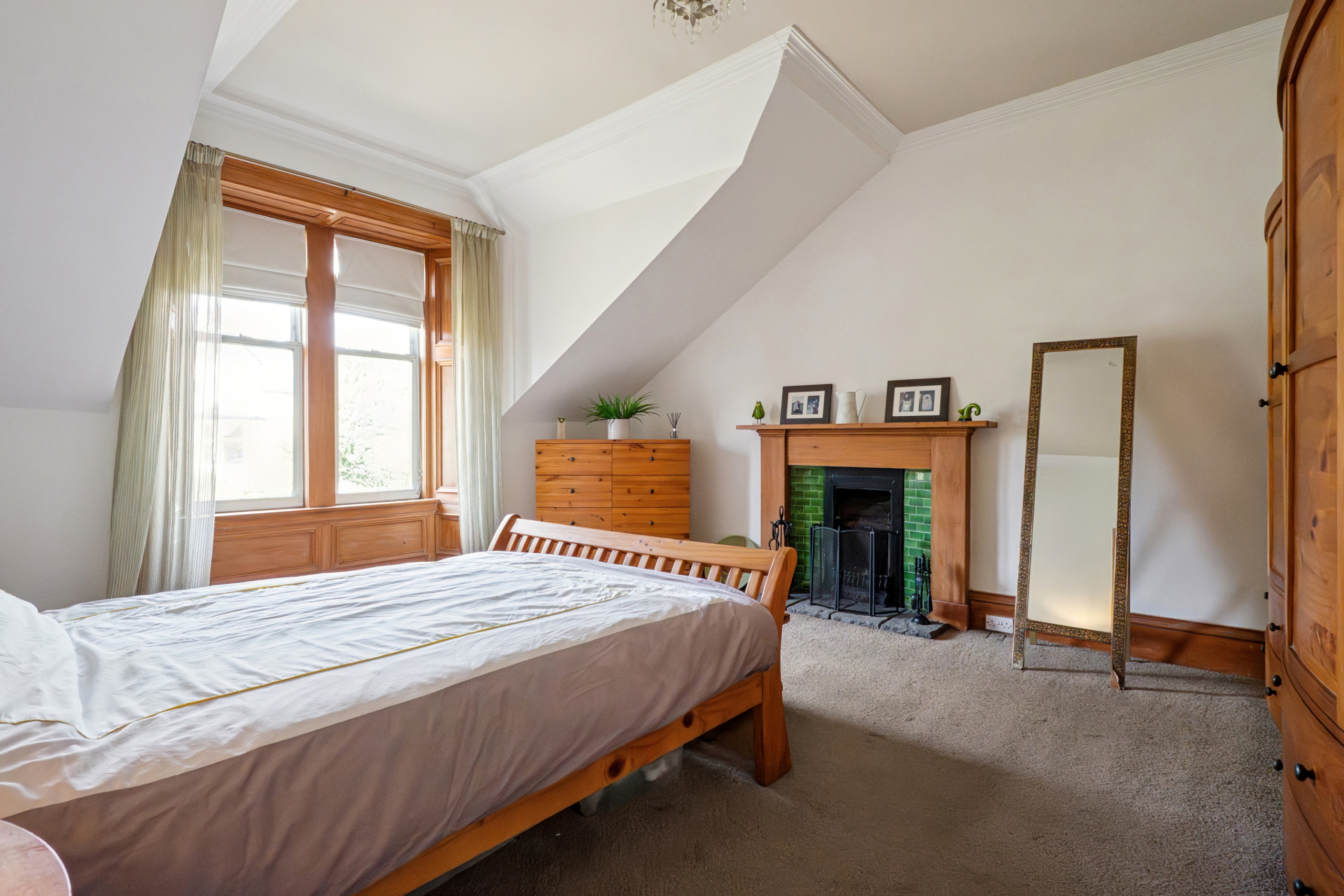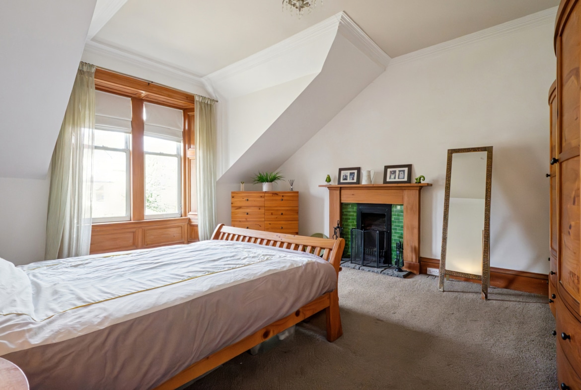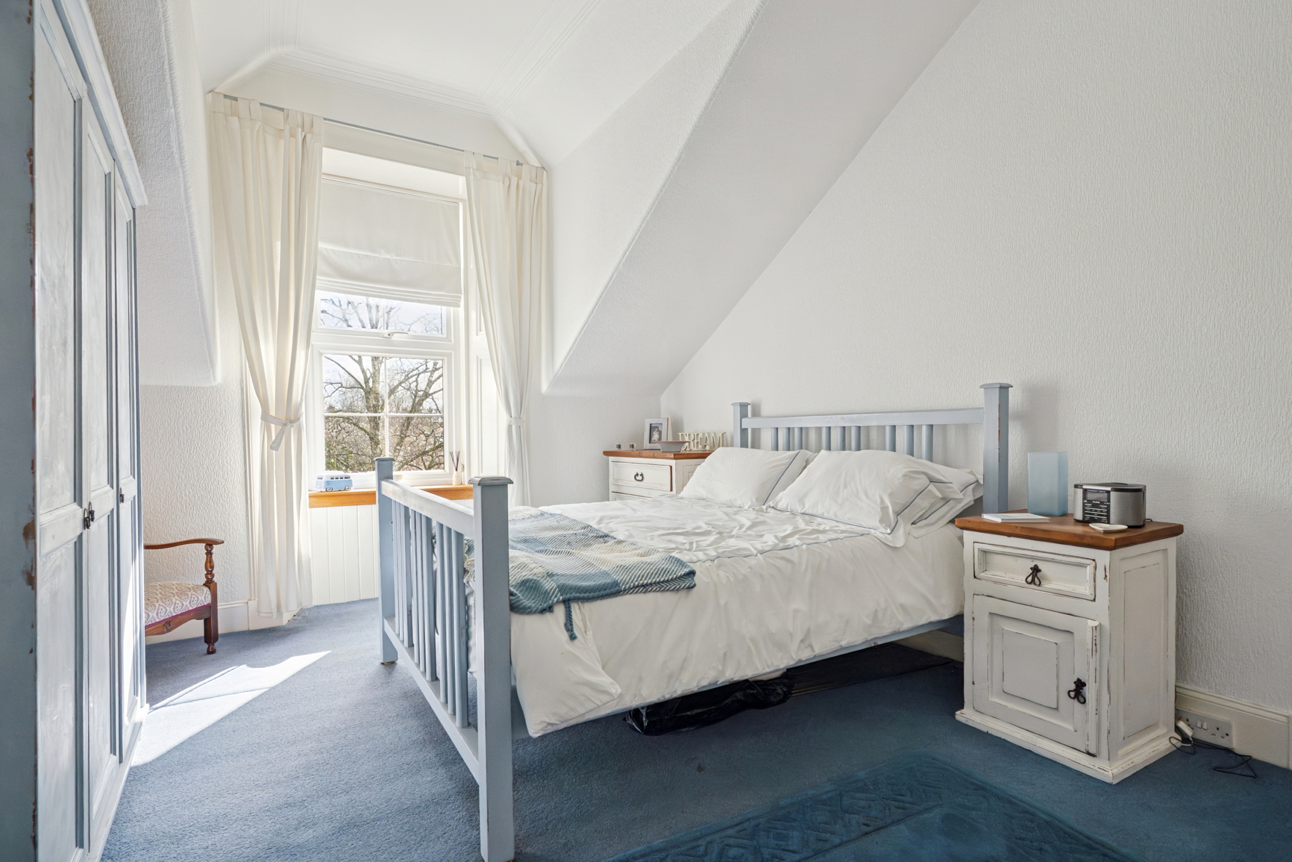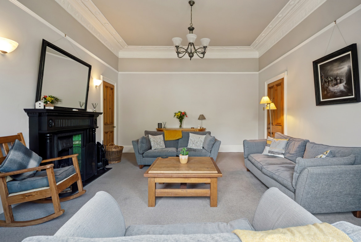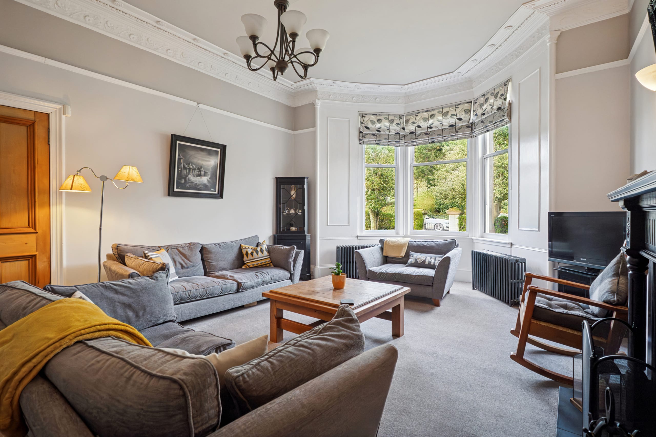 The internal layout comprises a welcoming entrance vestibule leading to a broad and elegant reception hallway, complete with storage and a staircase rising to the upper level. The principal lounge is an impressive bay-windowed apartment, rich in period detail and featuring an open fireplace, while a separate front-facing sitting room offers additional flexibility. To the rear, a generously proportioned dining room enjoys pleasant views over the garden. The breakfasting kitchen is particularly well equipped, incorporating a range of Bosch appliances including a double oven, induction hob, dishwasher and fridge freezer, and flows through to a large utility room with direct garden access. A contemporary shower room completes the ground floor accommodation, while a striking stained-glass window provides a focal point at half-landing level.