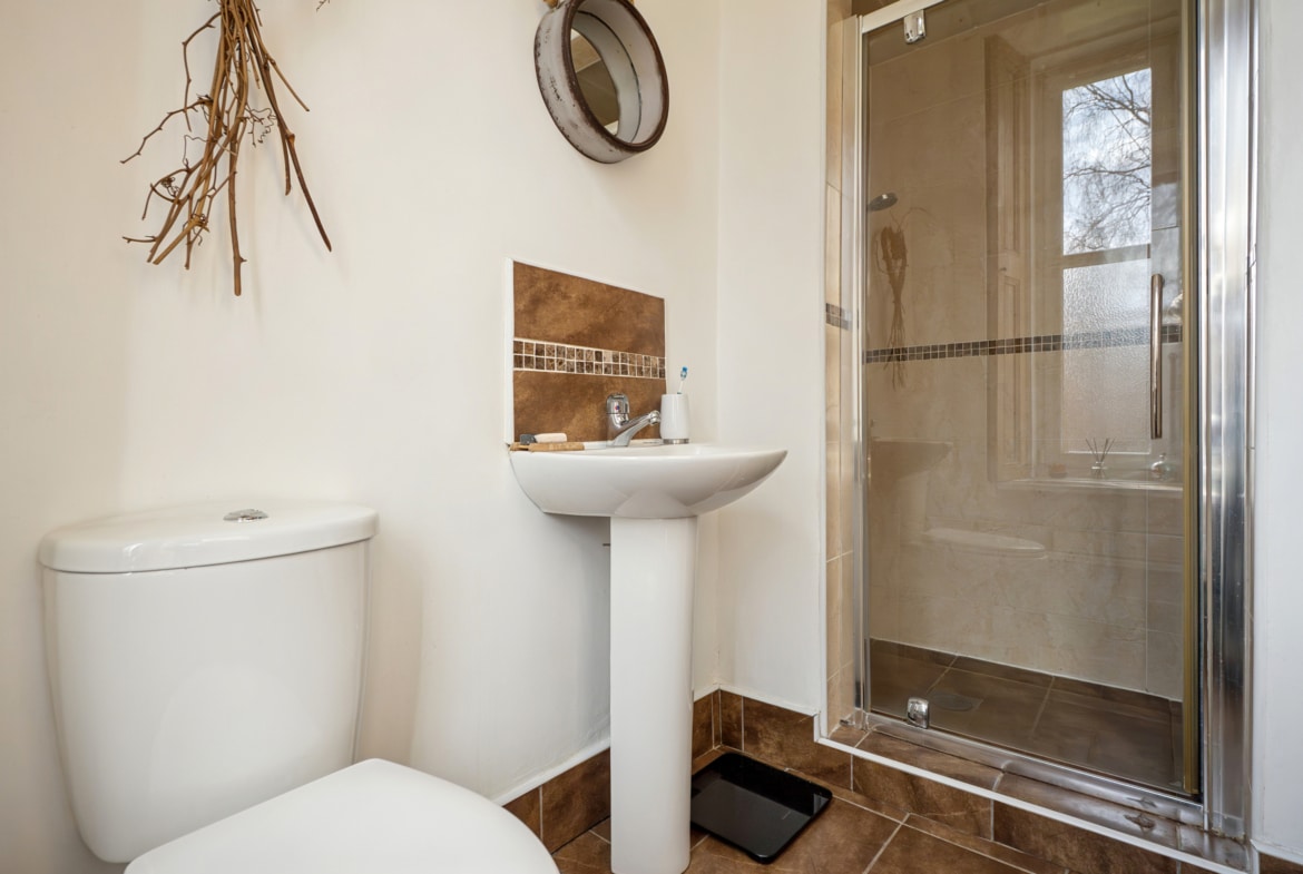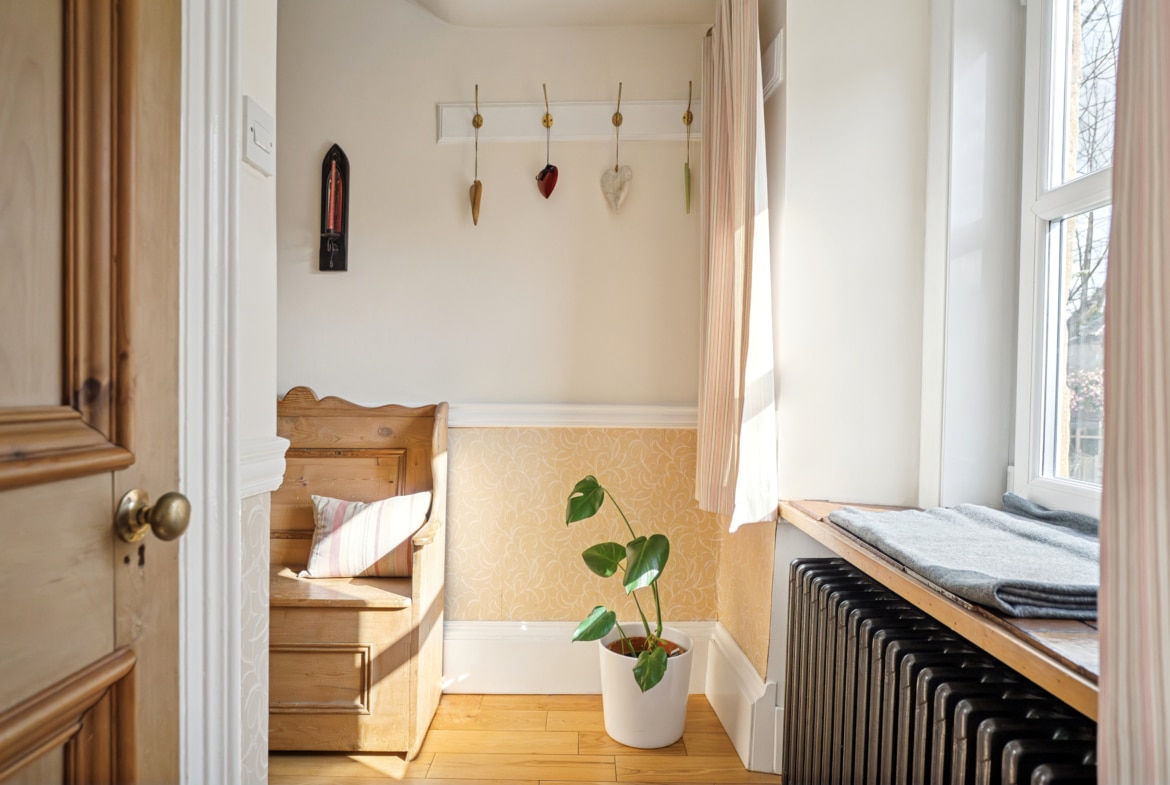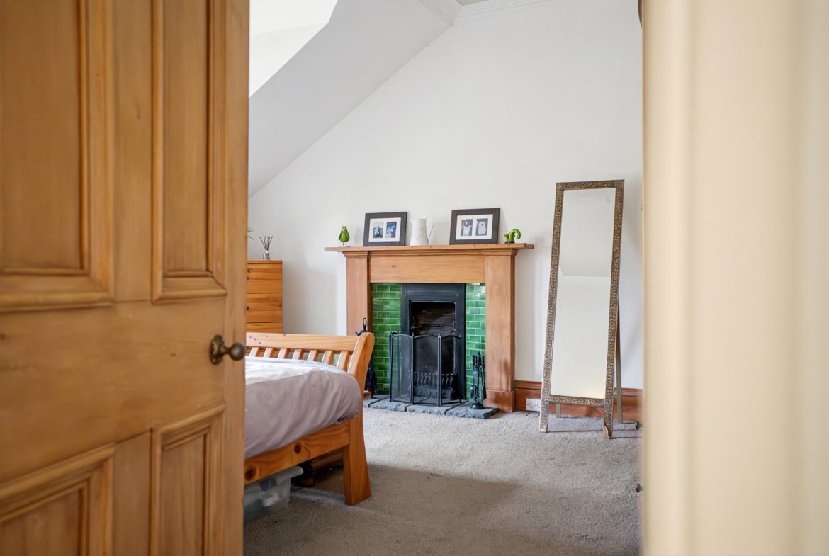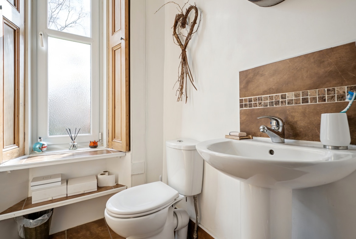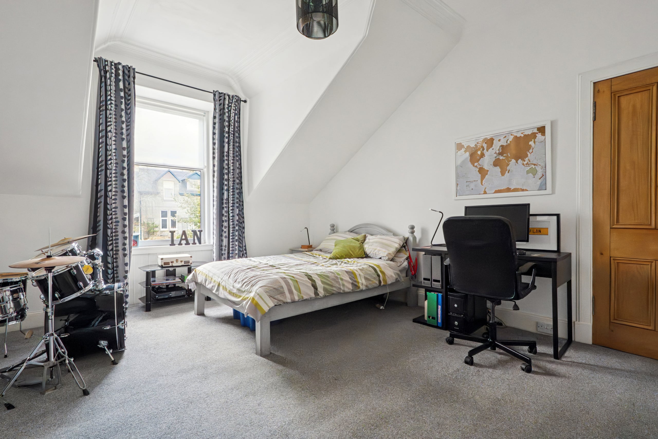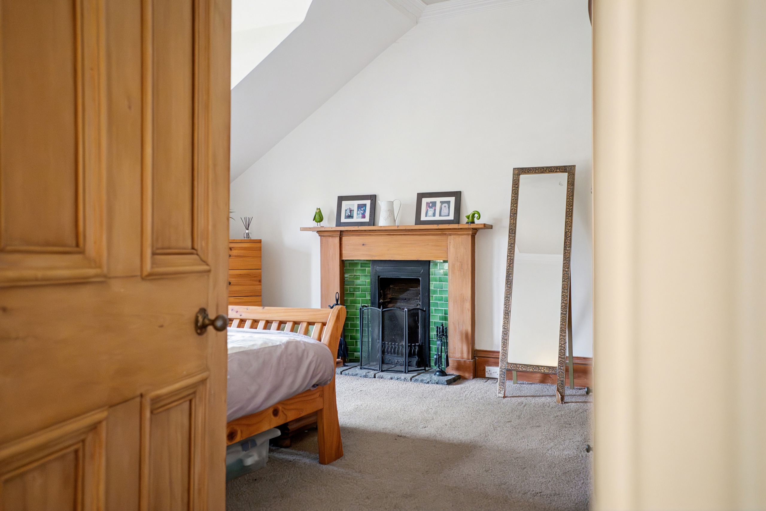 The internal layout comprises a welcoming entrance vestibule leading to a broad and elegant reception hallway, complete with storage and a staircase rising to the upper level. The principal lounge is an impressive bay-windowed apartment, rich in period detail and featuring an open fireplace, while a separate front-facing sitting room offers additional flexibility. To the rear, a generously proportioned dining room enjoys pleasant views over the garden. The breakfasting kitchen is particularly well equipped, incorporating a range of Bosch appliances including a double oven, induction hob, dishwasher and fridge freezer, and flows through to a large utility room with direct garden access. A contemporary shower room completes the ground floor accommodation, while a striking stained-glass window provides a focal point at half-landing level.