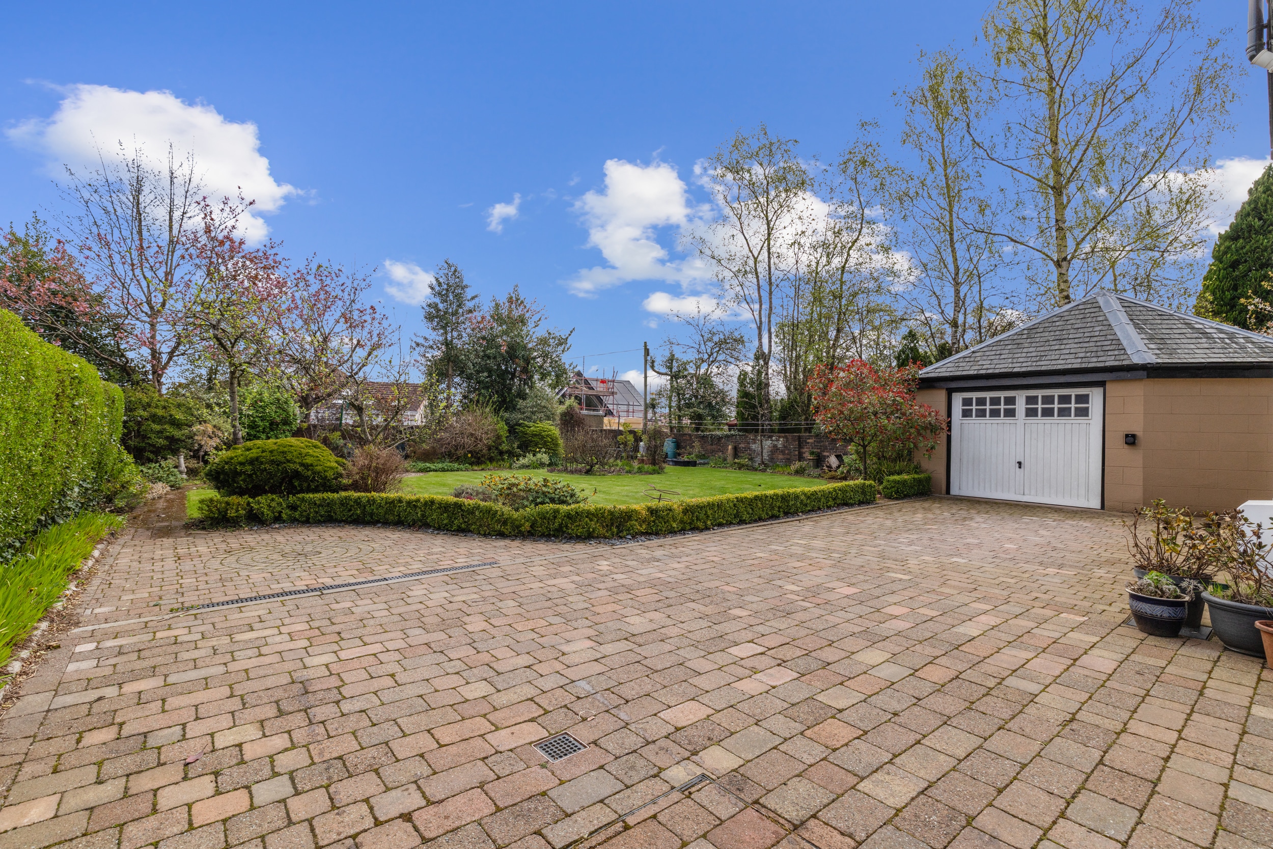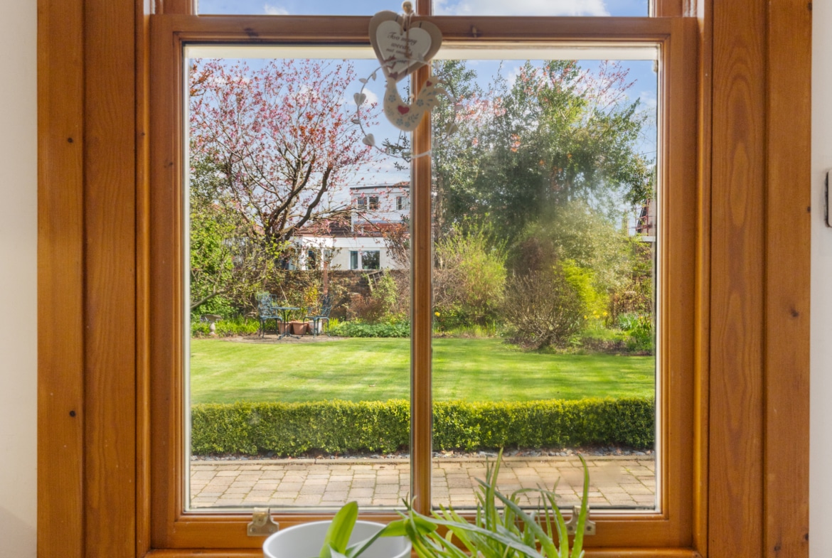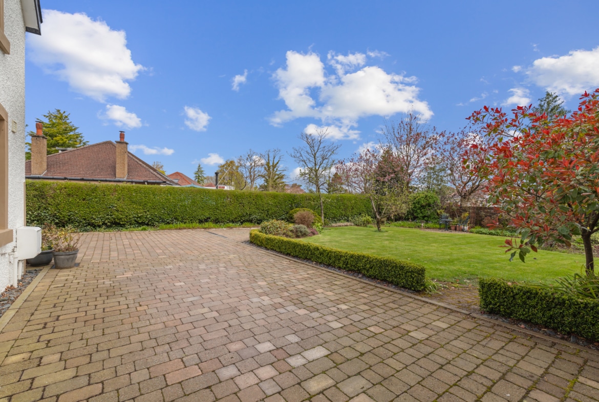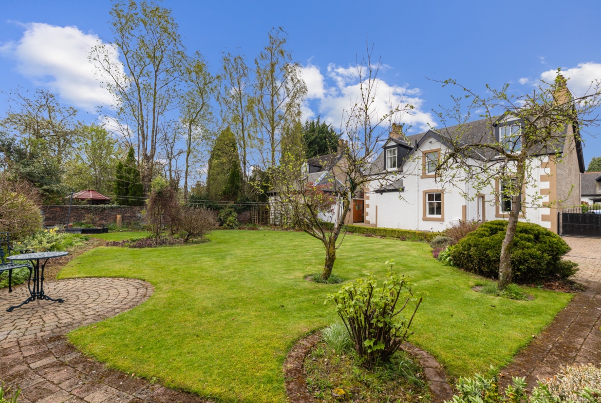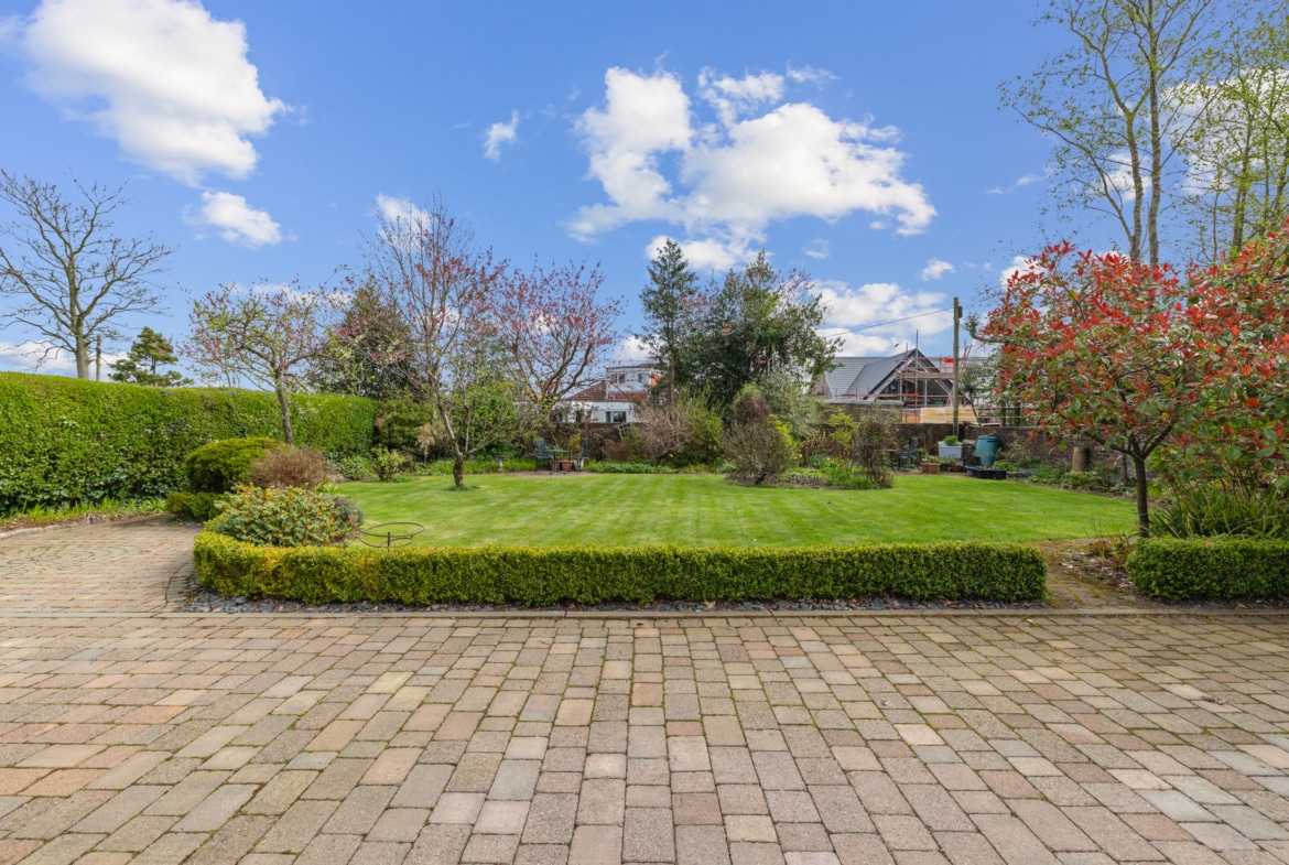 The property is set on an attractive level plot, with well established boundary walls and hedges. There are well maintained gardens to the front with a driveway leading beyond the house to a garage at the rear. The rear gardens offer a well-considered selection of seating areas, lawn and planting.