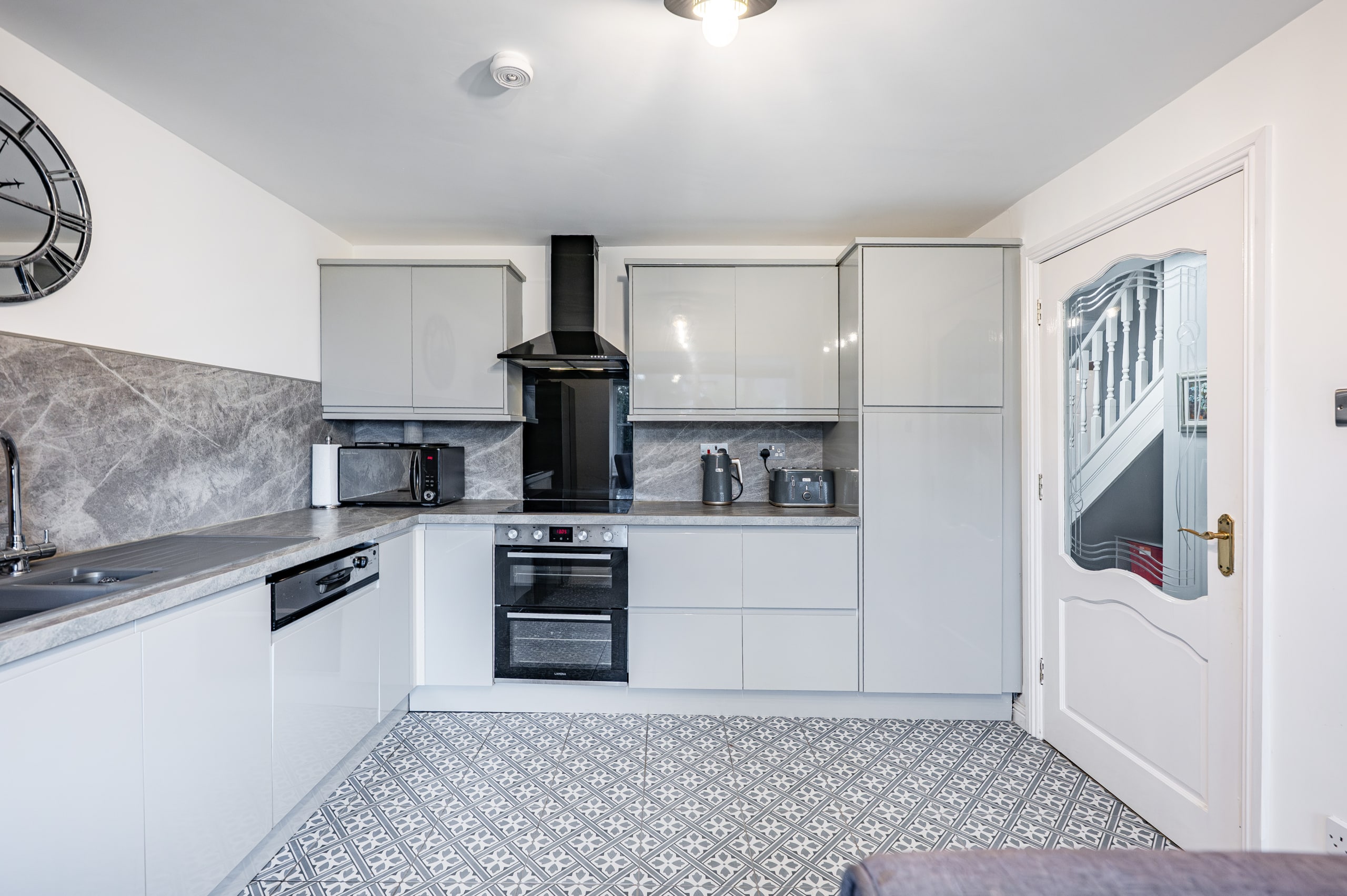 The ground floor opens with a welcoming reception hallway, featuring a guest W.C. and staircase to the upper levels. The lounge provides an outstanding living space, complete with a feature fireplace, a front-facing box bay window, and French doors opening directly to the rear gardens. A formal dining room lies to the front, seamlessly connecting to the striking kitchen. Designed with both style and function in mind, the kitchen offers a sleek range of wall and base units, integrated appliances, and a second box bay window framing views of the rear garden. The adjoining utility room provides additional storage and convenient garden access.