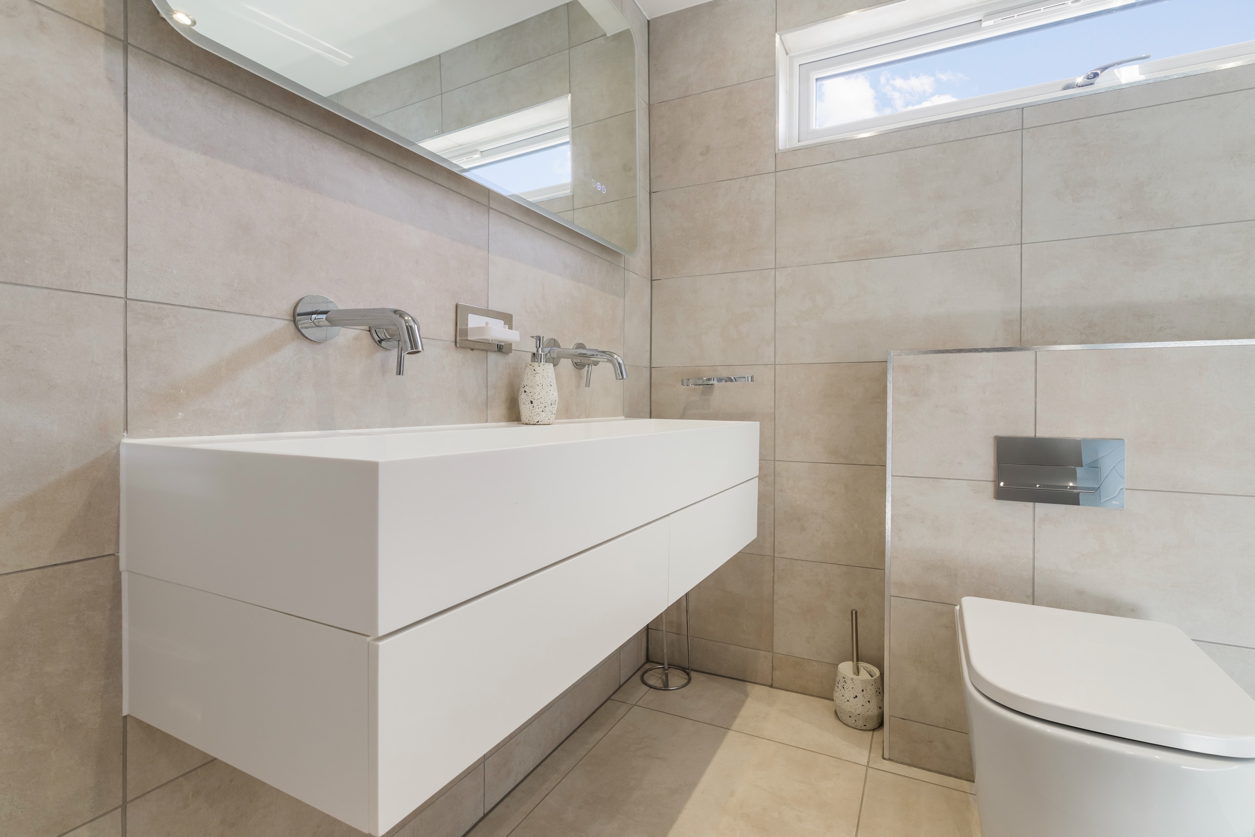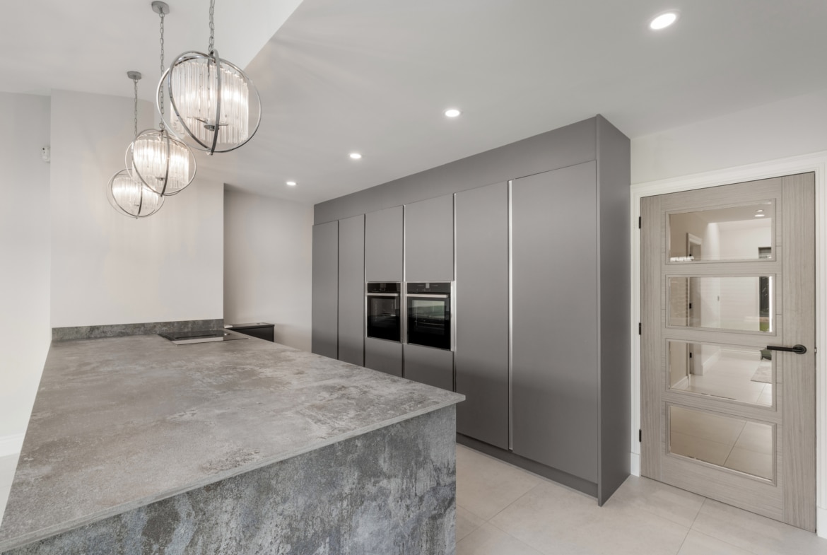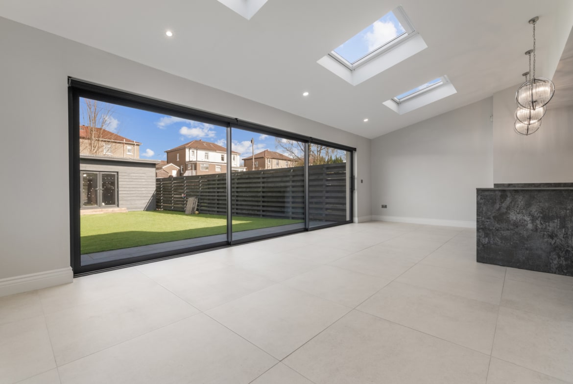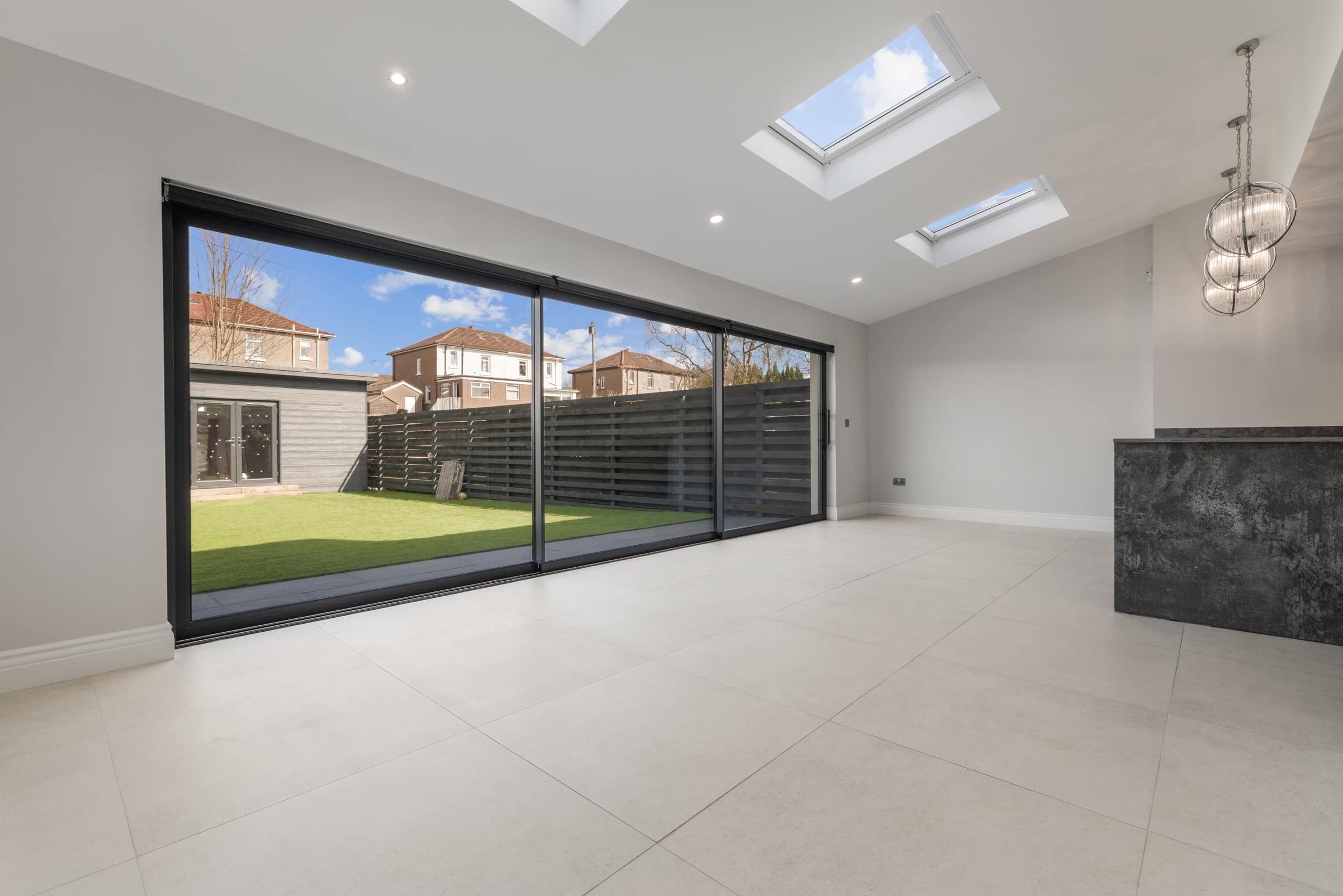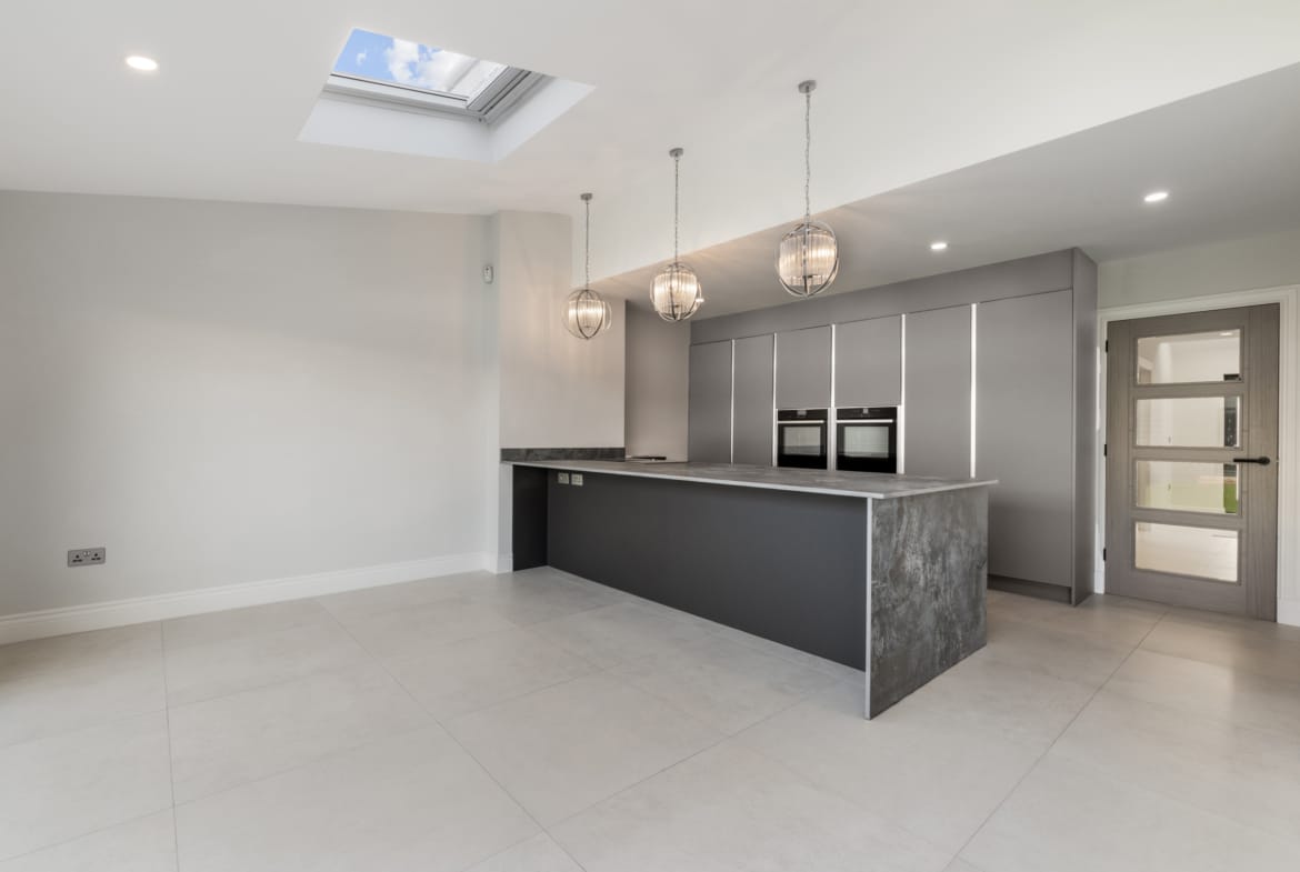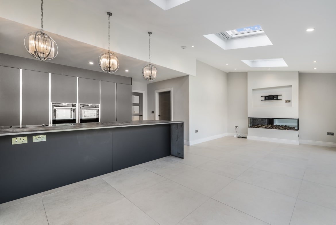 A sleek contemporary kitchen has a range of quality integrated appliances, while a long breakfast bar ensures it feels part of the social space. The rest of the room offers plenty of space for lounge and dining suites within the kind of bright open plan space most families so desperately desire. Sliding glass doors allow this space to flow out to the gardens beyond.