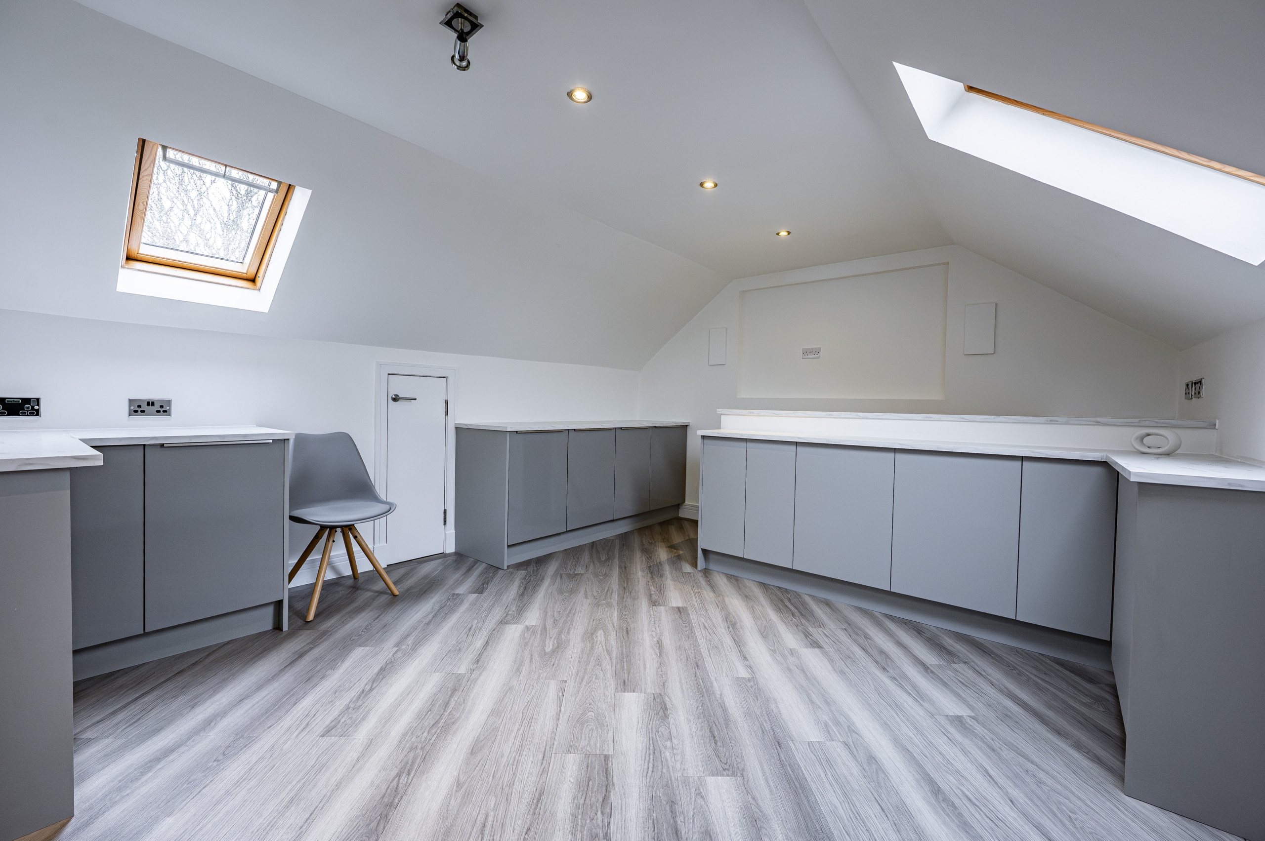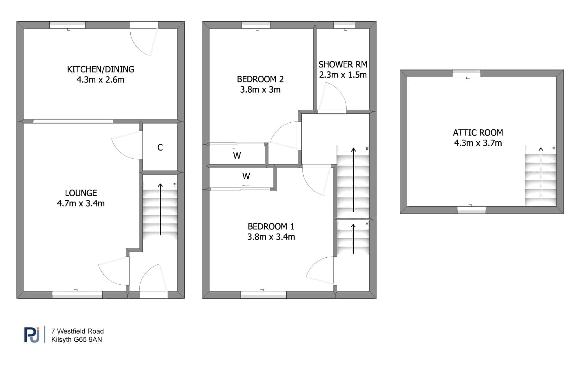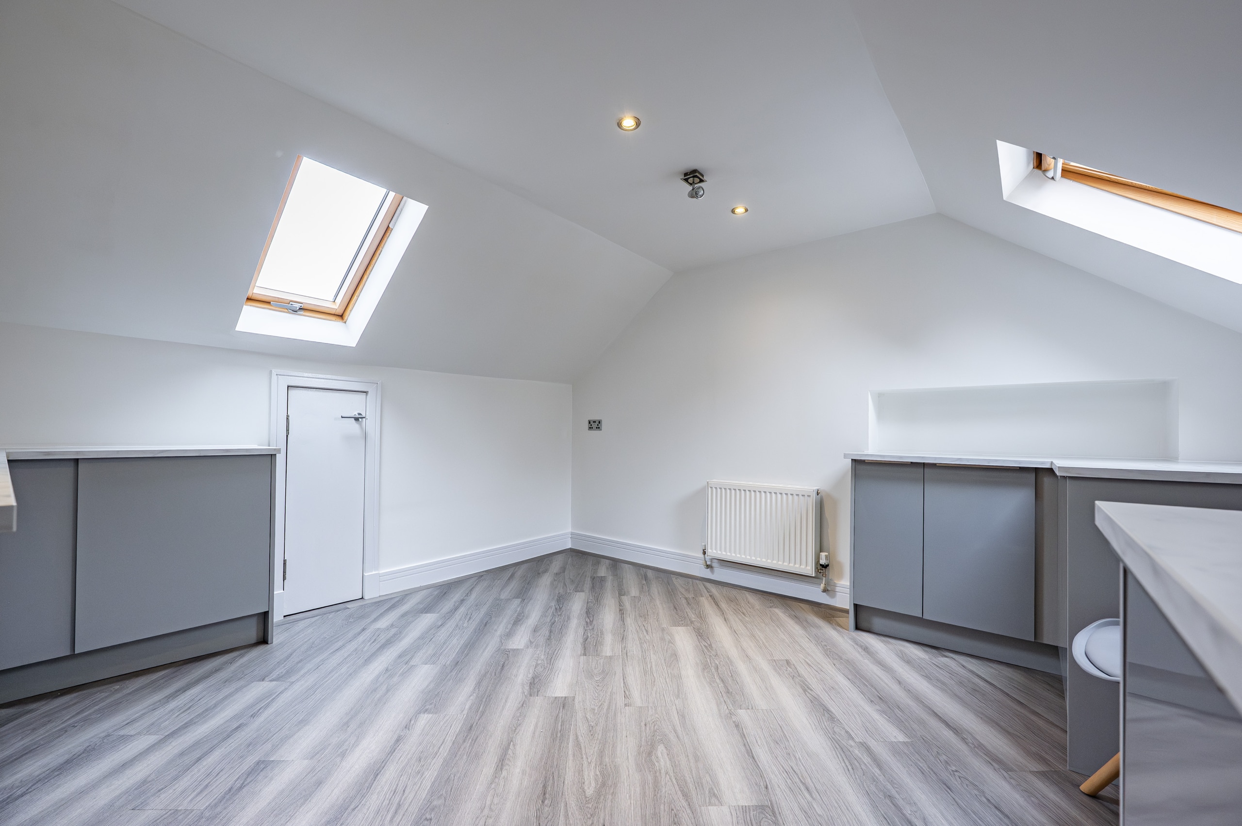 The property on offer comprises entrance hallway with stairway to upper level. The front facing lounge is a generously proportioned room with fresh neutral décor which continues throughout the house. The lounge also benefits from a large window which creates a naturally bright environment. The kitchen is to the rear of the property and is again of excellent proportions. The kitchen is modern in design and fitted with a range of base and wall mounted units with contrasting work surfaces and integrated appliances. There is an open plan dining area within the kitchen. On the upper level there are two double bedrooms. There is also a contemporary fully tiled family shower room on this level. Fixed stairs lead to a large floored loft space which is presented to the same high standard as the rest of the house.