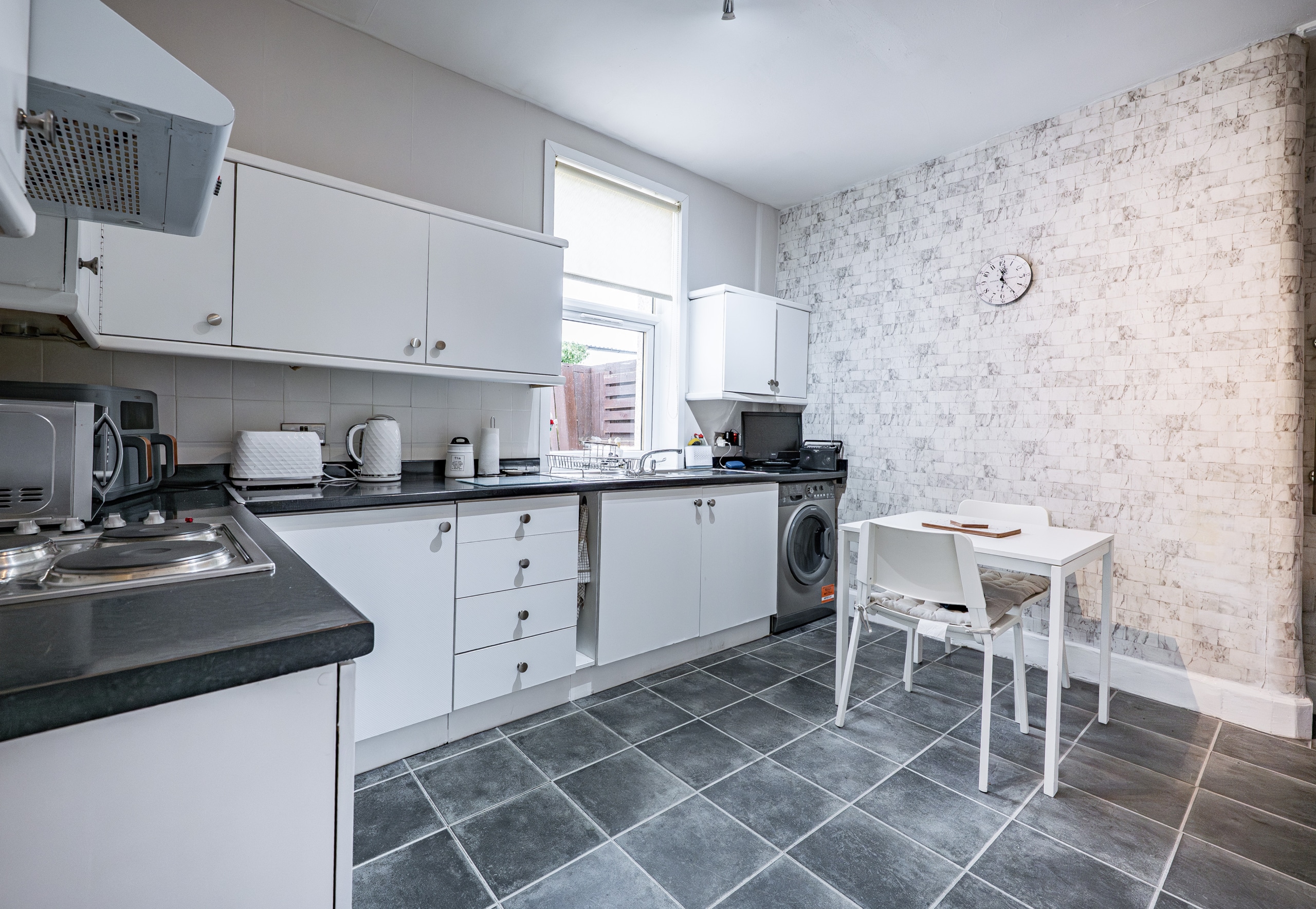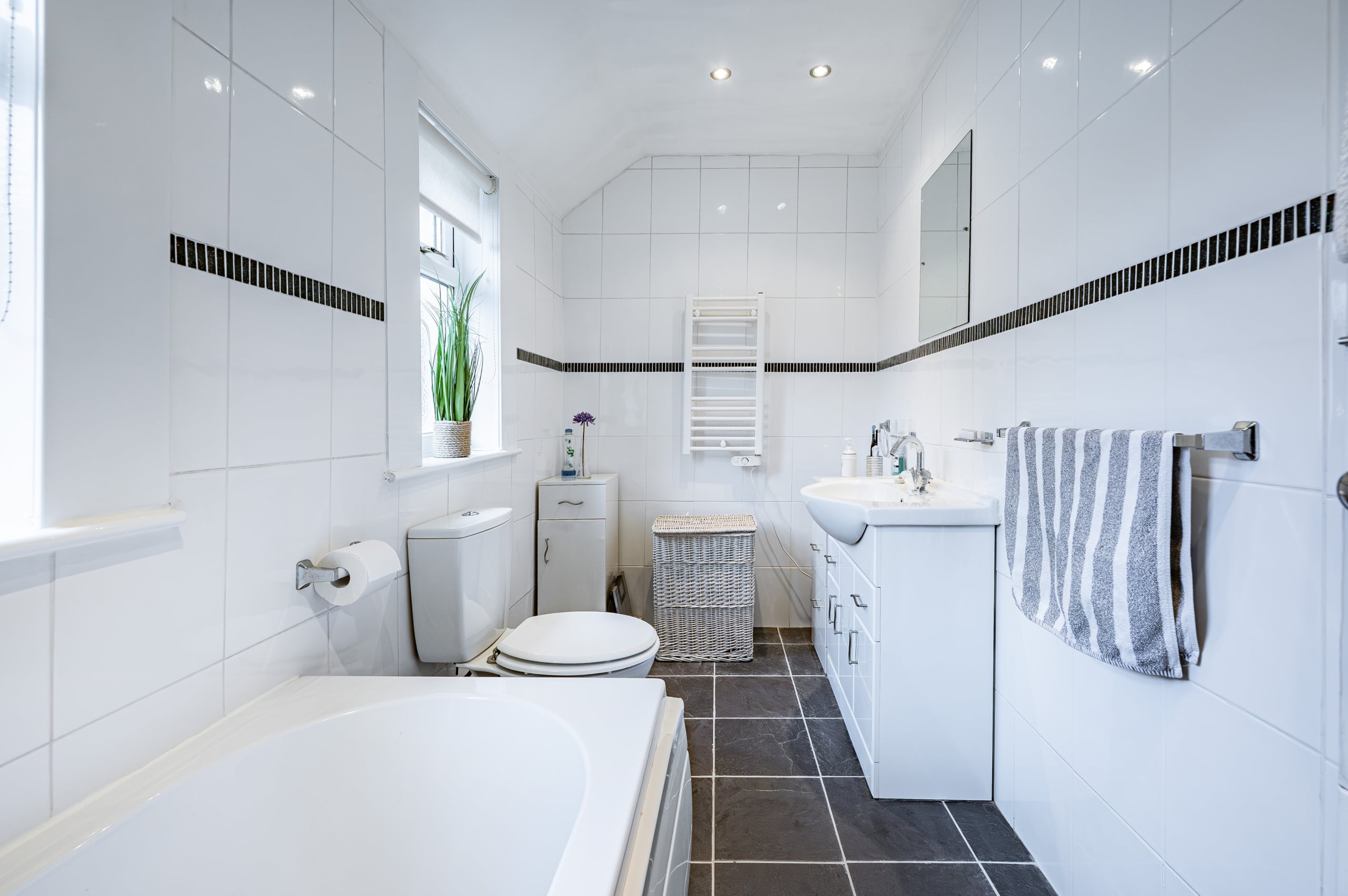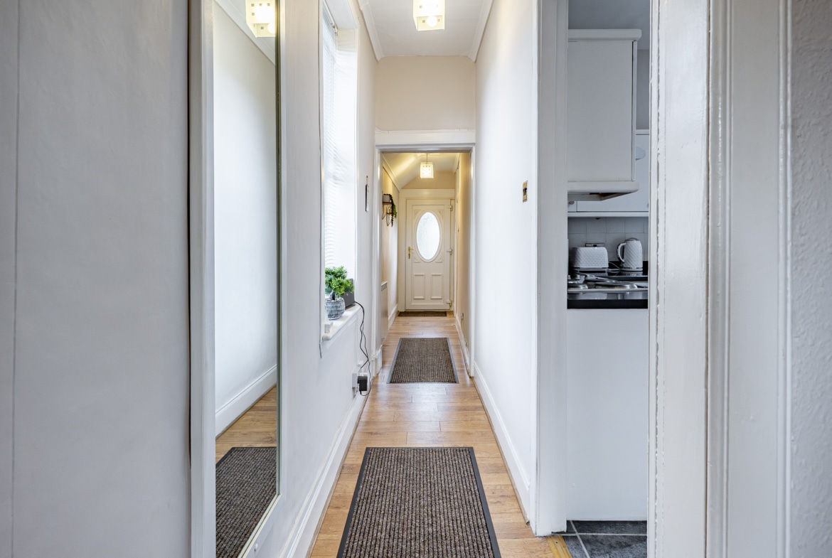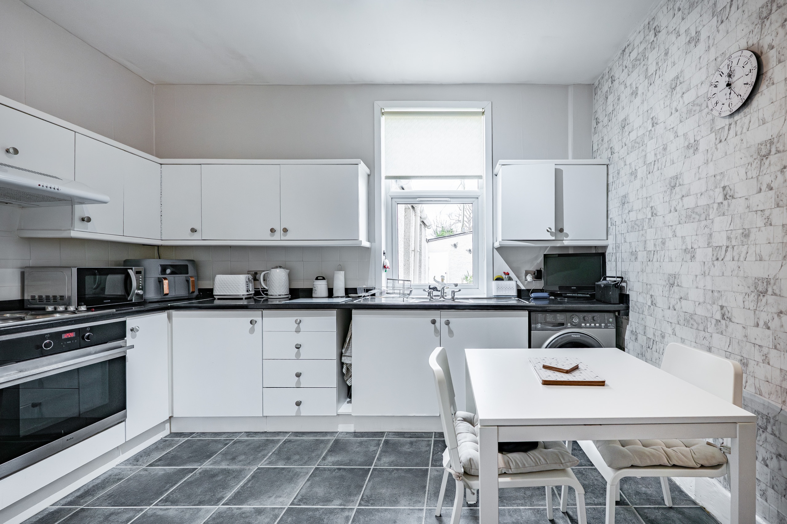 The accommodation begins with an entrance vestibule leading into a welcoming reception hallway, featuring a centrally positioned staircase to the upper level and a door providing direct access to the rear garden. The bright, well-proportioned front-facing lounge is enhanced by detailed cornicing, a decorative ceiling rose and an original fireplace, adding character and charm. To the rear, the kitchen offers ample space for a table and chairs and includes useful understairs storage. It is fitted with a range of base and wall-mounted units, integrated electric oven and hob, and space for freestanding appliances. A large, well-appointed modern three-piece bathroom completes the ground floor accommodation.