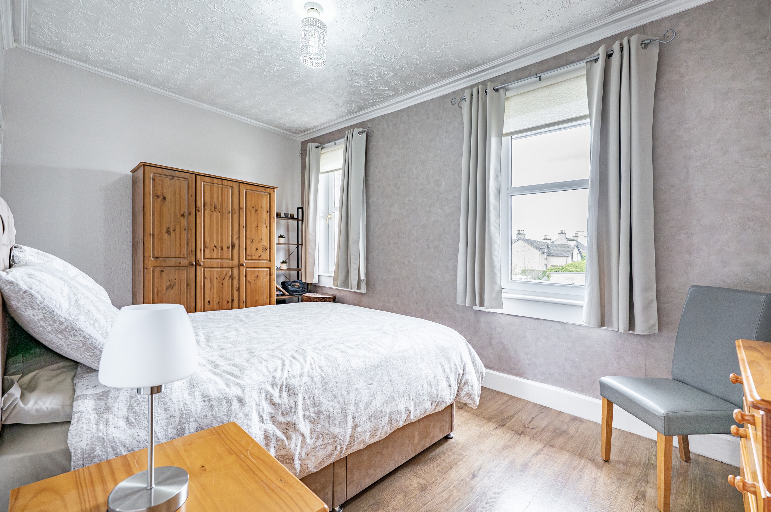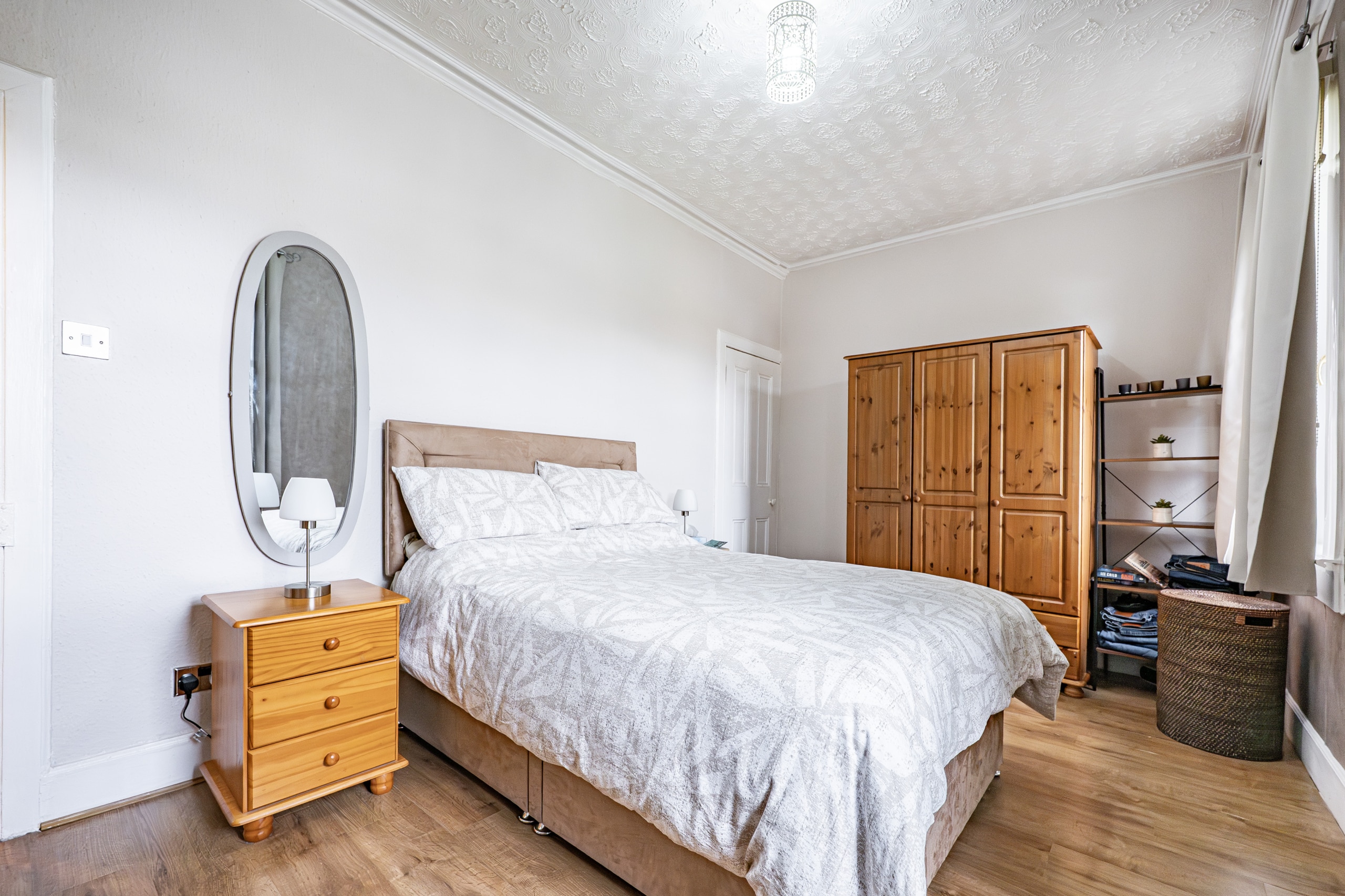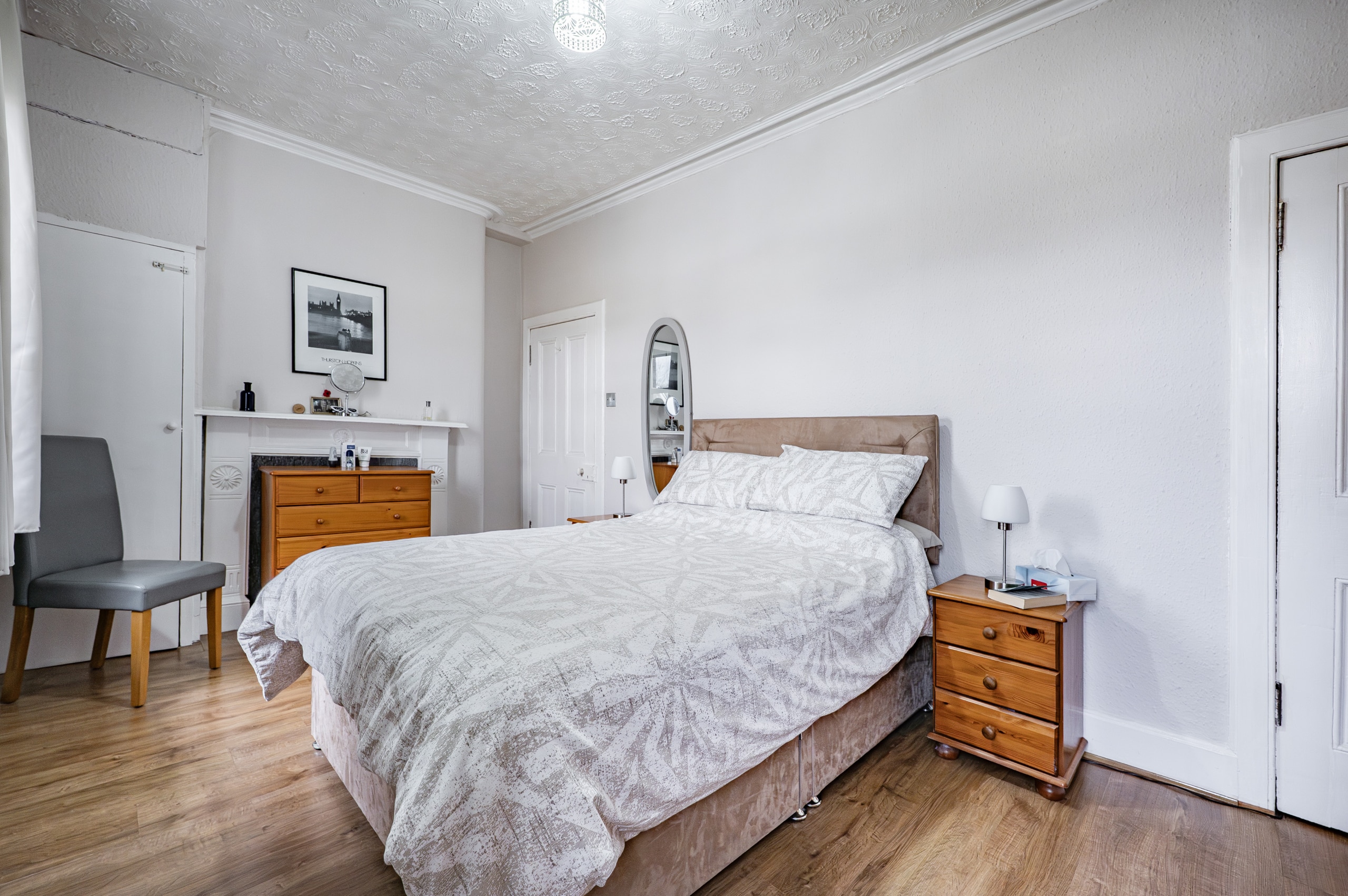 On the upper level, there are two substantial double bedrooms, both benefiting from deep storage cupboards, with one retaining an original fireplace.