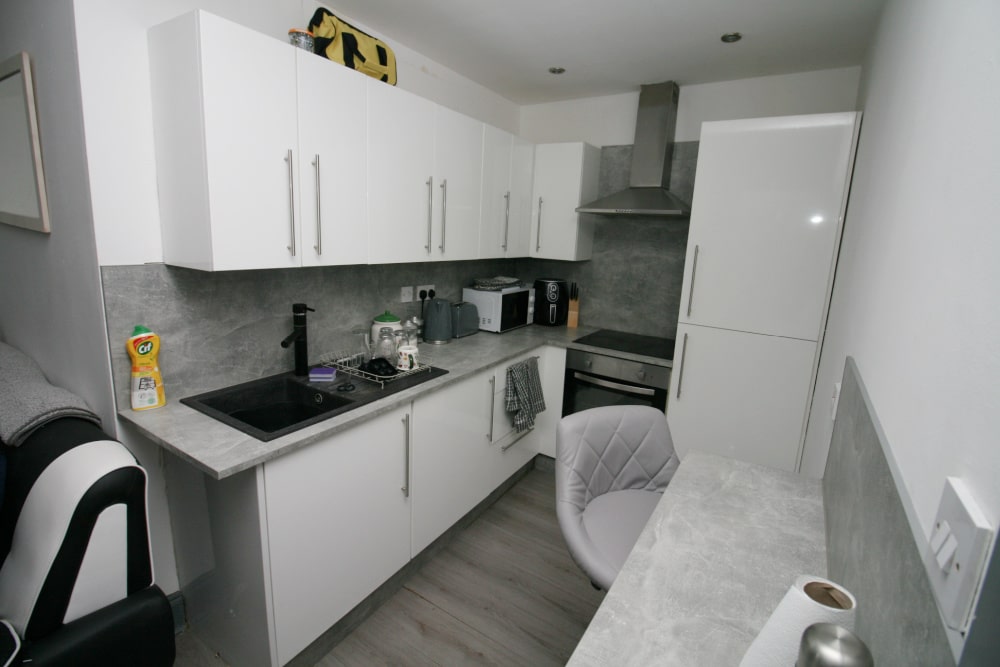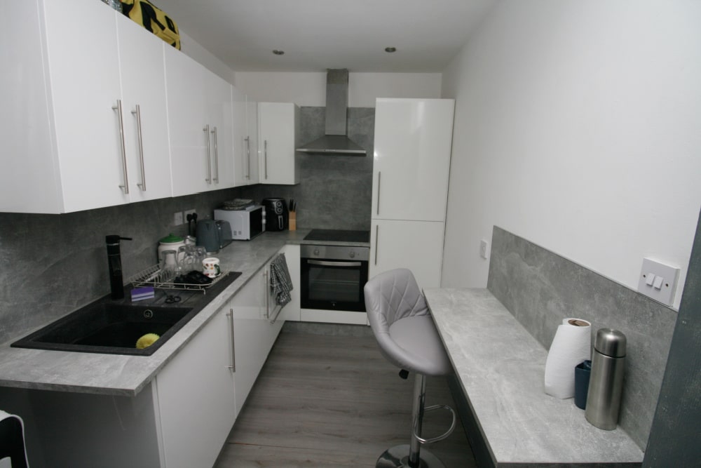 The property is accessed via private security entrance. Entrance to property via solid wooden door leading to L shaped reception hallway with laminated flooring. Hallway leads to all compartments including loft hatch. Open plan lounge/kitchen with rear facing window, laminated flooring, decorative wall panelling and recessed alcove which has been converted into bar area. The newly installed contemporary kitchen provides ample base and wall mounted units, ample work surfaces, electric oven, hob, extractor, integral fridge/freezer and washer dryer. Bedroom one is front facing with fitted carpet. Bedroom two is again front facing with fitted carpet. Rear facing upgraded bathroom comprising three piece suite including low flush wc, wash hand basin, bath, shower (over bath), feature LED lighting installations and laminated flooring.