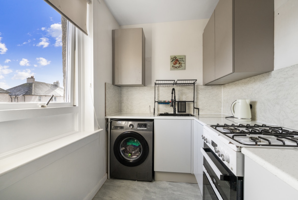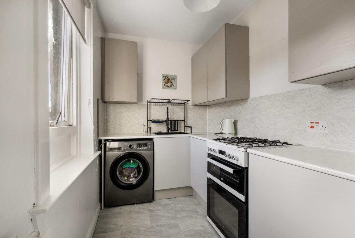 Tucked to the side of the property is the main entrance which opens into a private staircase. The landing provides access to the living room, bedroom one, and shower room. At the end of the hallway, you are drawn into the bright, spacious living room with a generous footprint offering space for various furniture configurations including both living and dining furniture if desired, the room is flooded with natural light. Conveniently positioned off the living room is the kitchen, fitted with a range of base and wall mounted cabinets framed by a co-ordinating work tops and splash back, stylish black sink and tap, gas cooker, fridge/freezer, and washing machine.