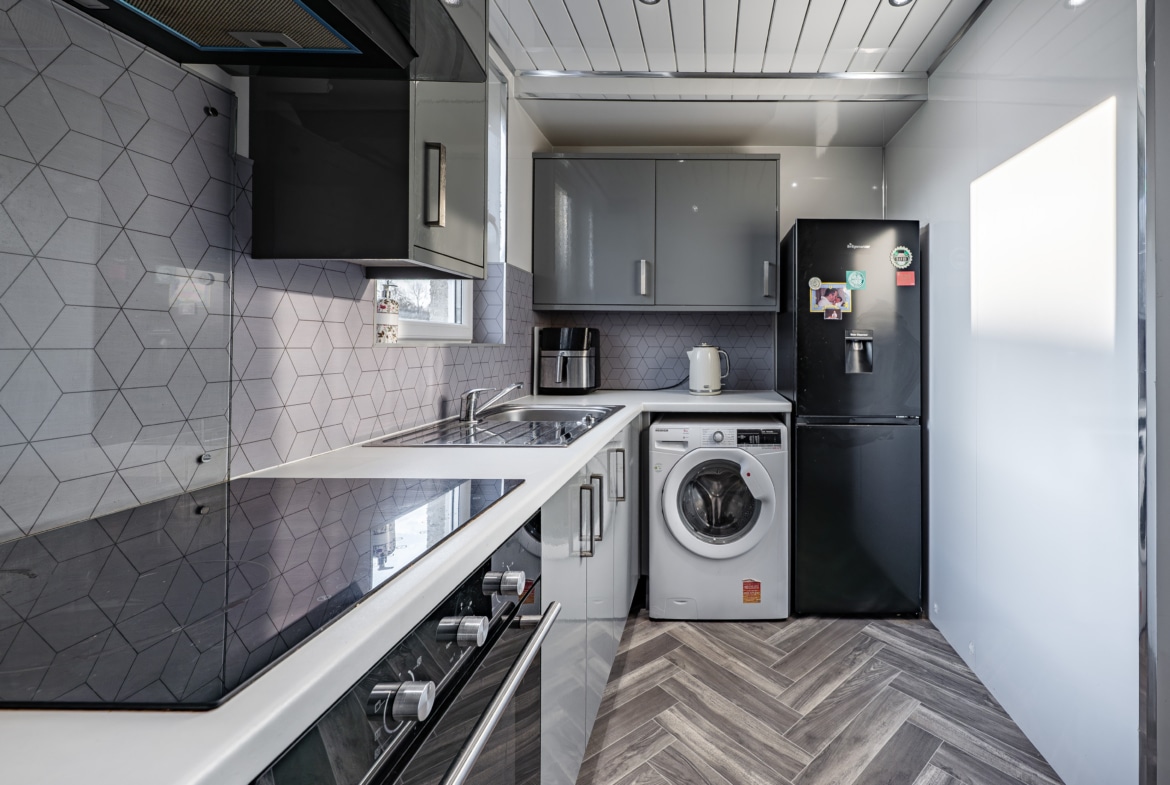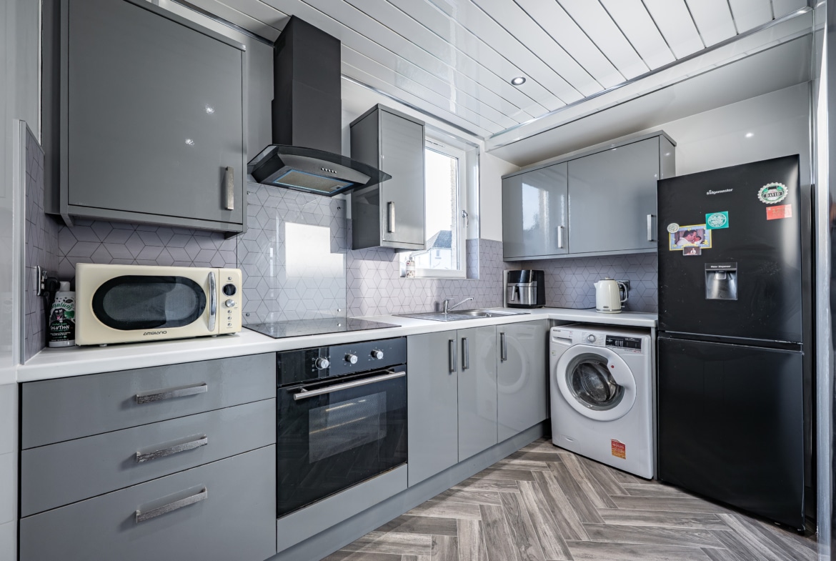 The kitchen is well appointed with a range of base and wall-mounted storage units and includes an integrated electric oven and hob, along with space for a freestanding fridge freezer and washing machine.