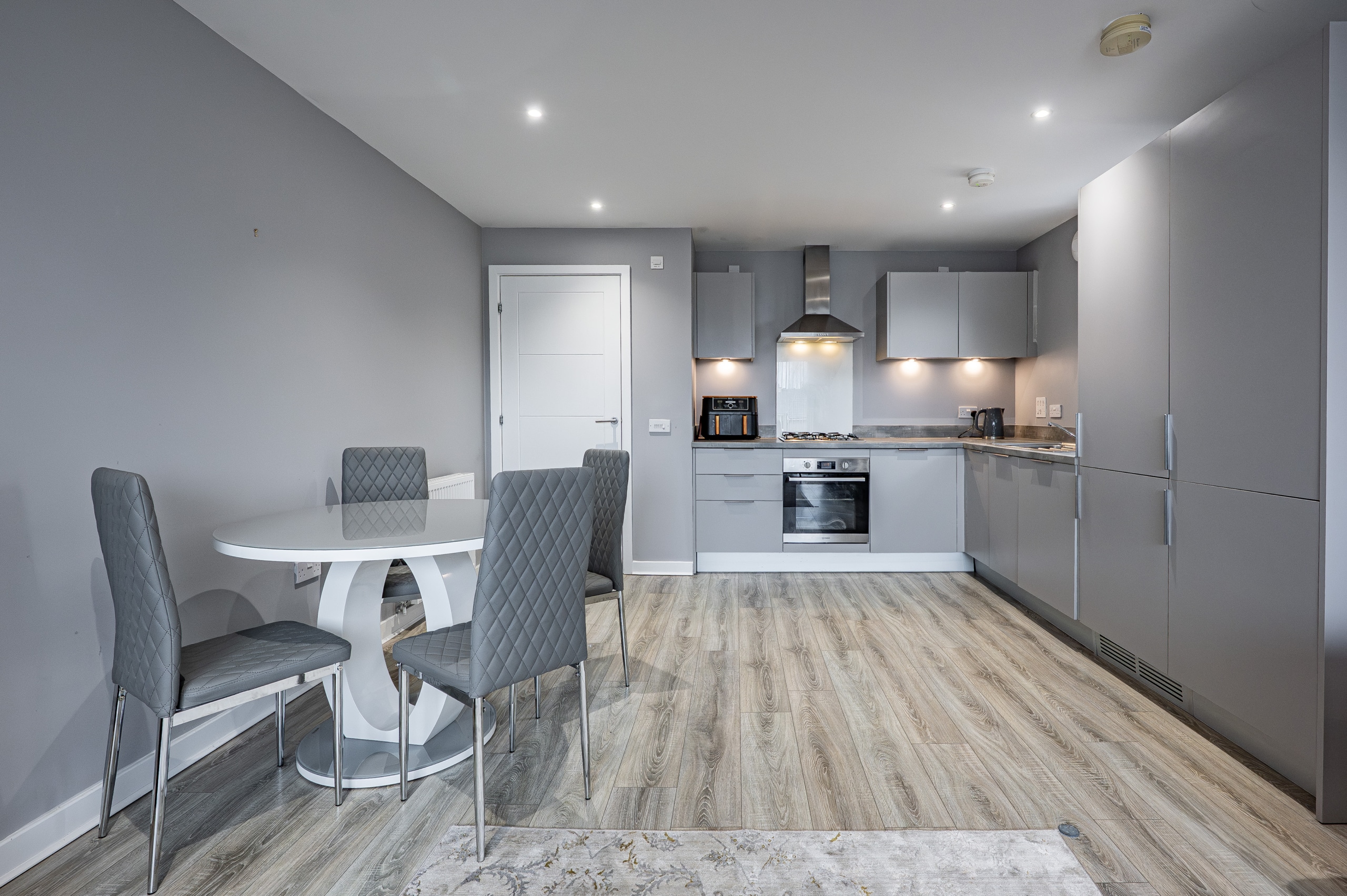 The living area is a super open plan room with large South facing windows creating a lovely bright environment. At one end of the room is a large lounge space which extends to a dining area and then to the fitted kitchen at the far end.