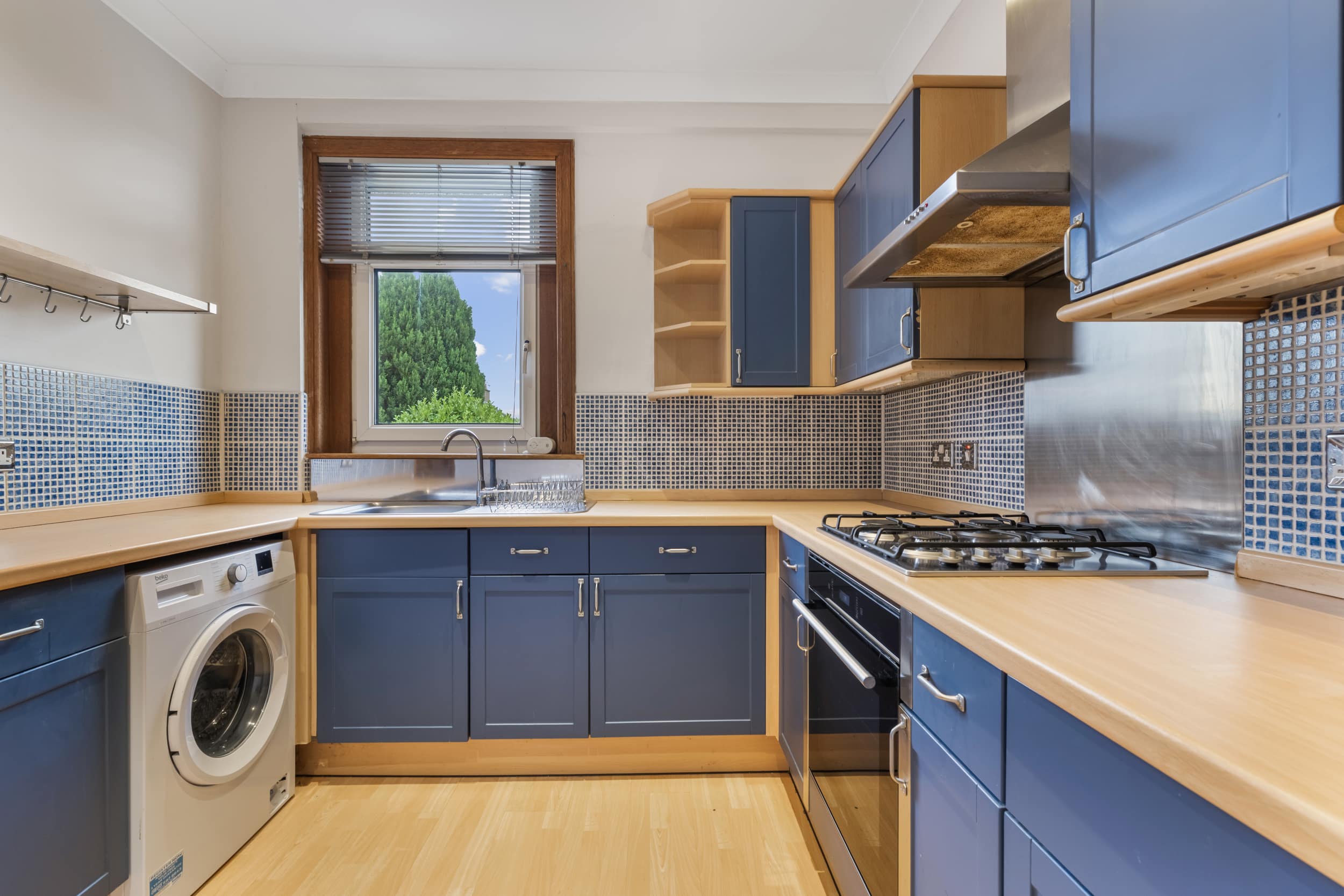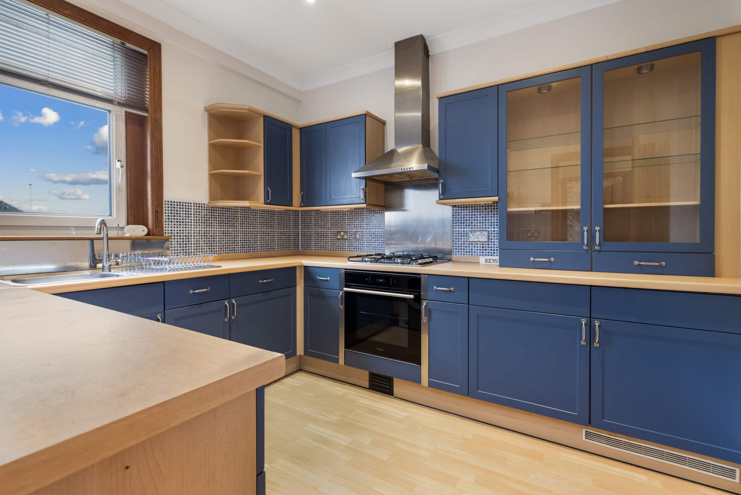 The kitchen boasts a plethora of striking blue cabinets framed by a contrasting light wood effect worktop, integrated electric oven, gas hob, fridge, freezer, and washing machine. Completing this fantastic property is the bathroom featuring a roll top bath, toilet, and sink. Gas central heating and double glazing provide all year-round comfort.