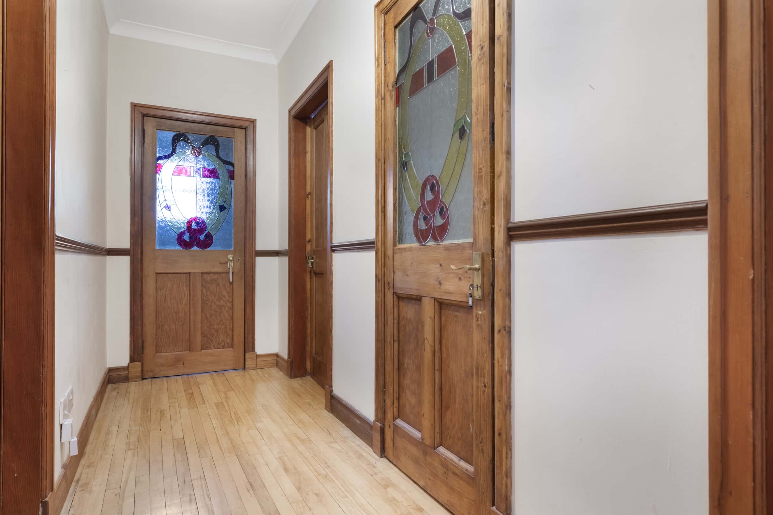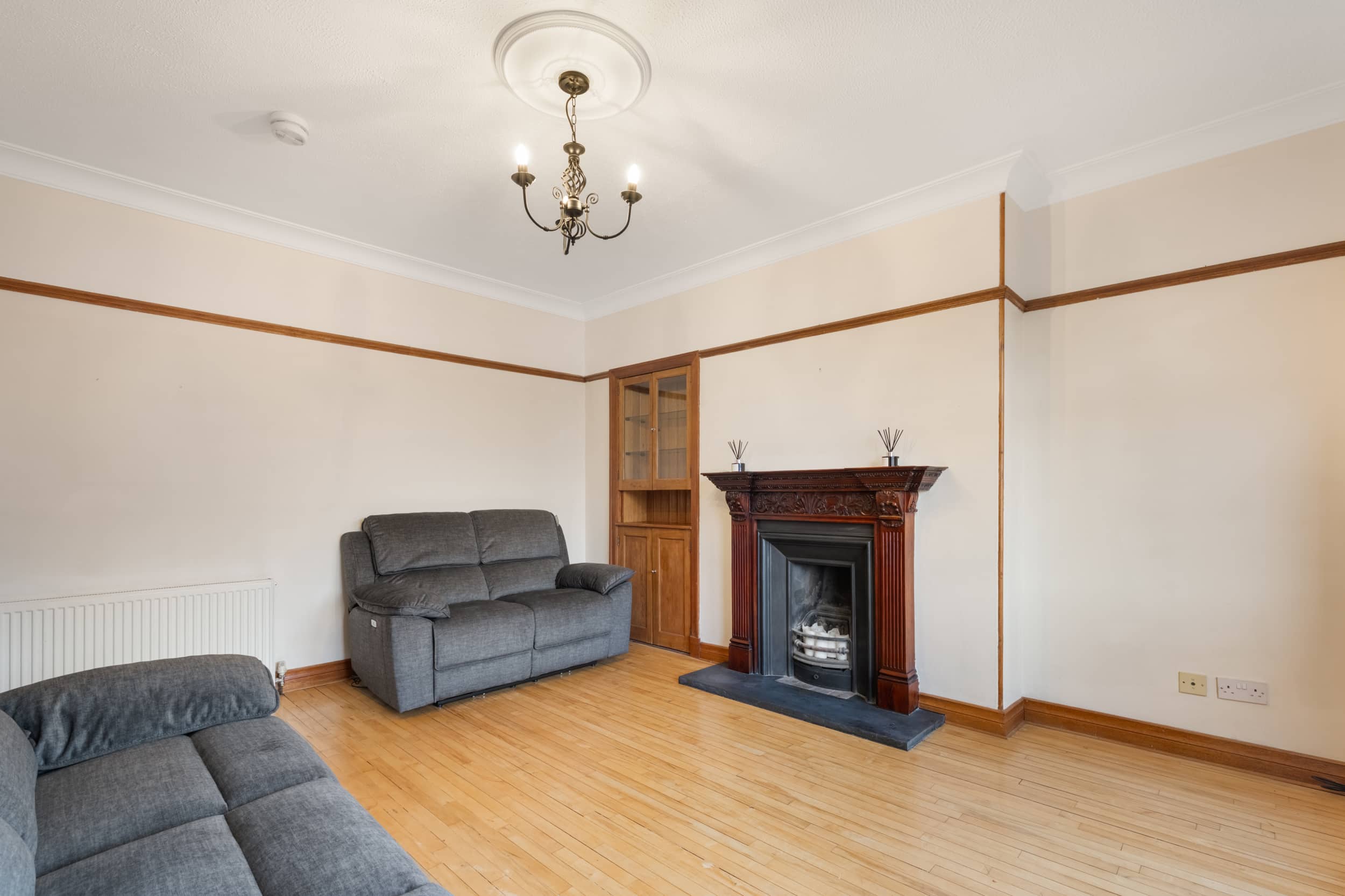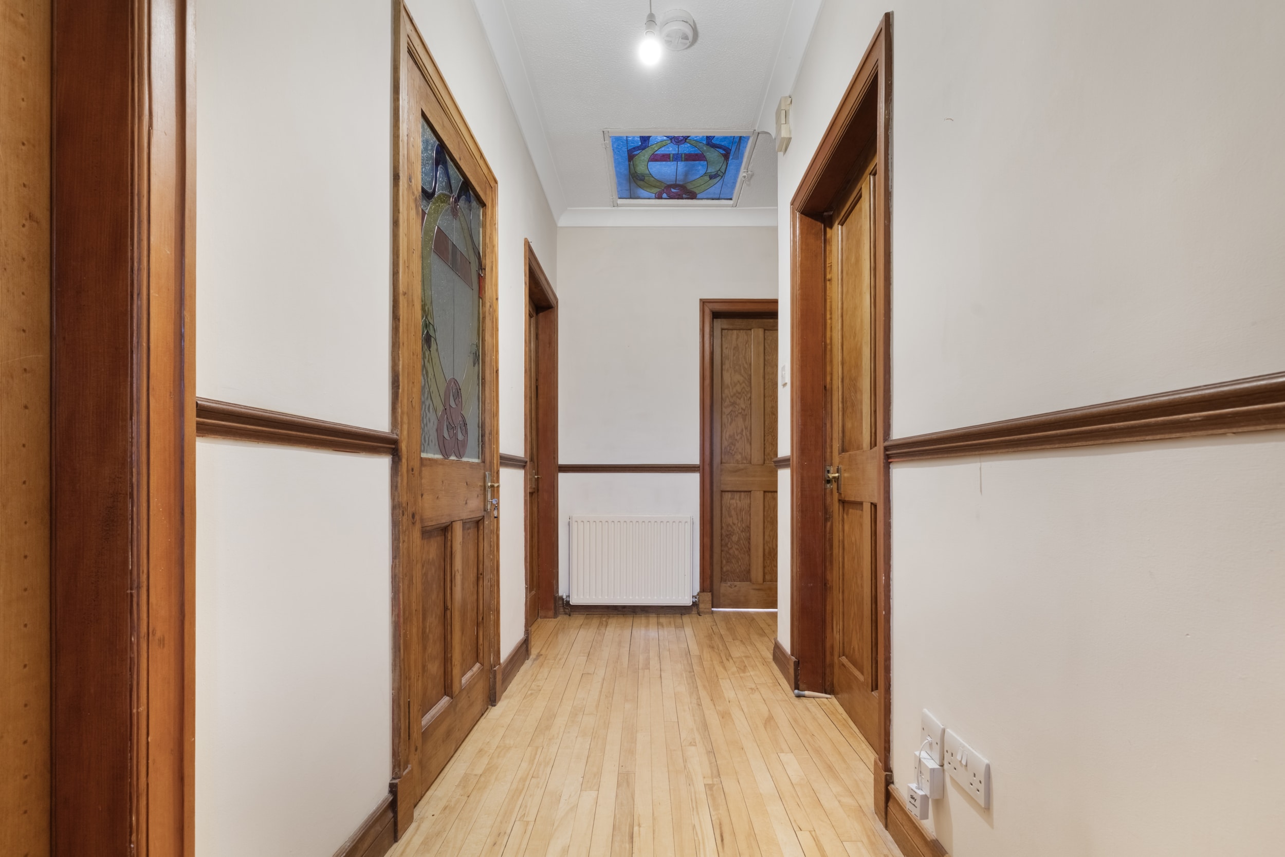 Tucked to the side of the property the main entrance opens into an internal staircase which leads to the upper flat. The welcoming hallway with large storage cupboard provides access to all accommodation including the impressive living room, positioned to the front of the property this generously proportioned room offers a footprint for various furniture configurations, tasteful décor and wooden flooring. Across the hallway is the principal bedroom, this is a beautiful room with bay window which floods the room with natural light, there is space for a king-sized bed and freestanding furniture, a lovely feature in here is the fireplace giving a focal point to the room. Bedroom two enjoys a peaceful garden aspect and is another double sized room.