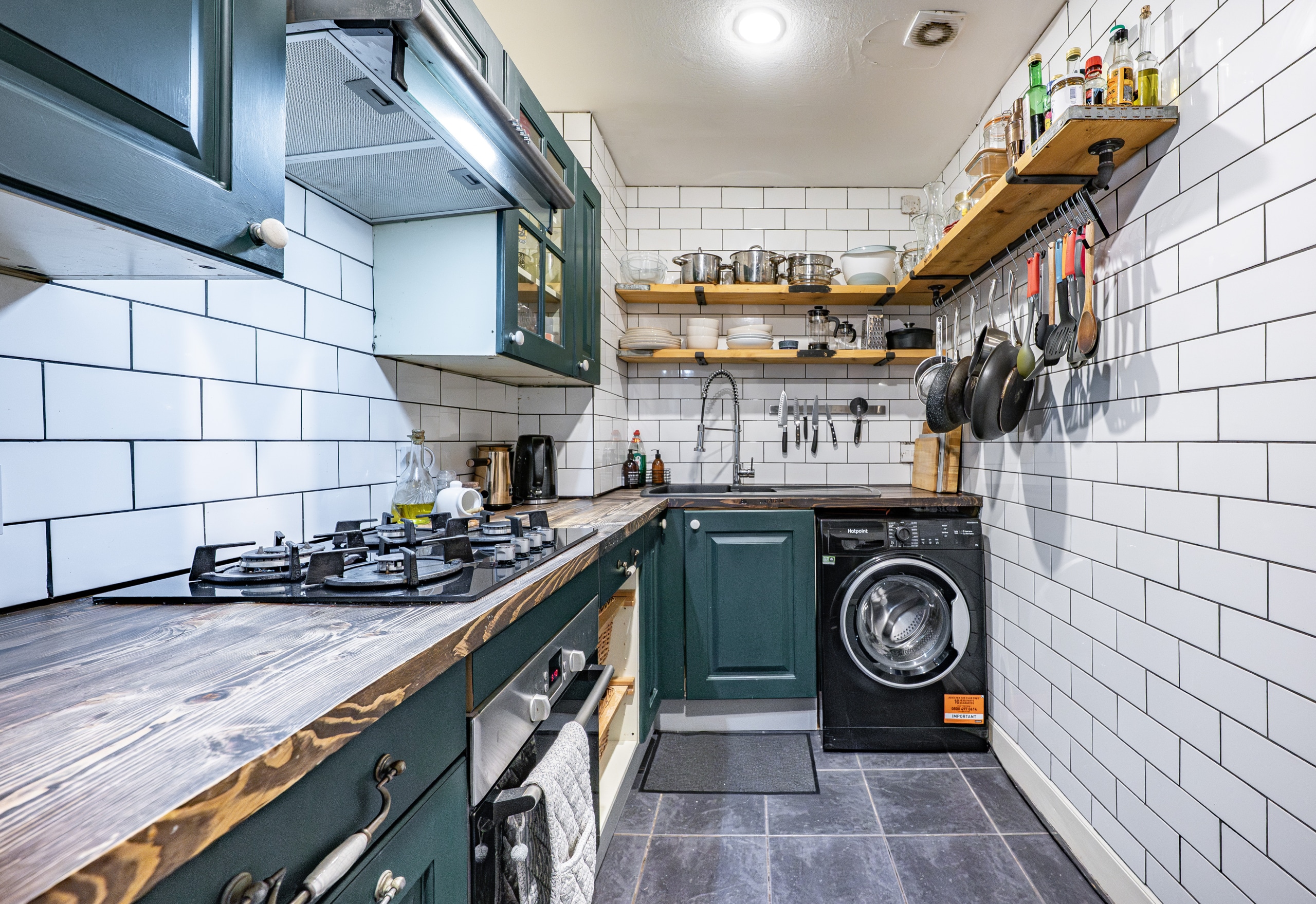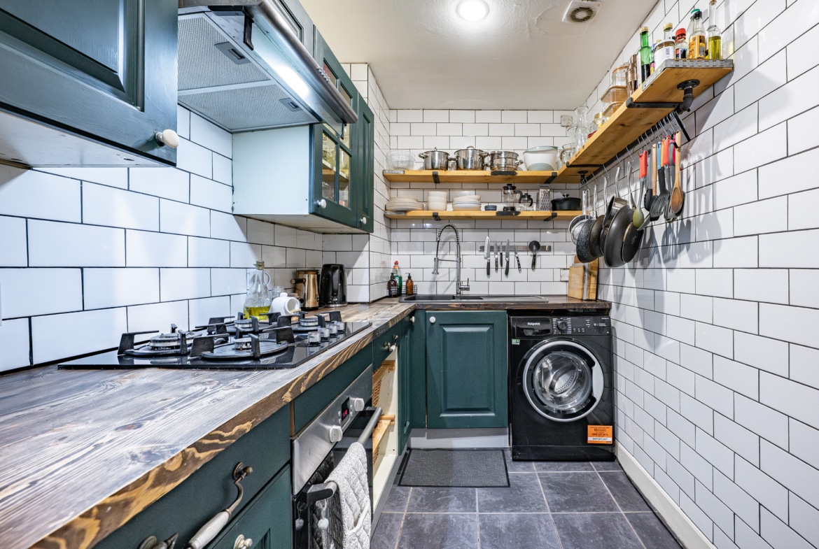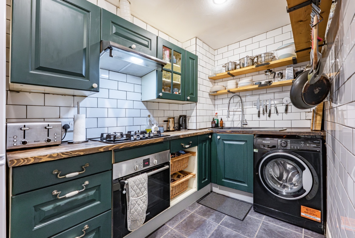 The kitchen is well-appointed with a range of base and wall-mounted storage units, an integral oven and hob, and space for freestanding appliances.