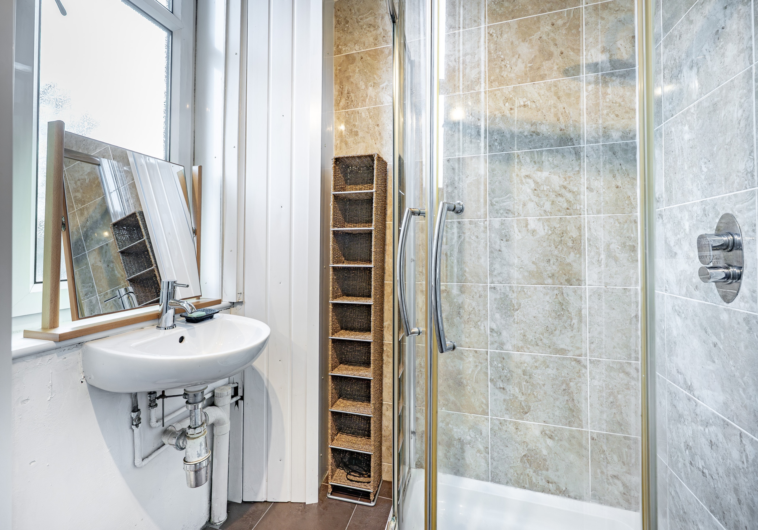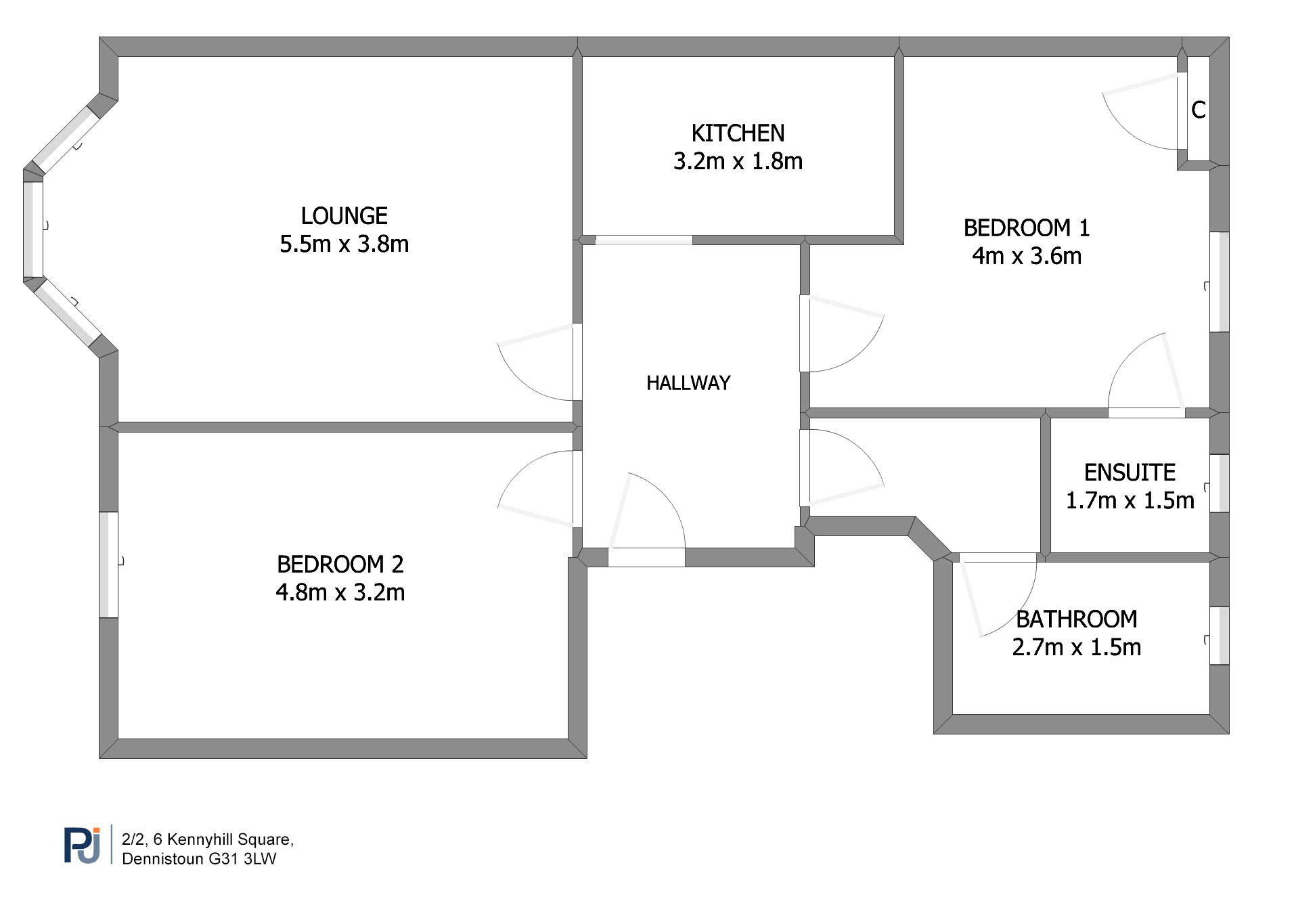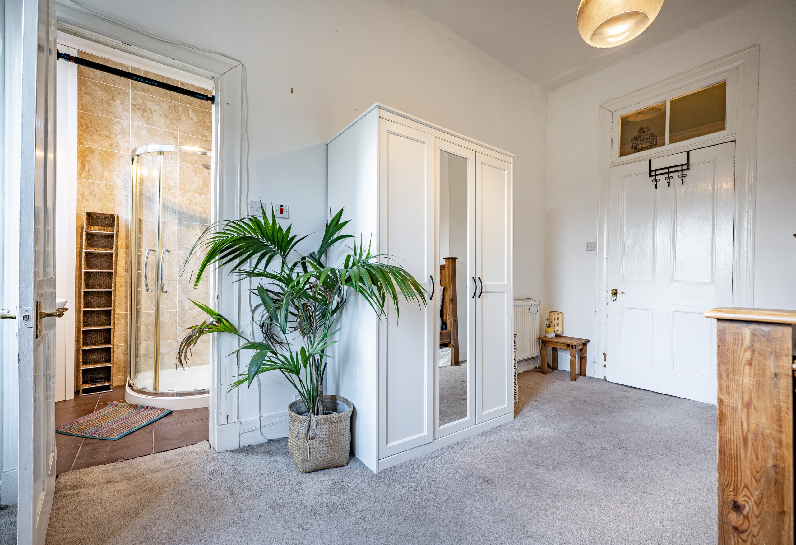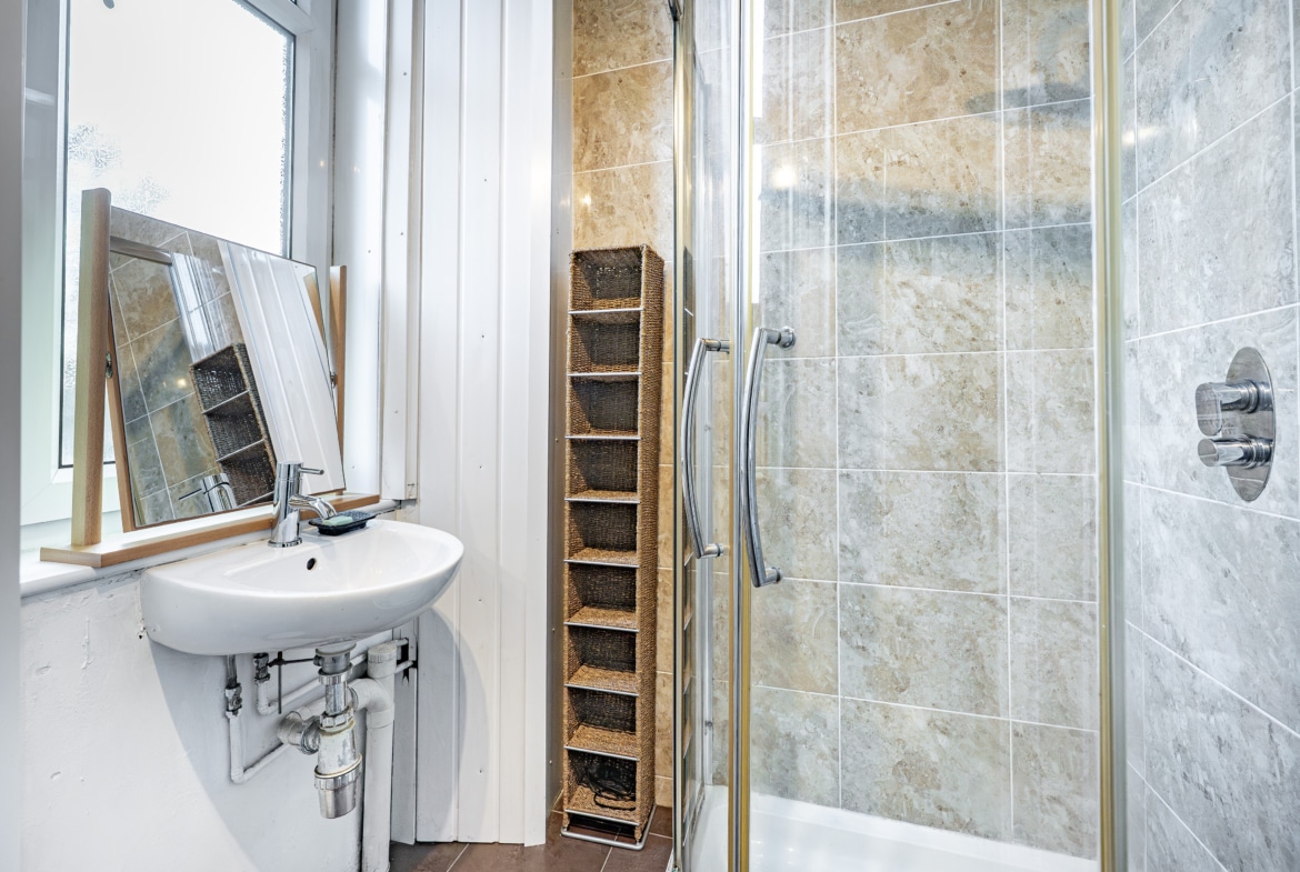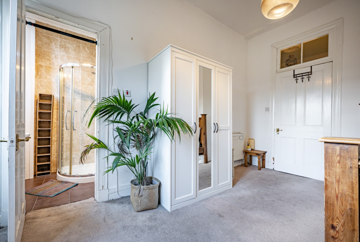 Both bedrooms are generously proportioned, with the rear bedroom benefiting from the added convenience of an en-suite shower room. An inner hallway provides access to a well-appointed three-piece bathroom, completing the accommodation.