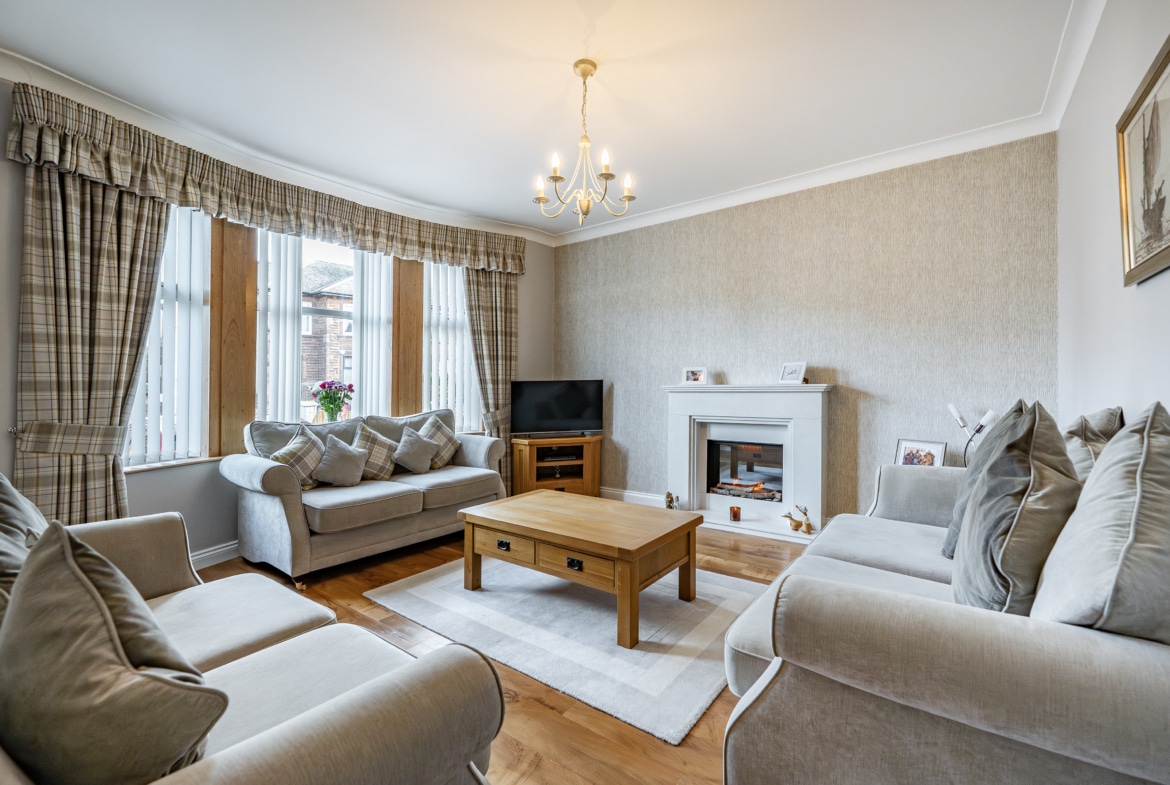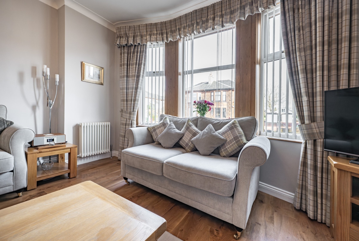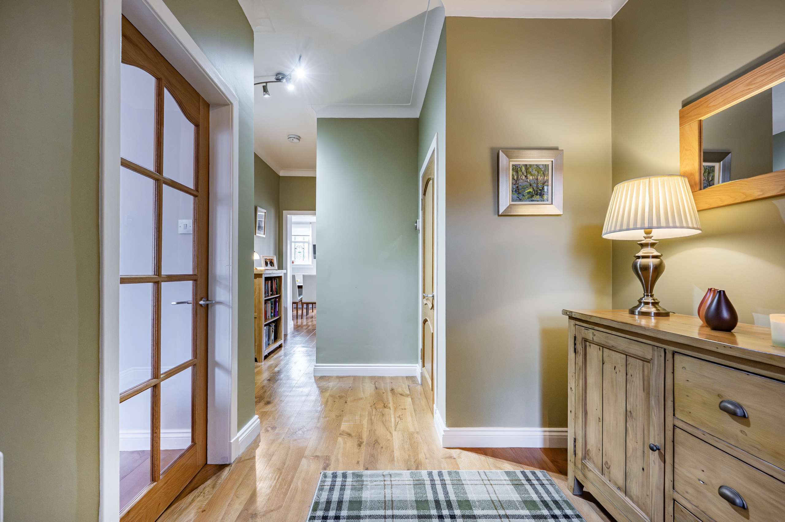 The accommodation is entered via a private vestibule leading into a welcoming reception hallway, with a useful storage cupboard and access to all principal apartments. To the front, an elegant formal lounge features a focal point fireplace and an impressive three-section bay window. A generously proportioned rear-facing double bedroom and the contemporary shower room complete the internal layout.