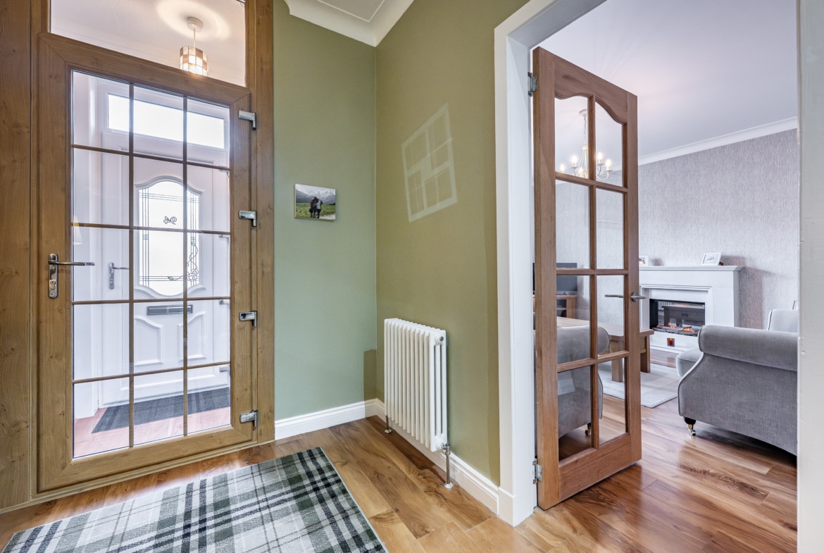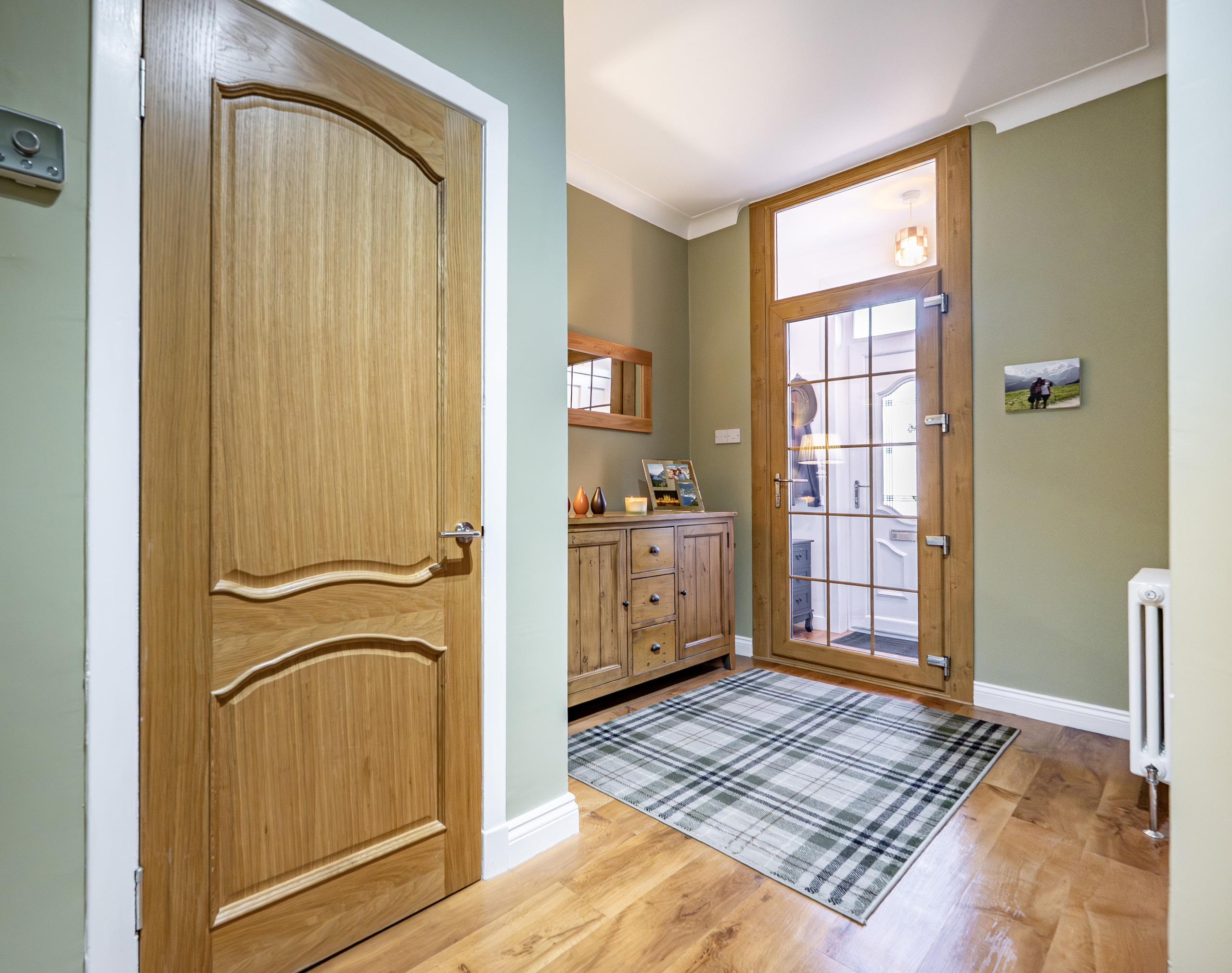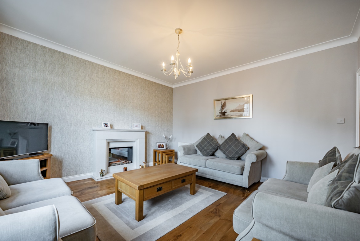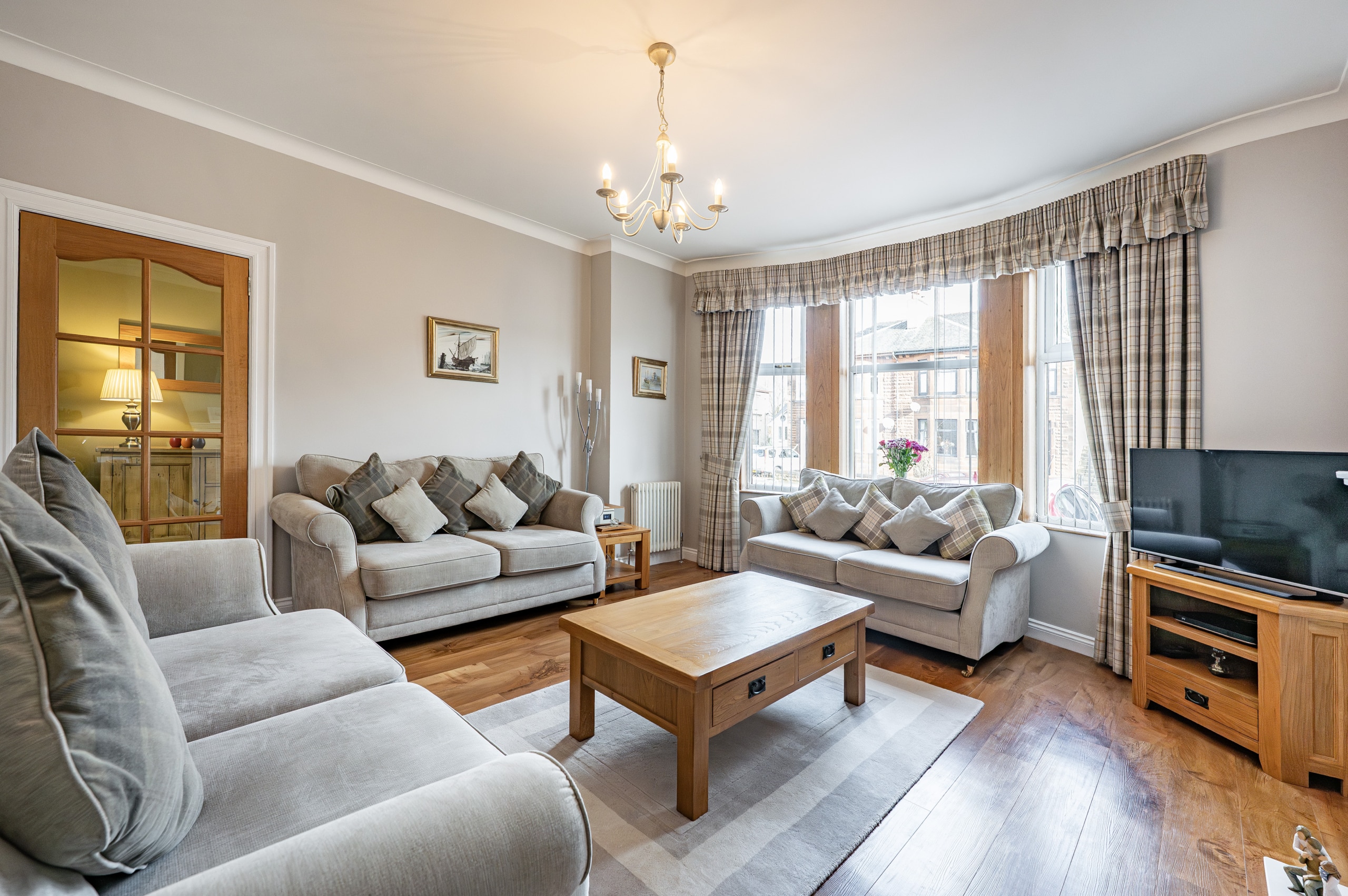 The accommodation is entered via a private vestibule leading into a welcoming reception hallway, with a useful storage cupboard and access to all principal apartments. To the front, an elegant formal lounge features a focal point fireplace and an impressive three-section bay window. A generously proportioned rear-facing double bedroom and the contemporary shower room complete the internal layout.