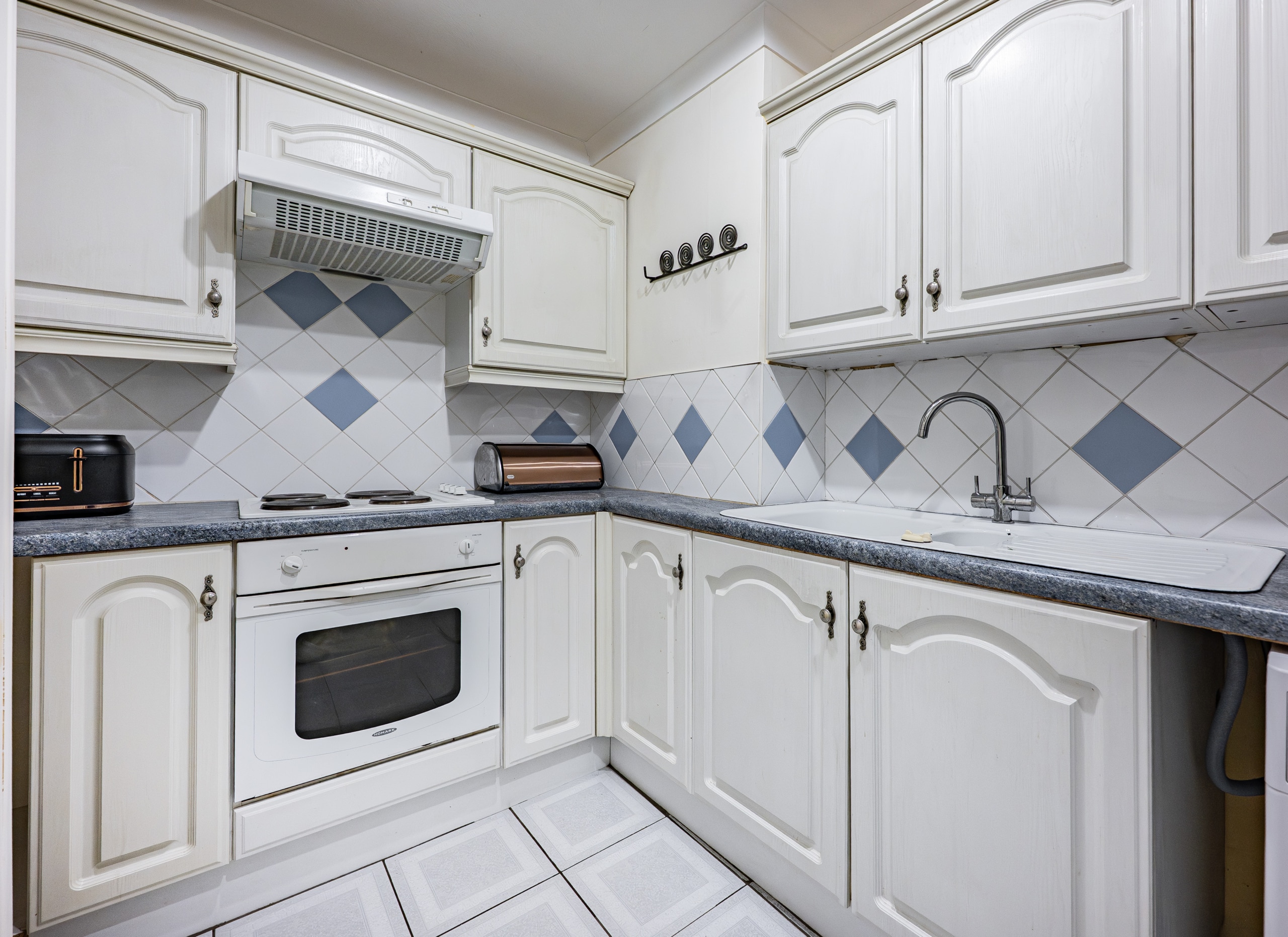 The accommodation comprises a welcoming entrance hall with a useful storage cupboard. The lounge is a particularly impressive space, featuring decorative ceiling plasterwork and a broad south-facing bay window which floods the room with natural light. The kitchen is fitted with a range of base and wall-mounted units, complemented by a breakfast bar, an integrated oven and hob, and space for freestanding appliances.