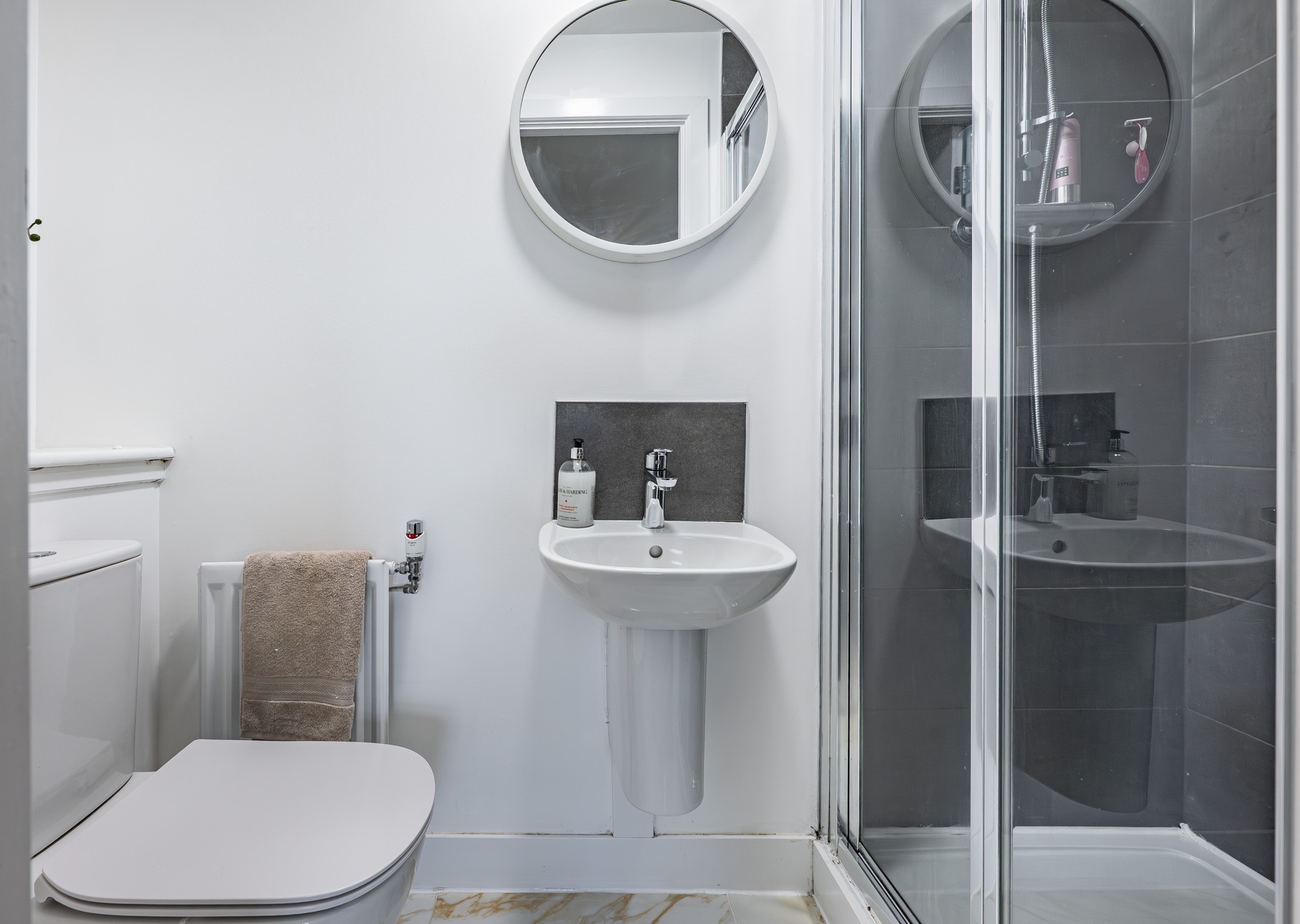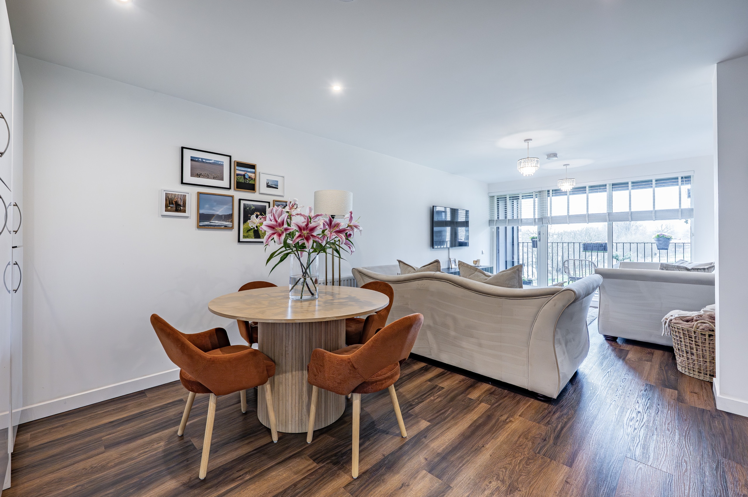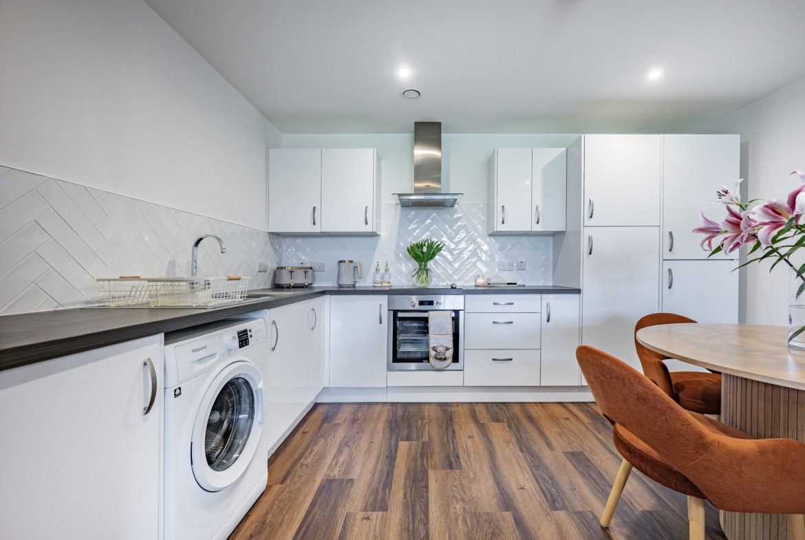 Upon entry, the apartment welcomes you with a spacious and inviting reception hallway, which conveniently houses two large storage cupboards. This area acts as the gateway to all rooms, including an immediately impressive main living space that seamlessly combines a lounge and dining area with an open-plan kitchen. Bathed in natural light, the lounge extends to the south facing balcony, a perfect spot for gatherings, unwinding with a glass of wine, or savouring a morning coffee as the day begins. The kitchen exhibits tasteful design, featuring a range of base and wall-mounted storage units, with integral appliances including a fridge freezer, oven, hob, and there is space for a freestanding washing machine. Both bedrooms are generous in size, with the principal having in-built fitted wardrobes and the convenience of an en-suite an en-suite shower room. A particularly large and well-appointed bathroom, complete with a sleek white three-piece suite, completes the accommodation.