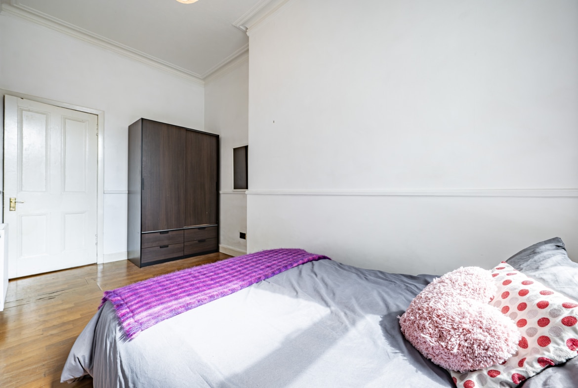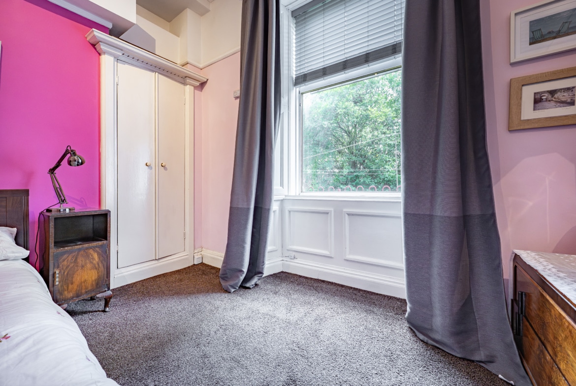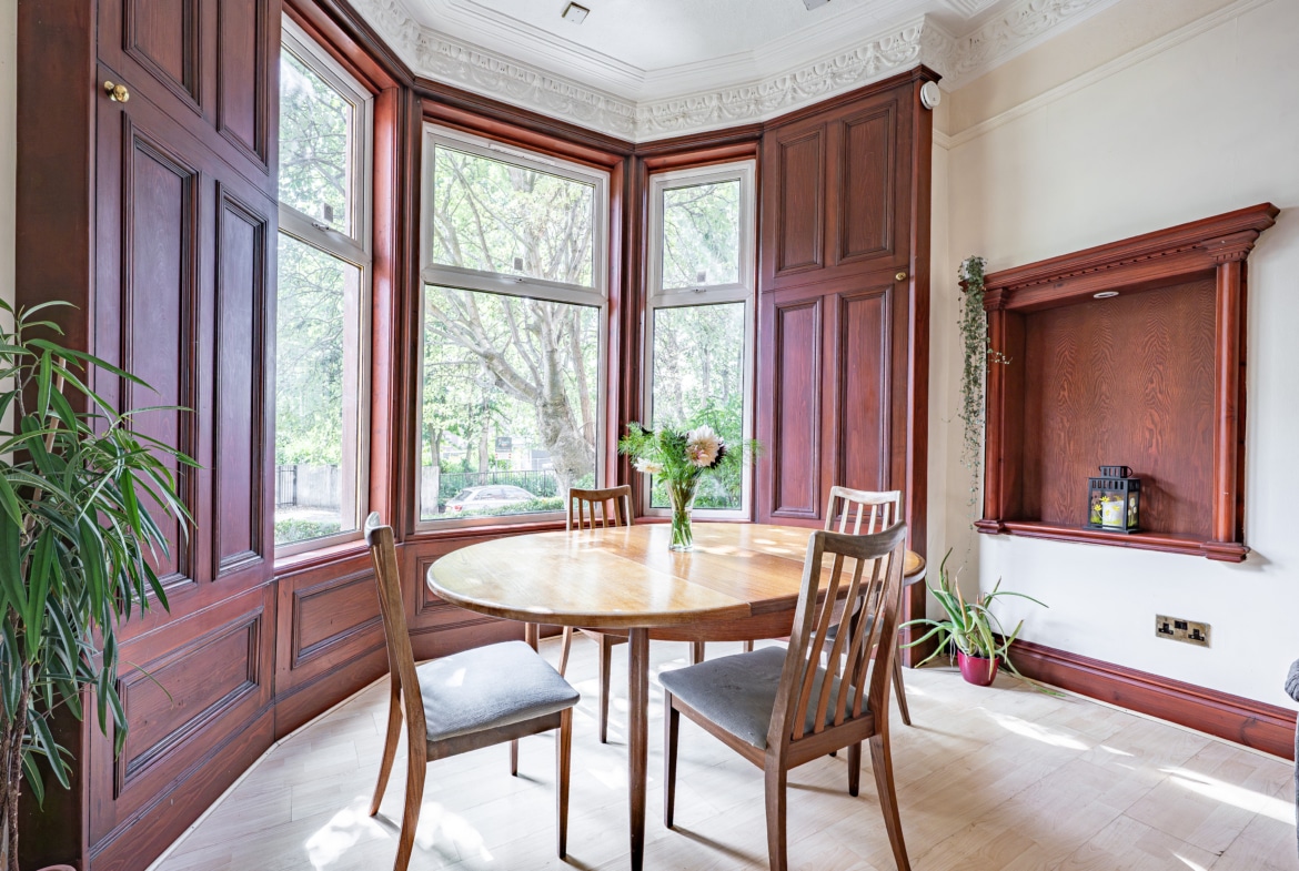 The accommodation opens with a practical entrance vestibule, leading through a timber door with original painted glass insert into a broad and welcoming reception hallway, complete with a useful storage cupboard. From here, all apartments are accessed, including a stunning lounge/dining room featuring ornate ceiling cornice and centre rose, where a wide south-facing bay window floods the space with natural light. The kitchen is well-appointed with a range of wall and base units and comes equipped with an integrated oven, gas hob, fridge-freezer, and washing machine.