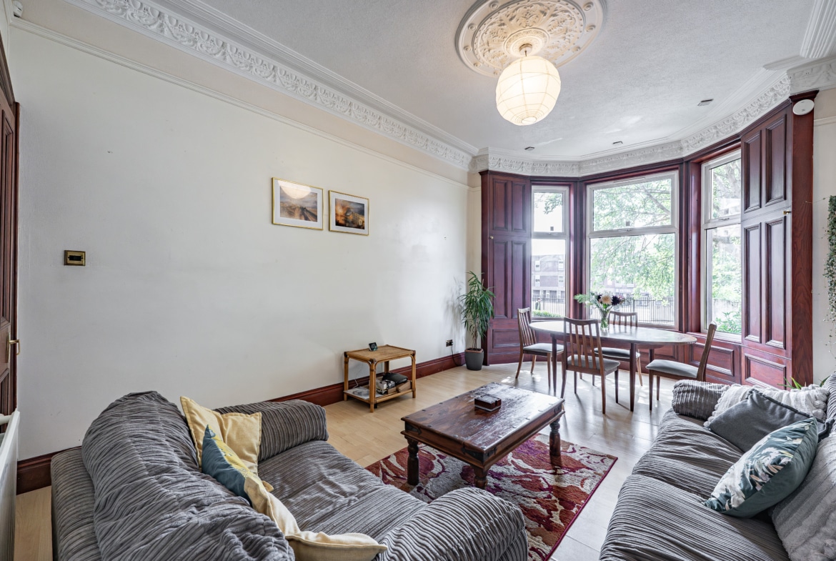 Enjoying a prime position in the heart of Dennistoun, this raised ground-floor tenement flat boasts a highly sought-after south-facing frontage with an open outlook, unopposed by neighbouring buildings. A particular highlight of the property is the rare and enviable advantage of a private, enclosed front garden — bathed in sun throughout the day thanks to its orientation, and offering a tranquil, secluded retreat surrounded by mature greenery.
