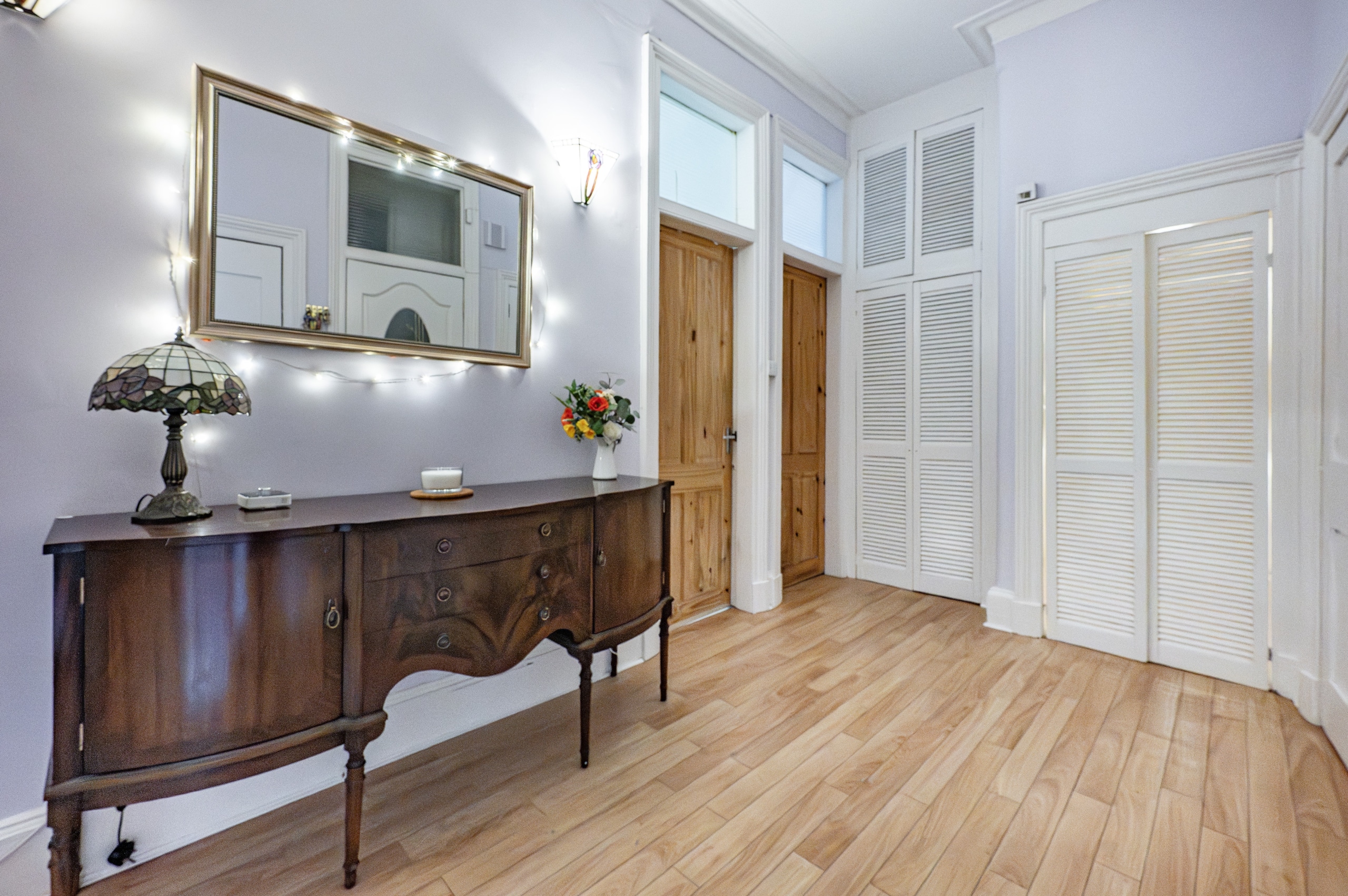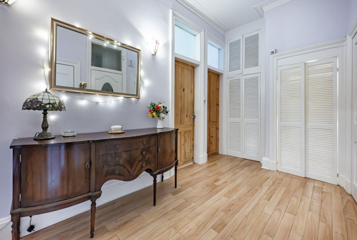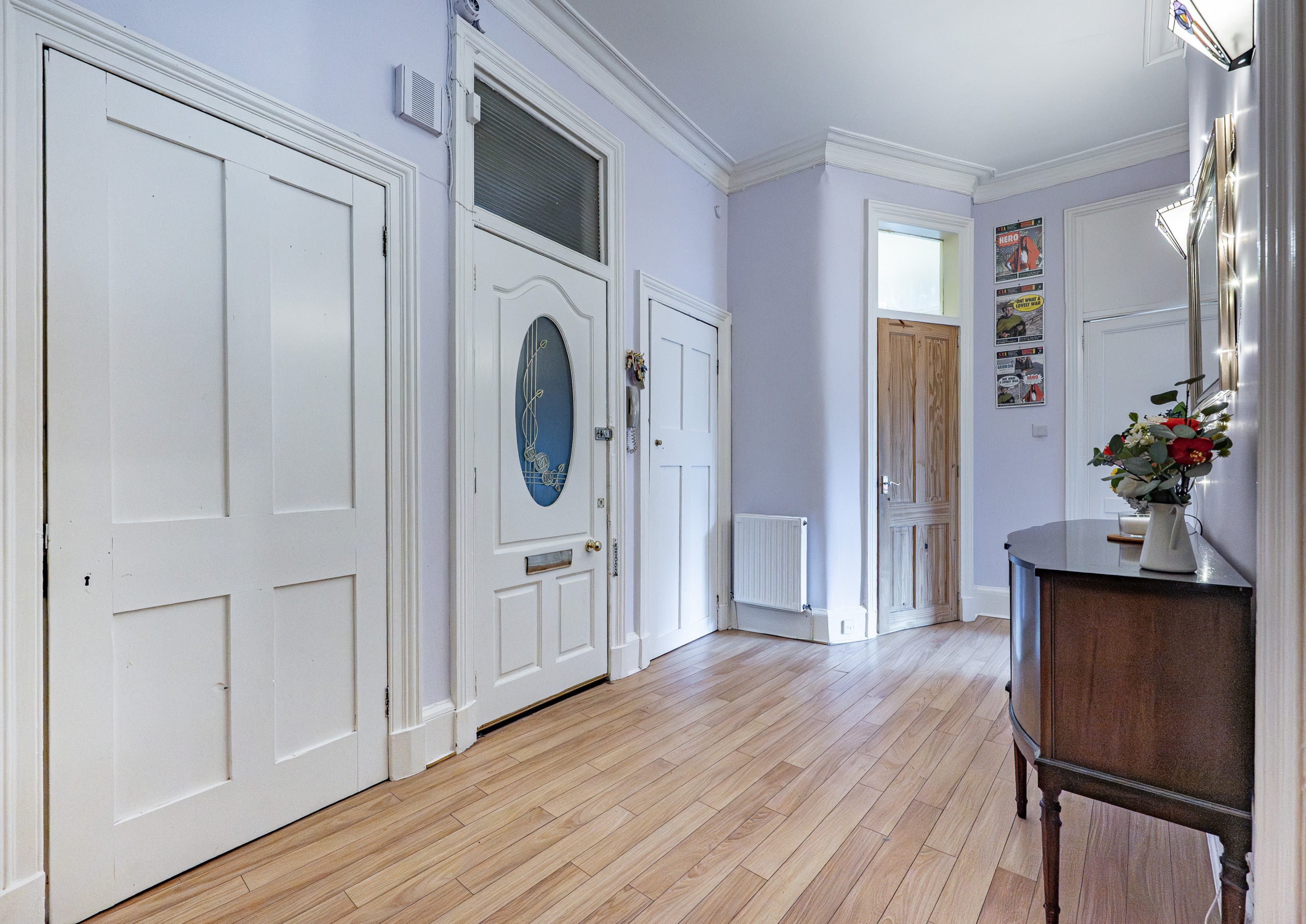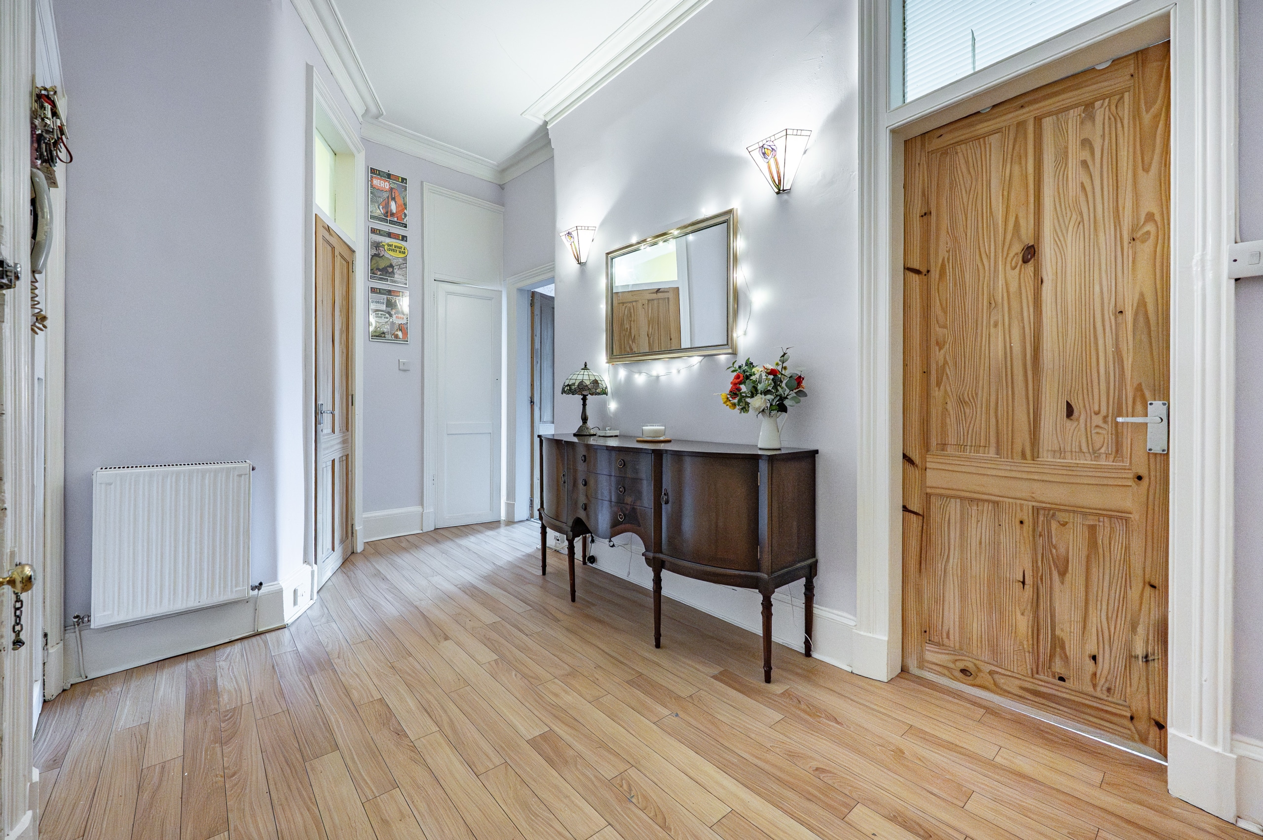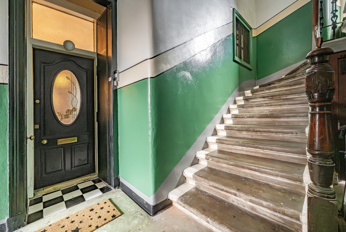 The property opens into a welcoming reception hall, providing access to all apartments and incorporating three well-positioned storage cupboards. There is also a useful walk-in utility space, which could equally serve as a home office or study.