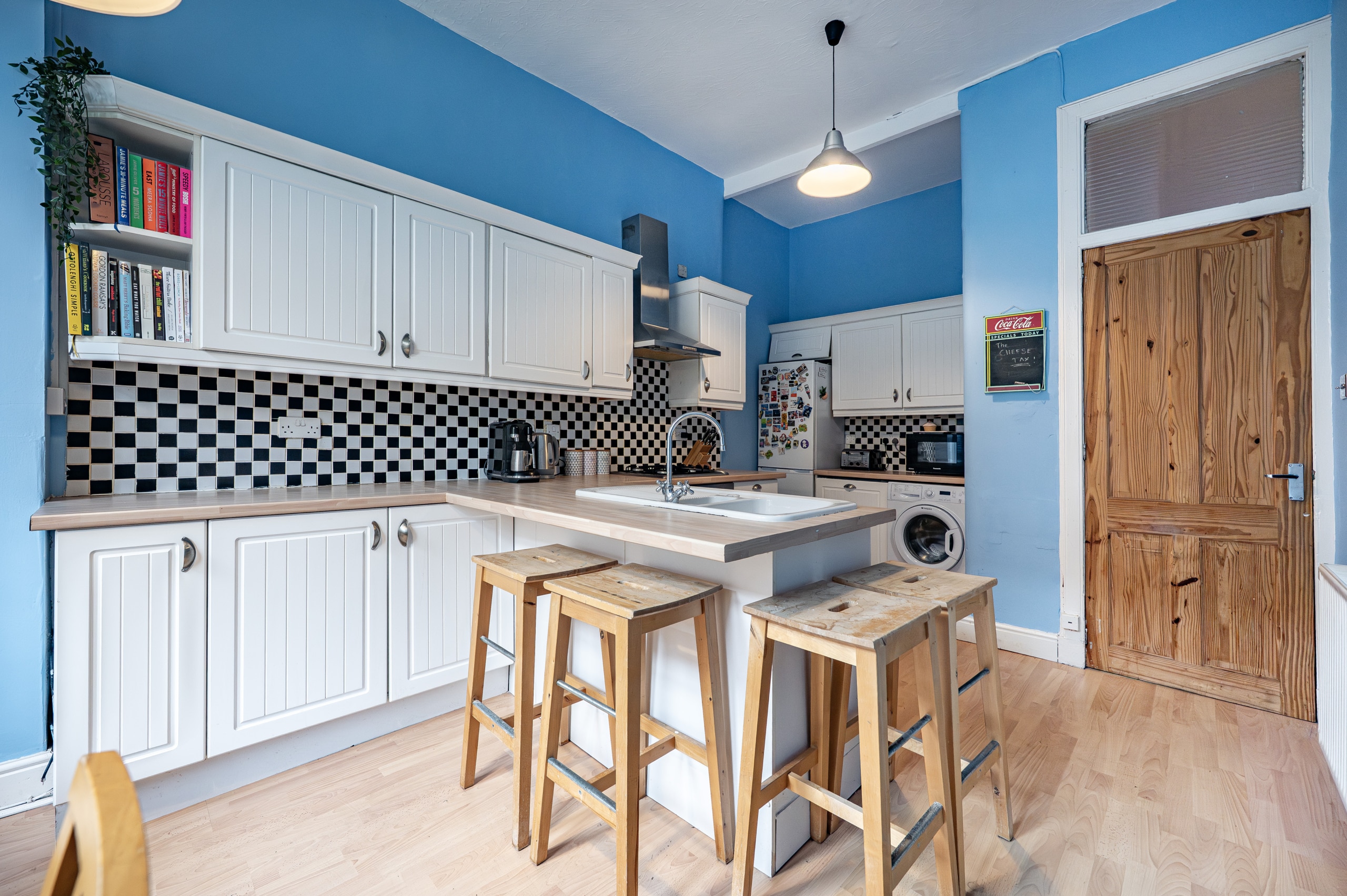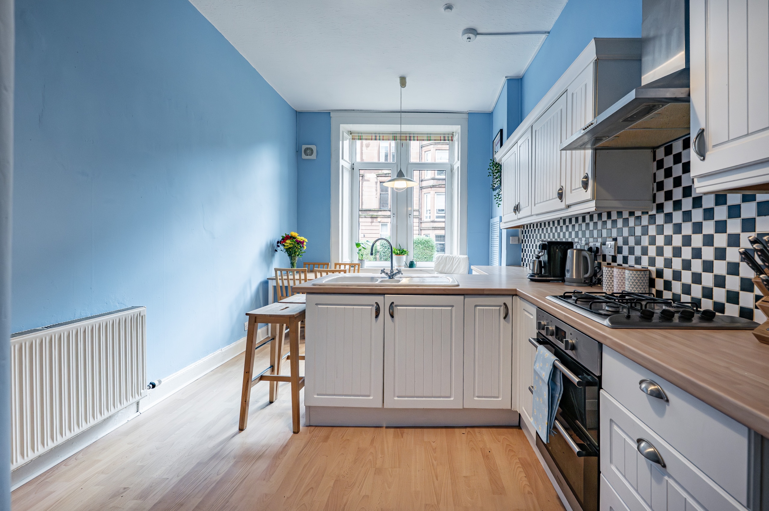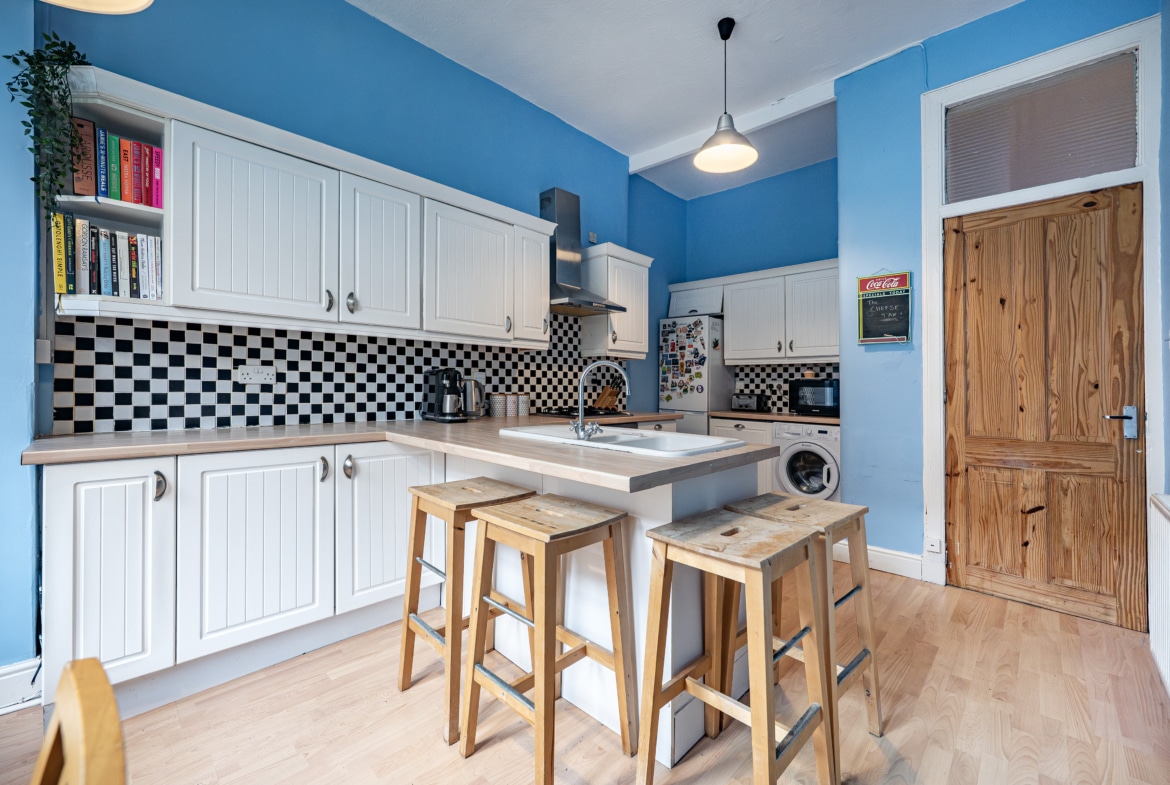 The rear-facing kitchen has been extensively fitted with a range of modern base and wall-mounted units, complemented by a breakfast bar, integrated oven, and gas hob. There is also ample space for freestanding appliances.