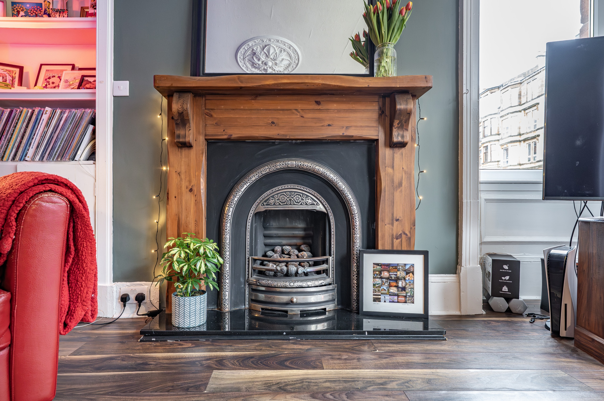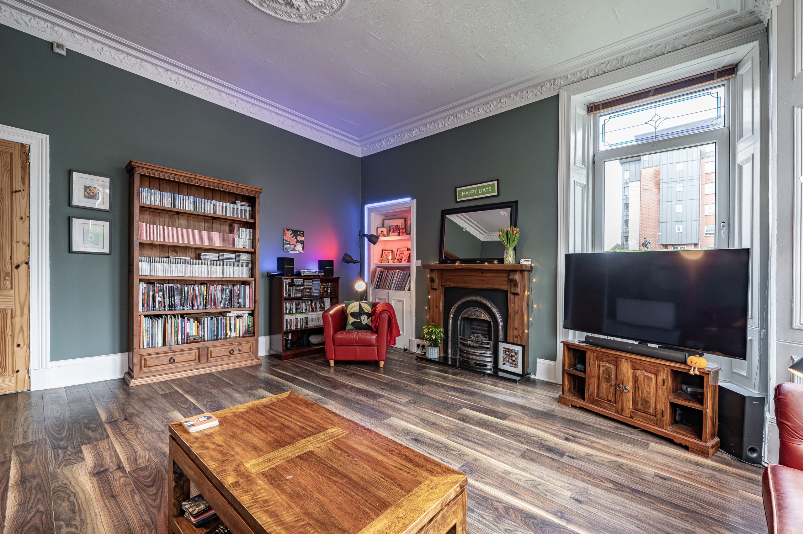 To the front, the impressive formal lounge is flooded with natural light, featuring a large bay window with additional side window overlooking the private gardens. Period detailing includes a focal point fireplace, decorative ceiling cornicing, and a centre rose, enhancing the character of the space.