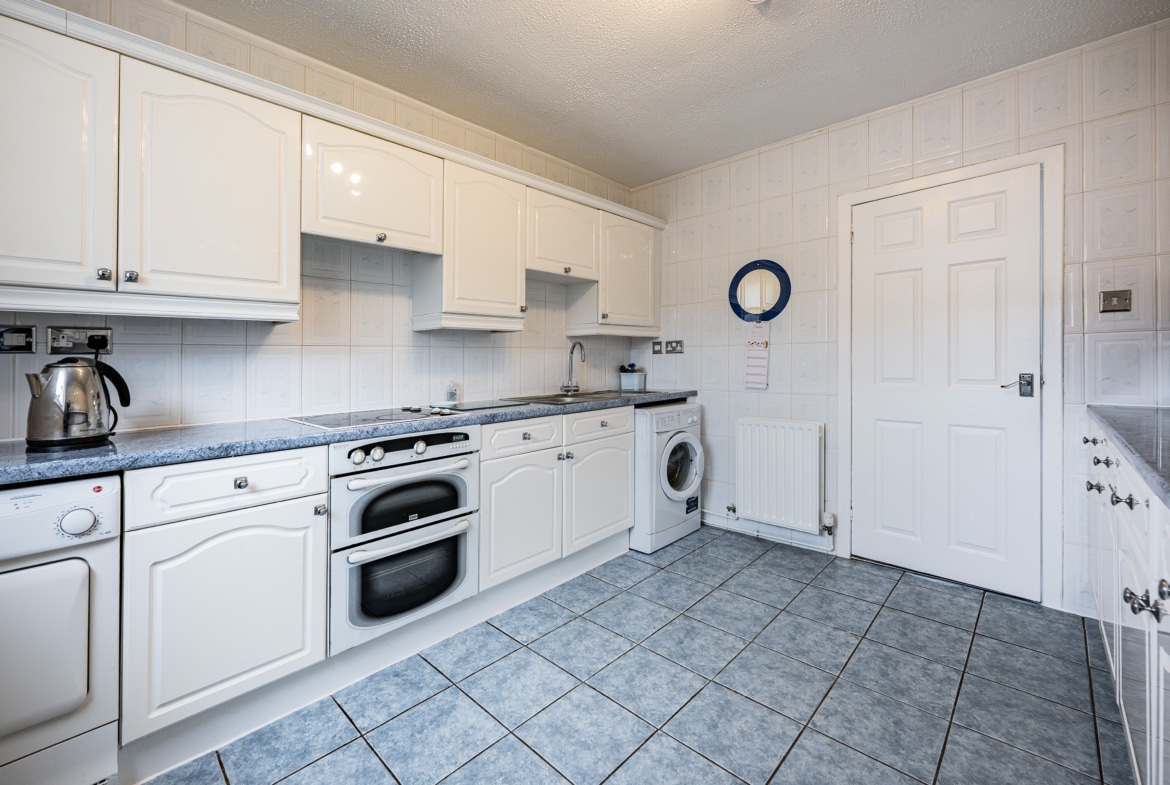 The ground floor opens into a welcoming entrance hallway, thoughtfully designed with three conveniently positioned storage cupboards and a staircase leading to the upper level. The lounge/dining room is a particularly impressive space, overlooking the front of the property and benefiting from a walk-in store cupboard that also serves perfectly as a work-from-home area. Adjacent to this, the kitchen is well-appointed with a range of base and wall-mounted units, an integrated oven and hob, as well as a fridge and freezer, with additional space available for freestanding appliances.