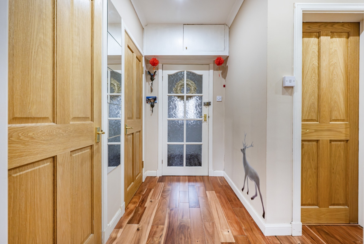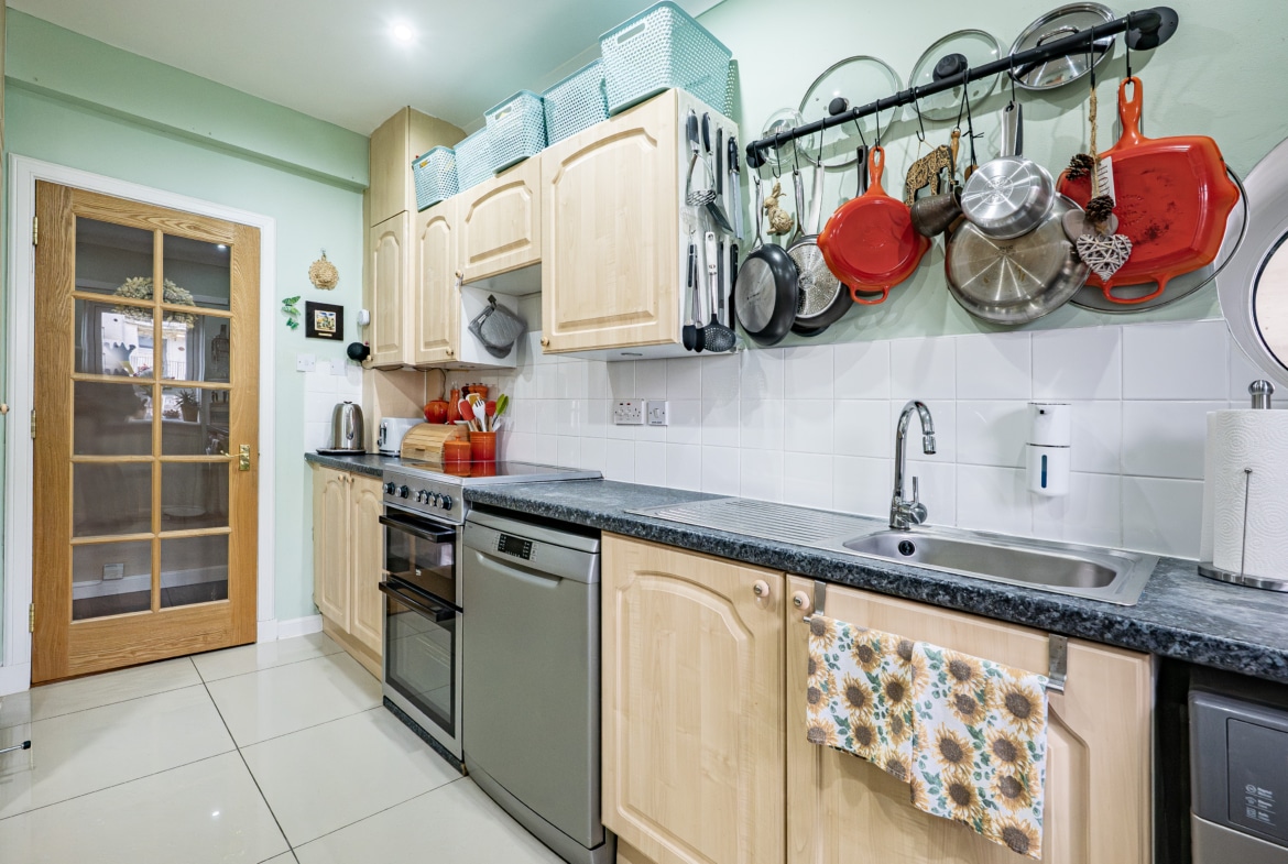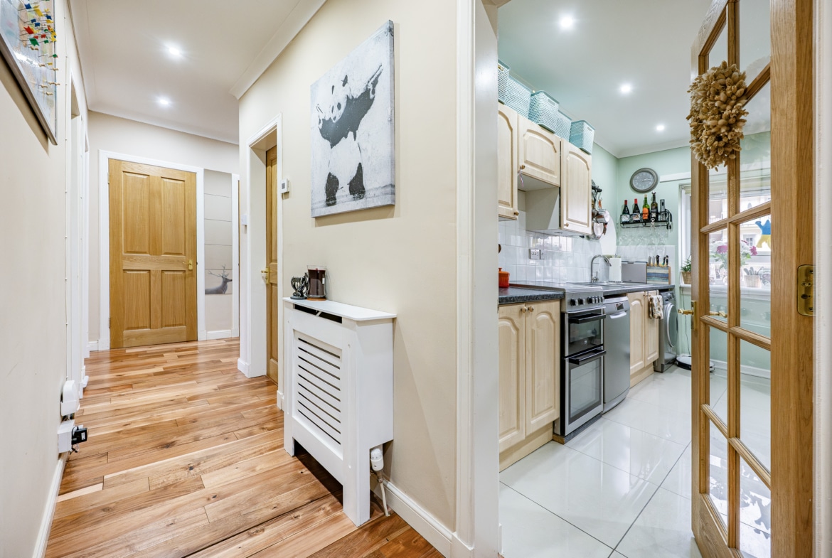 The adjacent kitchen has been fitted with a range of base and wall-mounted units and offers ample space for freestanding appliances. To the rear of the property are three well-proportioned bedrooms, all benefiting from fitted wardrobes or built-in storage. The accommodation is completed by a beautifully appointed bathroom.