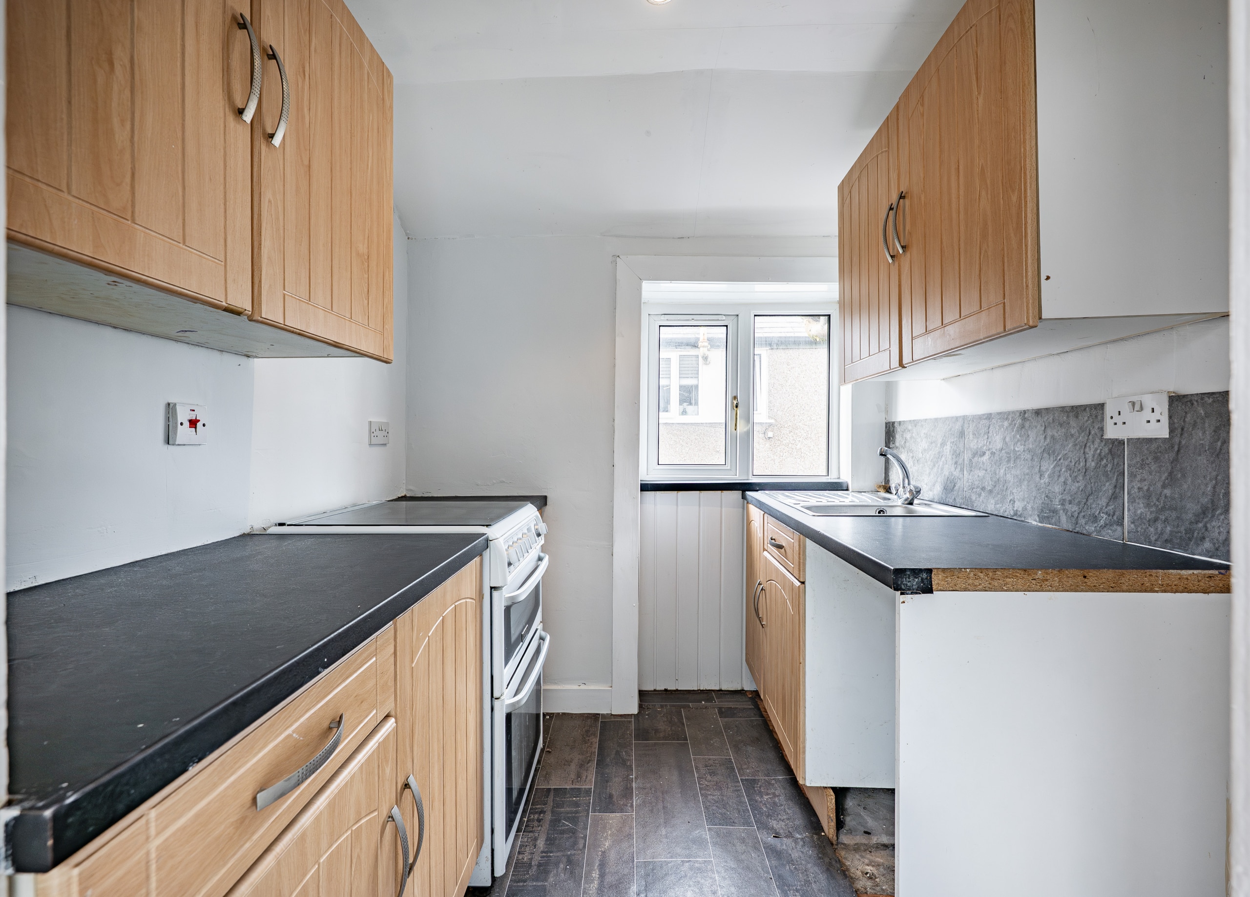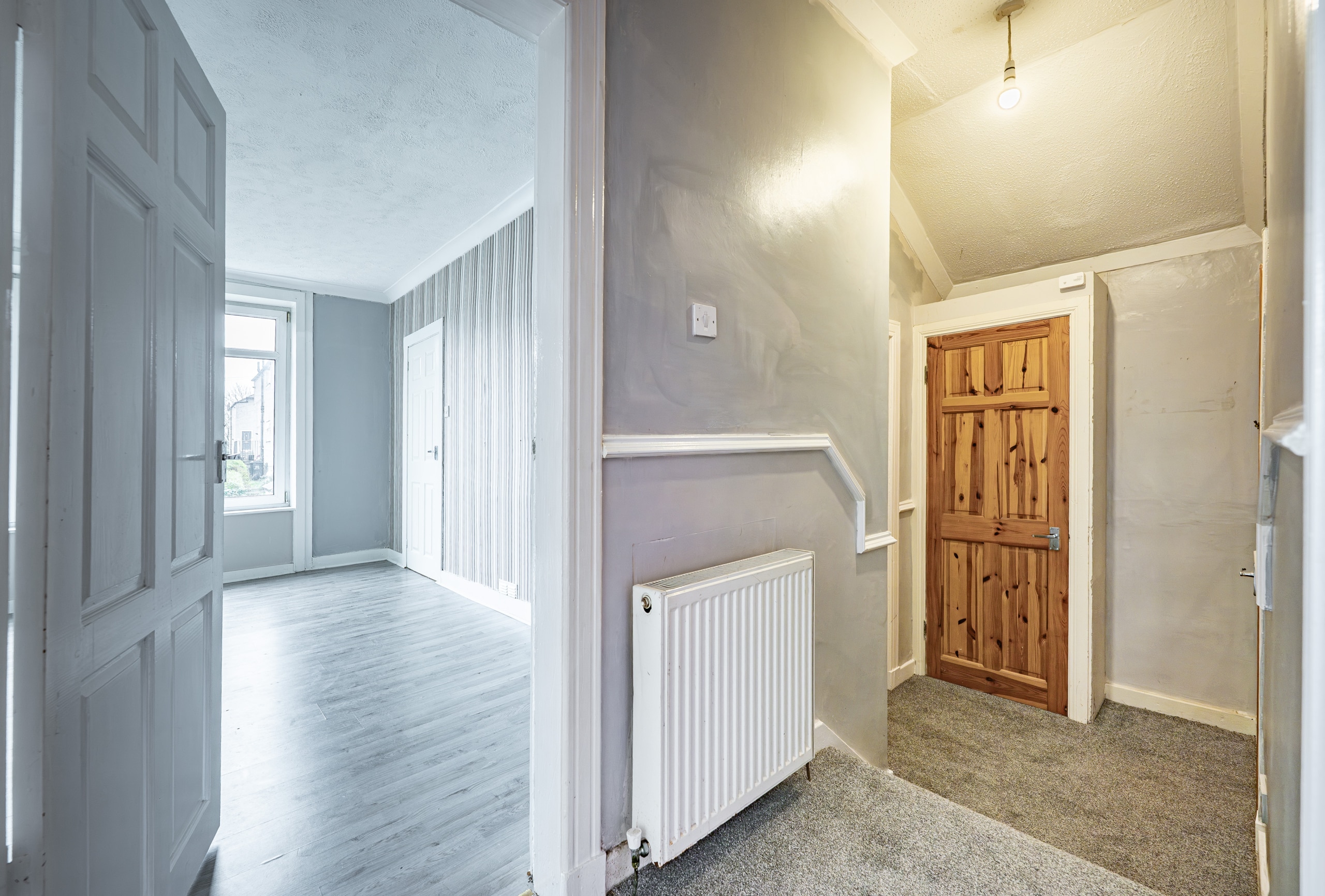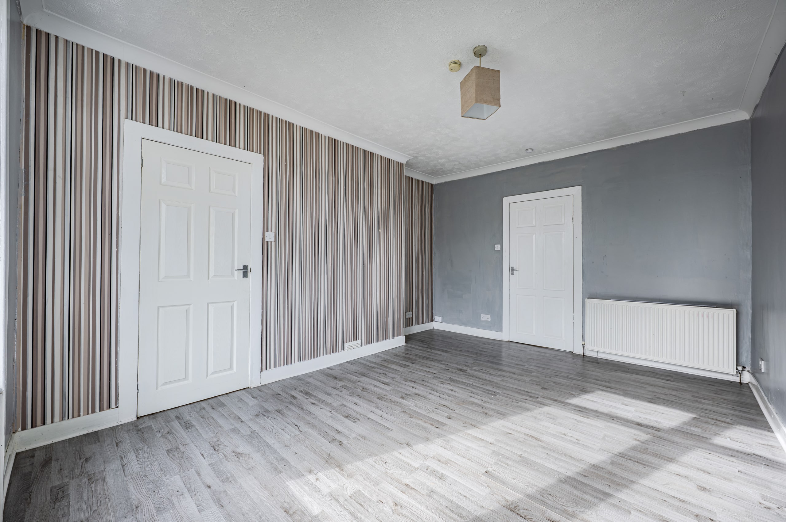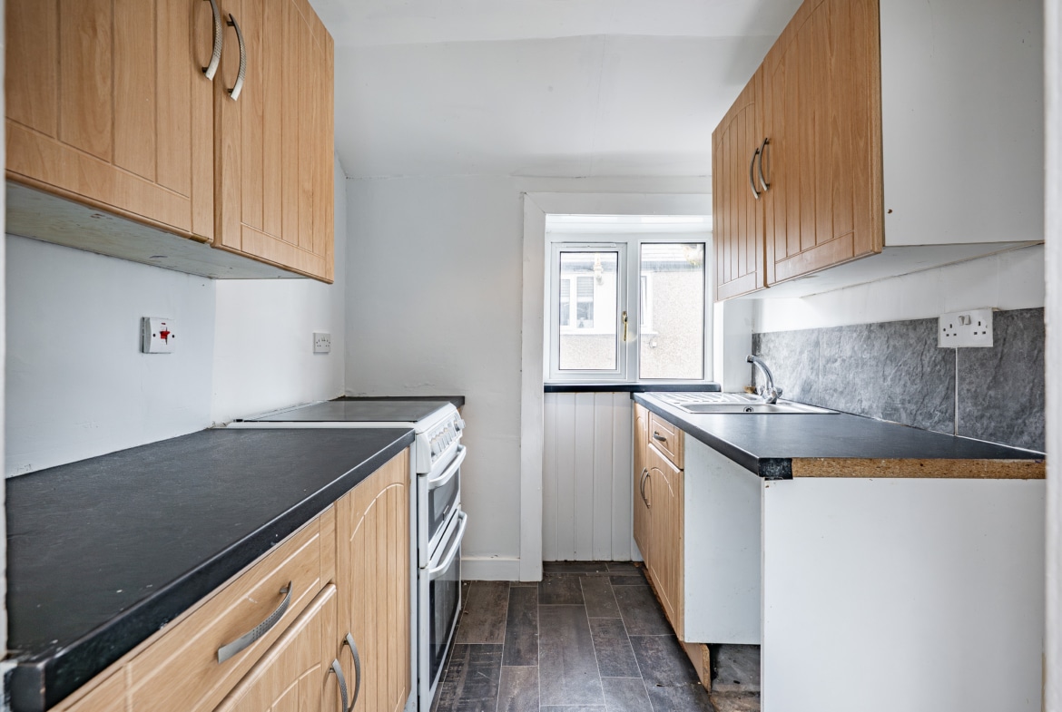 Positioned to the front of the property are two generously proportioned double bedrooms, both benefiting from built-in storage, with the principal bedroom further enhanced by an attractive bay window. A three-piece bathroom completes the internal accommodation.