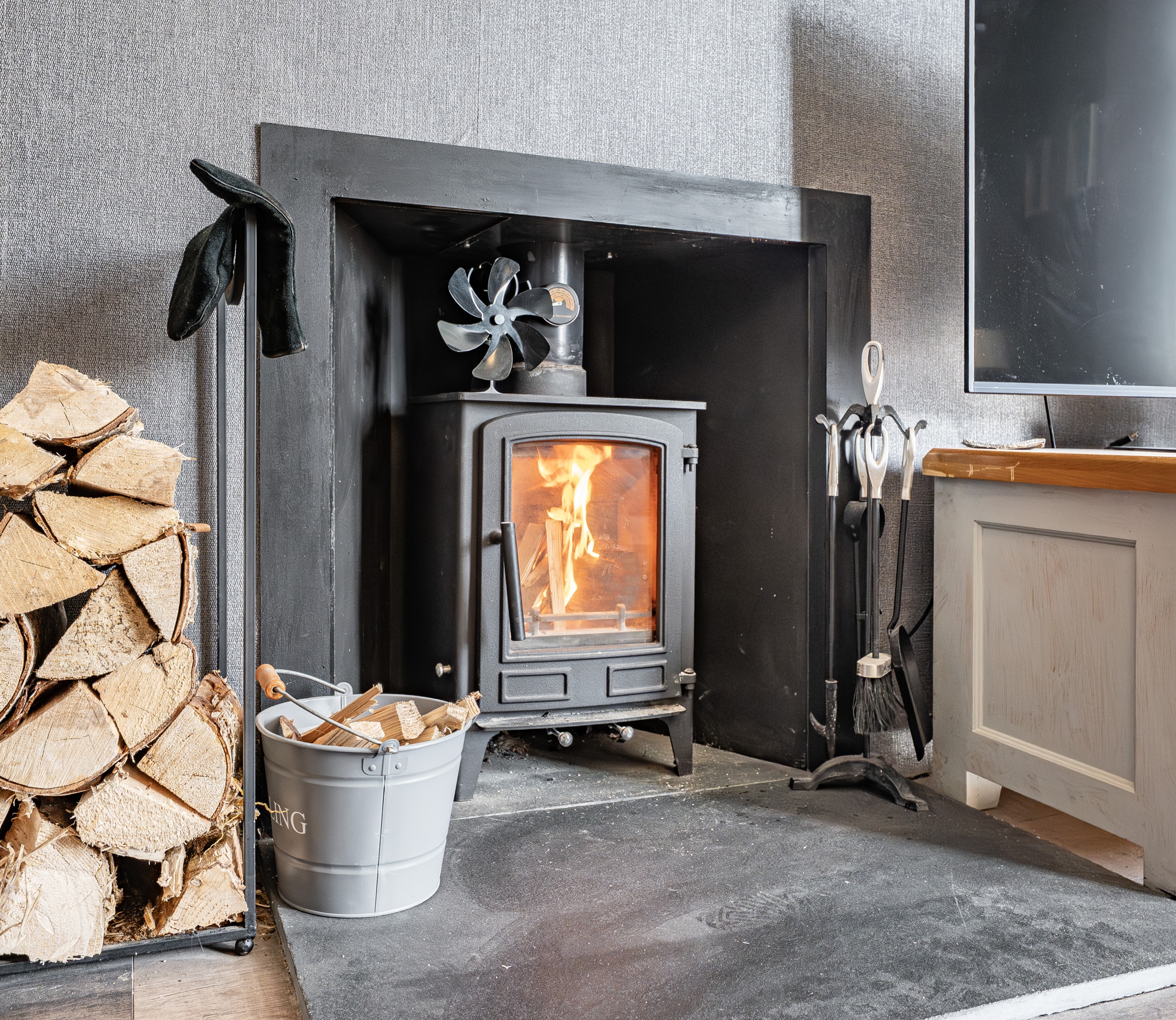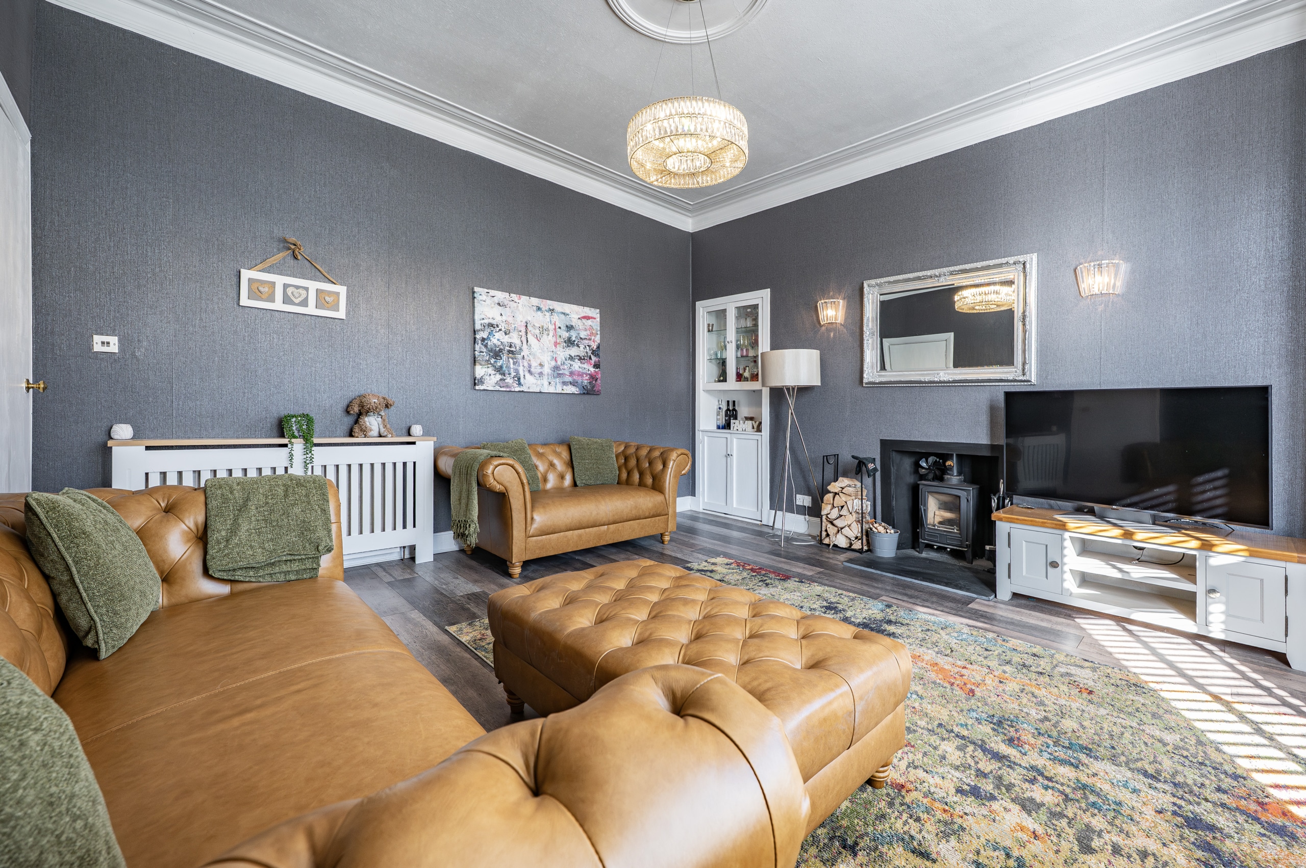 To the front, an impressive formal lounge is bathed in natural light from a large bay window and features a charming log-burning stove, creating a warm and inviting focal point. To the rear, a generous sitting/dining room flows seamlessly into a well-appointed kitchen, fitted with a range of base and wall-mounted units and integrated appliances including a washing machine, dishwasher, fridge freezer, electric oven, and ceramic hob.