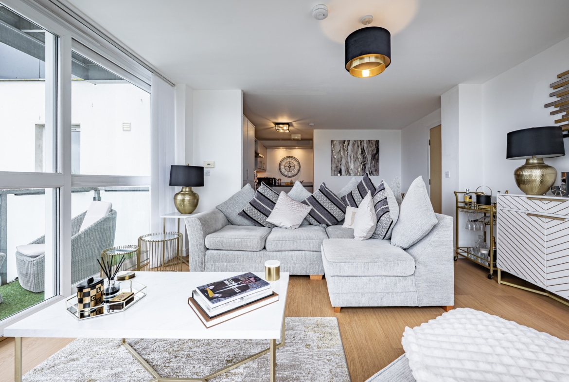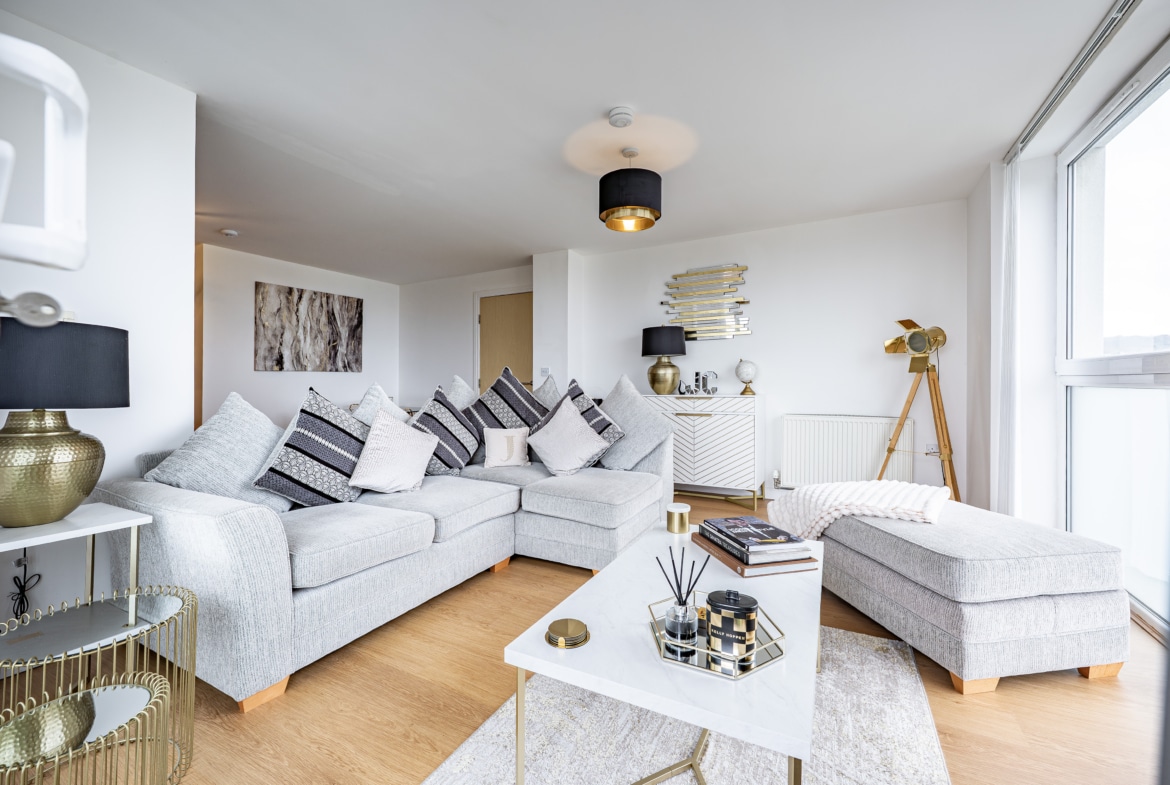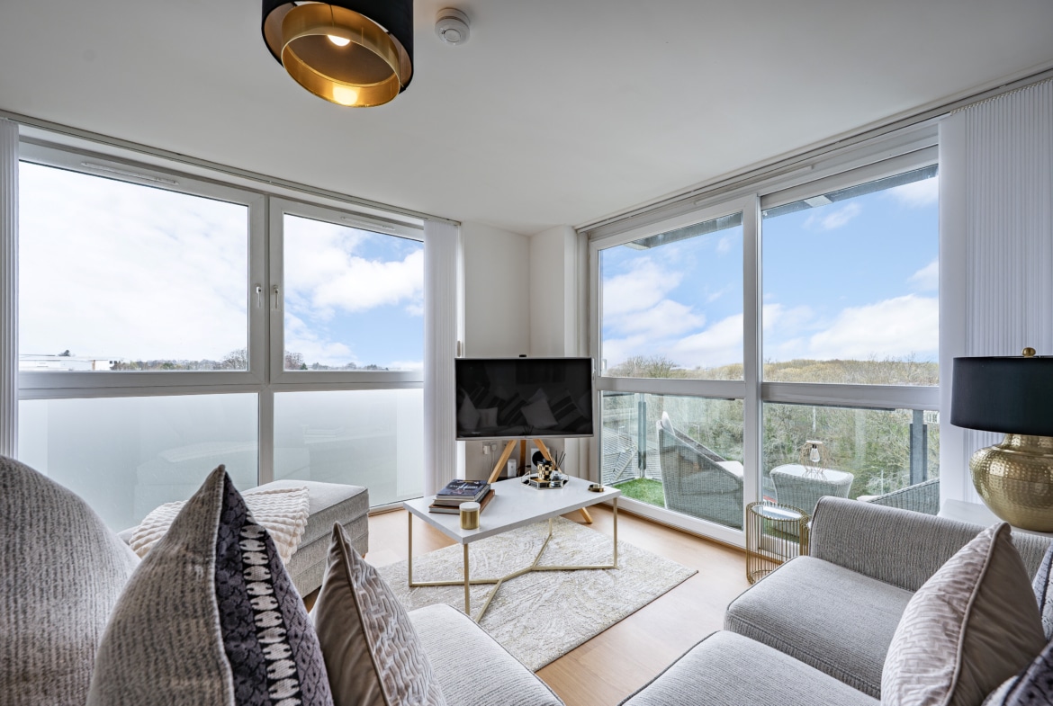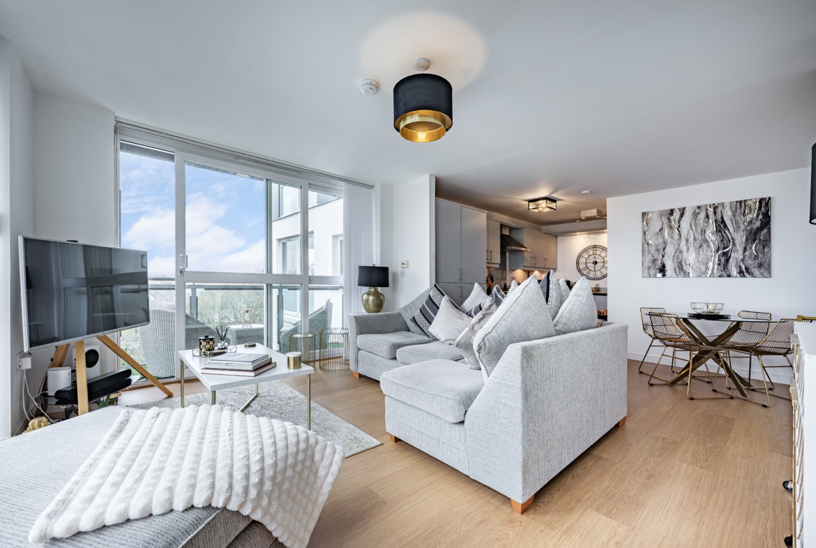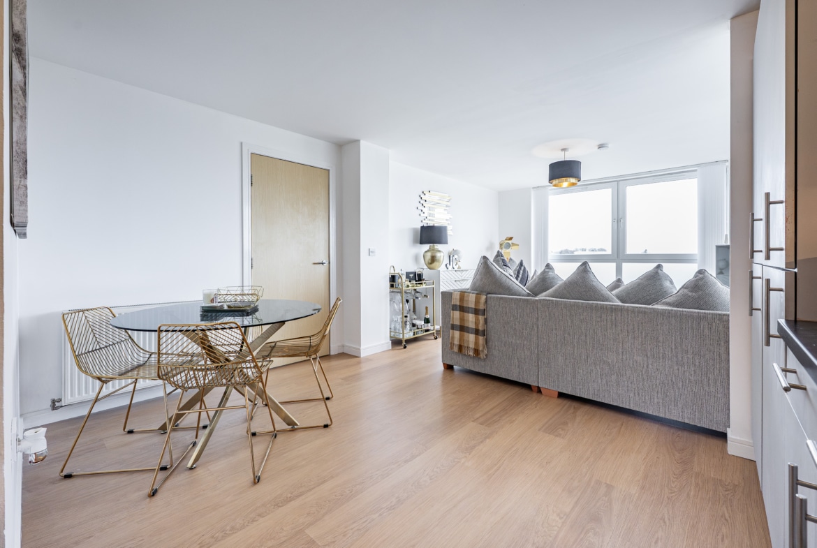 Impeccably presented and finished to an exceptional standard, this stunning three-bedroom corner apartment forms part of the highly sought-after Kings Gait development by Regency Homes, completed circa 2005. Occupying a prime fifth-floor position, the property benefits from an expansive layout with all principal rooms enjoying open westerly aspects. The impressive main living area opens onto a delightful balcony, offering far-reaching views and the perfect setting to enjoy evening sunsets.