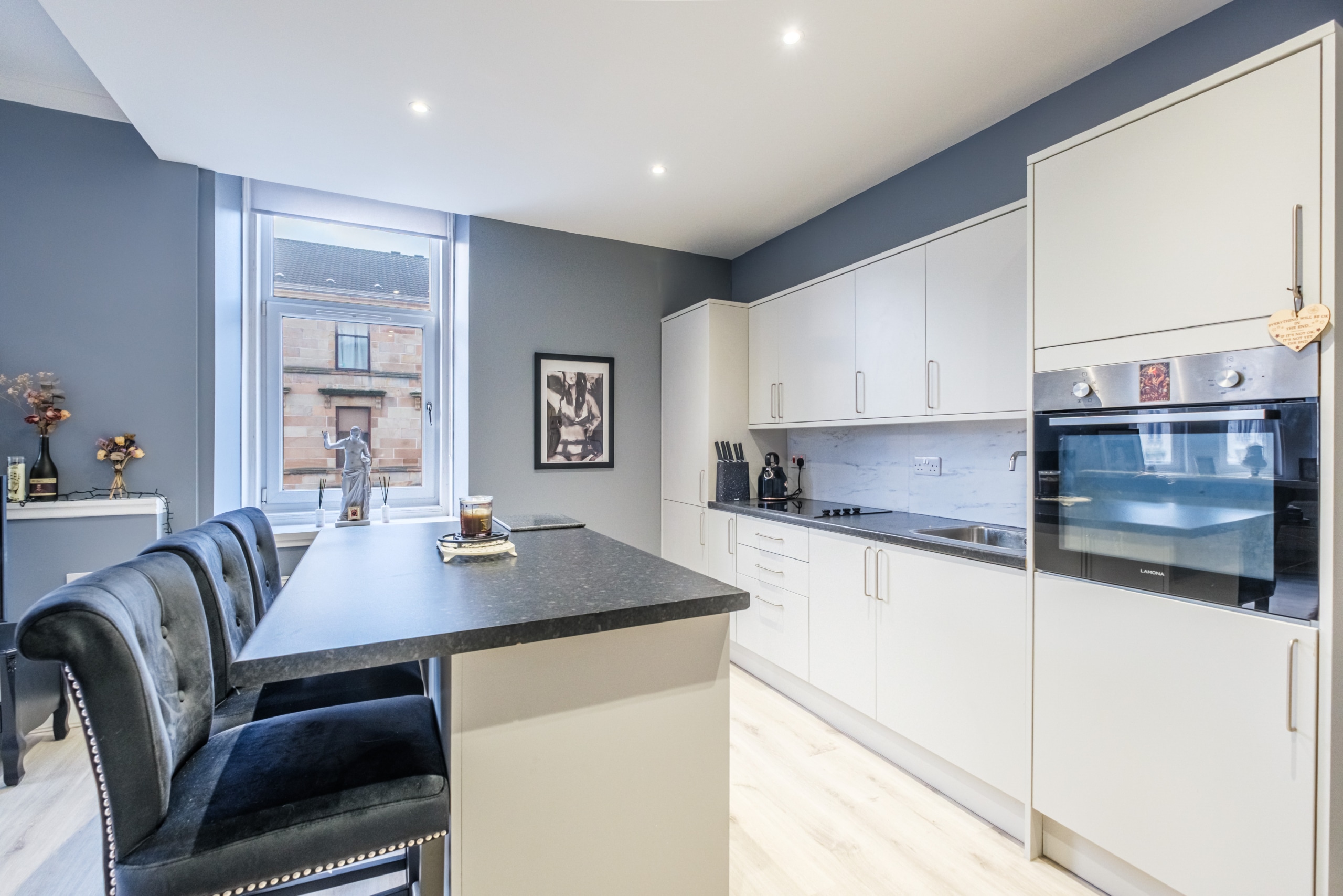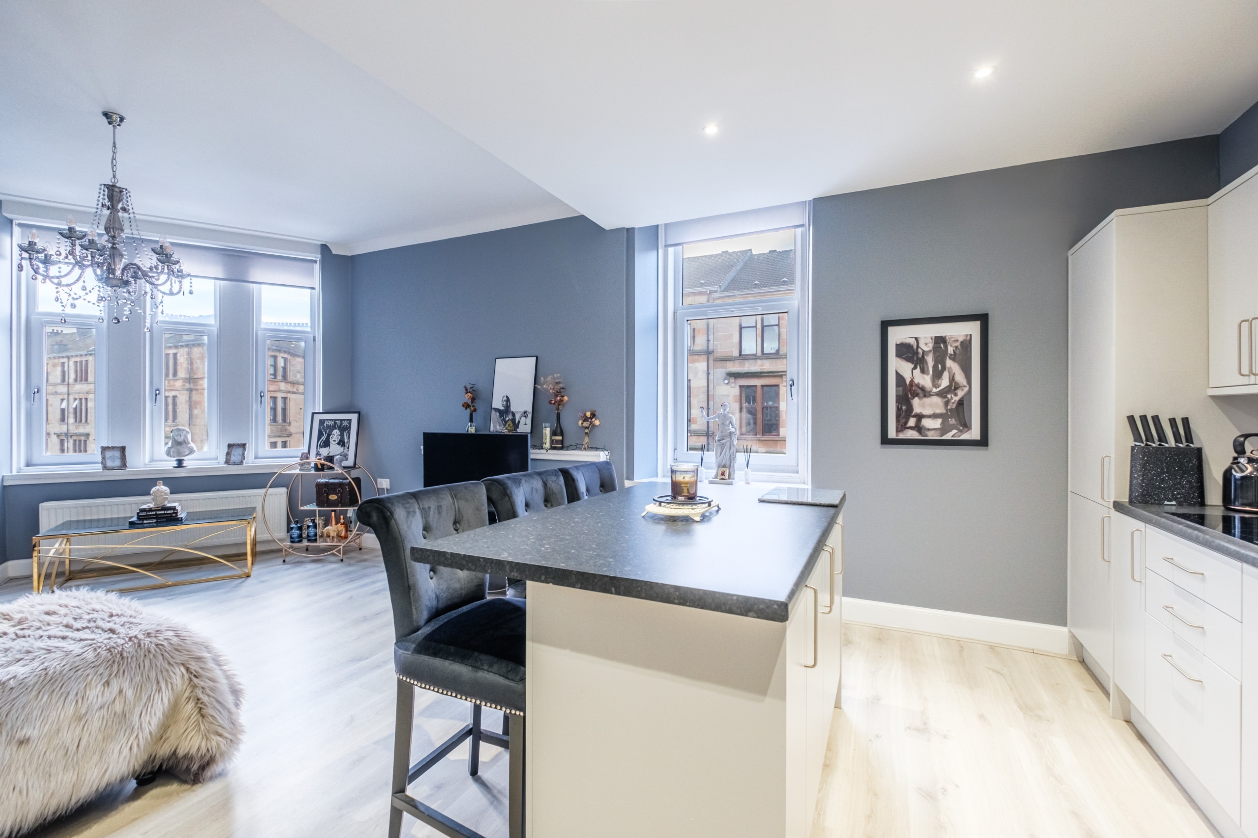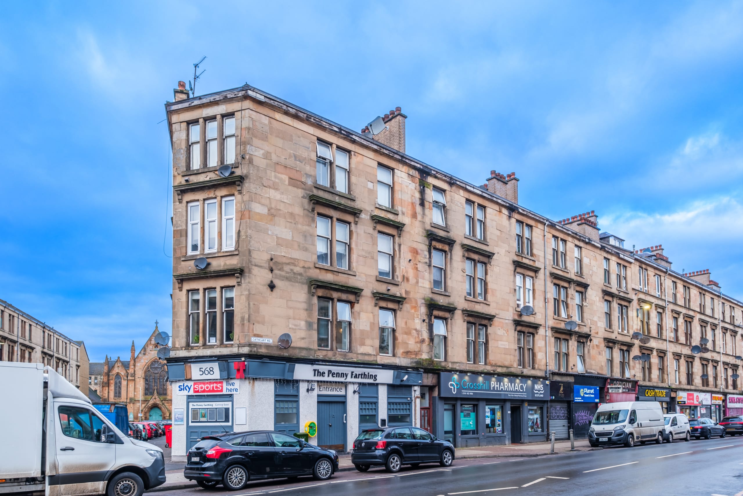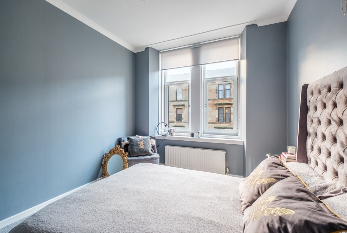 Boasting bright and spacious accommodation which has been cleverly reconfigured within, this attractive tenement flat occupies a prime corner position and is presented to the market to an exacting standard. Benefiting from attention to detail and providing a lovely balance of modernity whist also retaining an abundance of character and charm, the impressive interior comprises shared entrance and stairwell, welcoming reception hall which provides access to all the main apartments. and with convenient storage cupboard off. There is a beautifully presented and spacious lounge enjoying a prime corner position with views directly down Cathcart Rd. The accommodation continues with a bespoke re-fitted kitchen. This is set on open plan basis to the lounge and boasts an attractive array of base and wall mounted storage units, complementary work top surfaces, co-ordinated splash back, convenient breakfasting bar/island and a range of appliances. Continuing further, this exceptional home offers two spacious double sized bedrooms, both tastefully presented and of excellent proportions whilst a luxury modern fitted bathroom incorporating a W.C, bespoke vanity wash hand basin, and shower cubicle completes the accommodation overall.