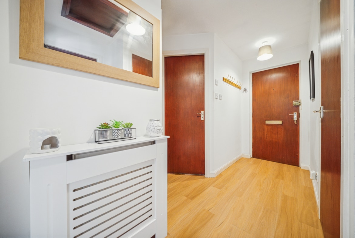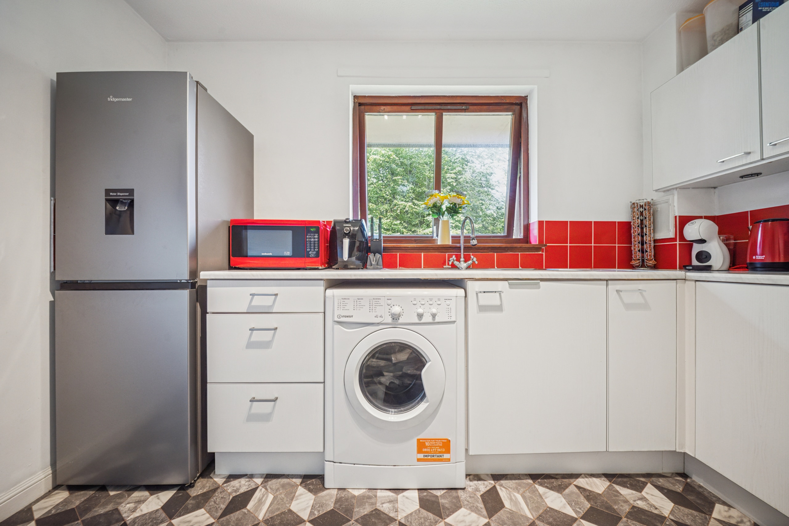 Accessed via a secure communal entrance, the home’s front door opens into a welcoming vestibule followed with a door to the internal hallway where we access all accommodation including a large walk in storage cupboard. At the end of the hallway, you are drawn into the generously proportioned living room with tasteful décor paired with laminate flooring there is space for both living and dining furniture and it is flooded with natural light from the front facing window. Accessed from the living room is the kitchen fitted with a range of white cabinets framed by contrasting work tops, cooker, freestanding washing machine, and fridge/freezer.