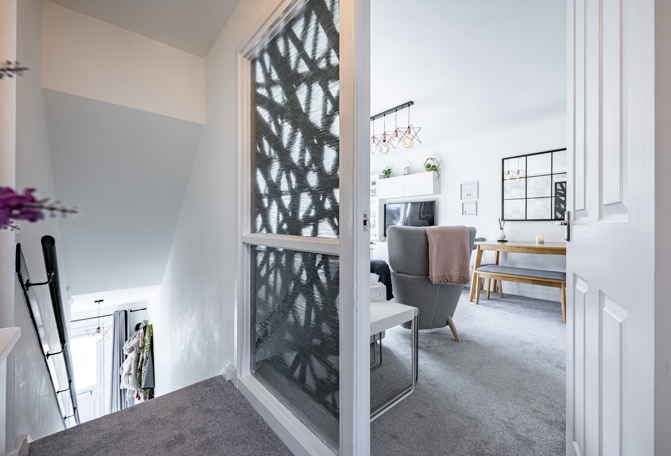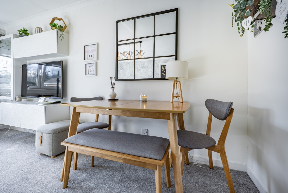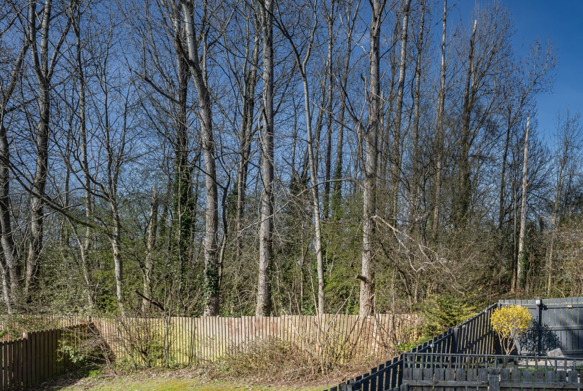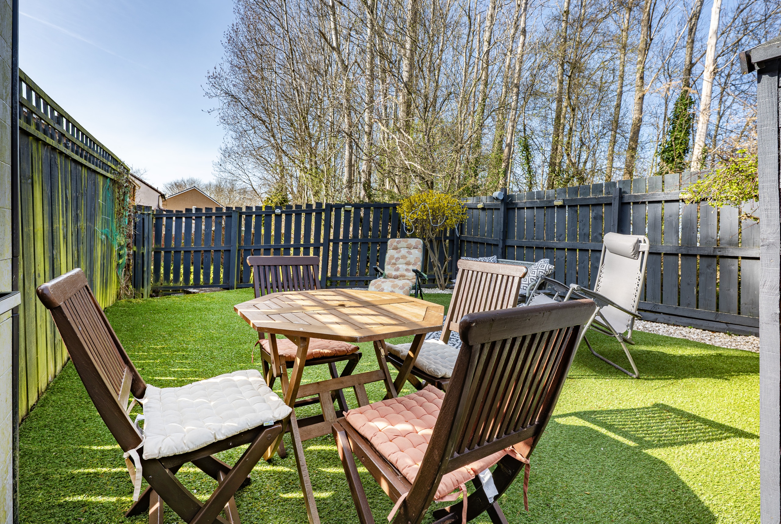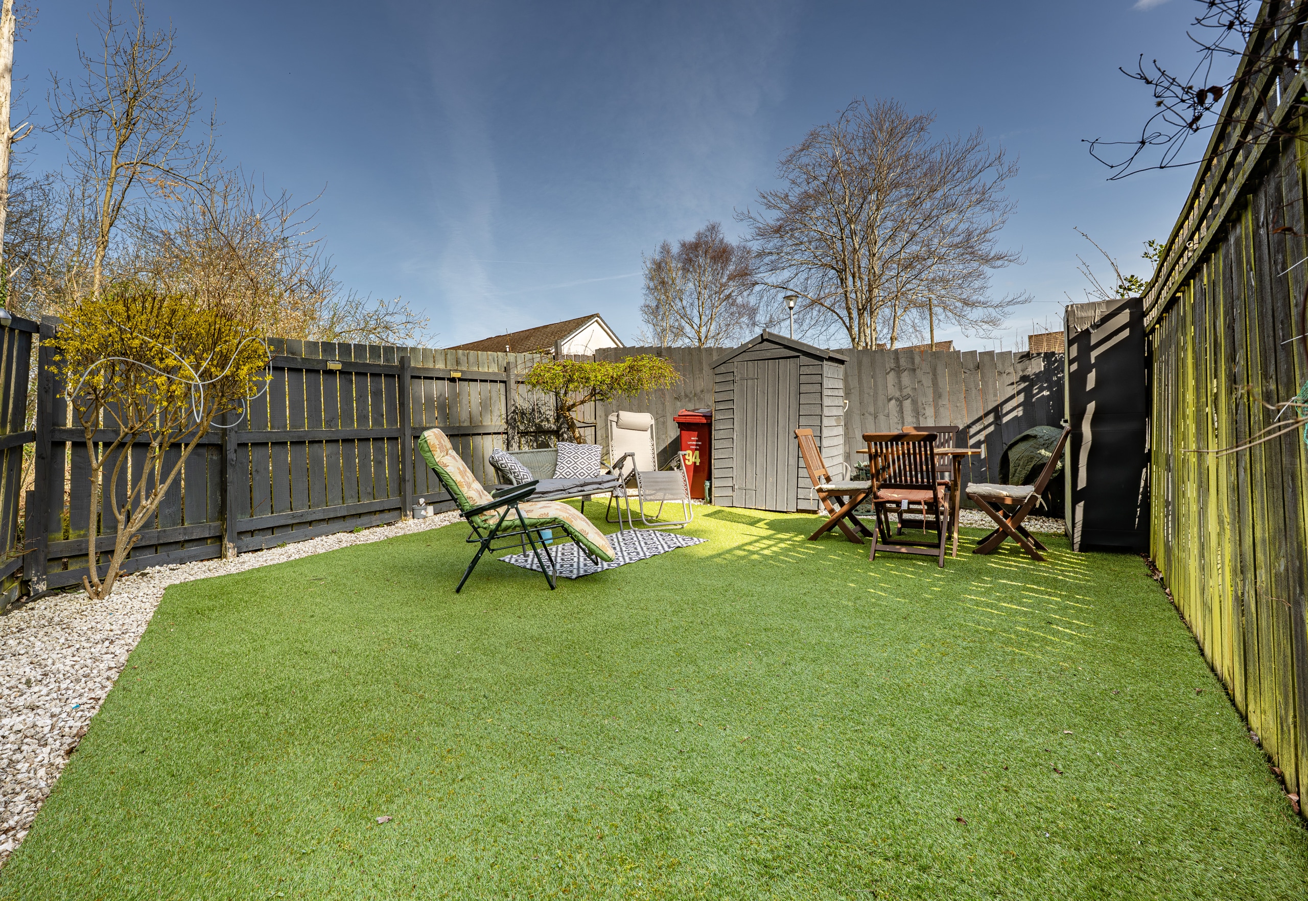 Externally, the property enjoys a lovely private garden to the rear. The rear garden is enclosed with full-height perimeter fencing and screened by mature trees, creating a tranquil and private outdoor space. Designed for ease of maintenance, the garden is laid with artificial lawn and also includes a useful timber shed.