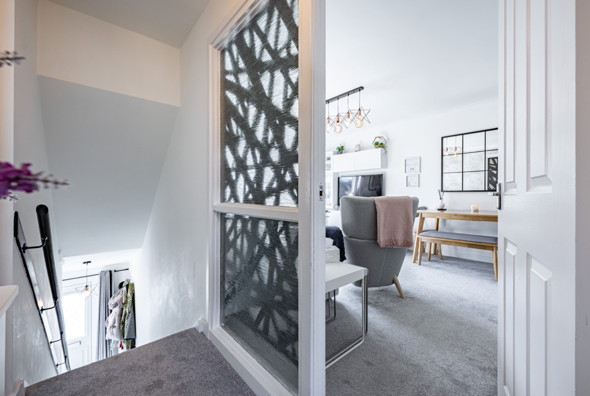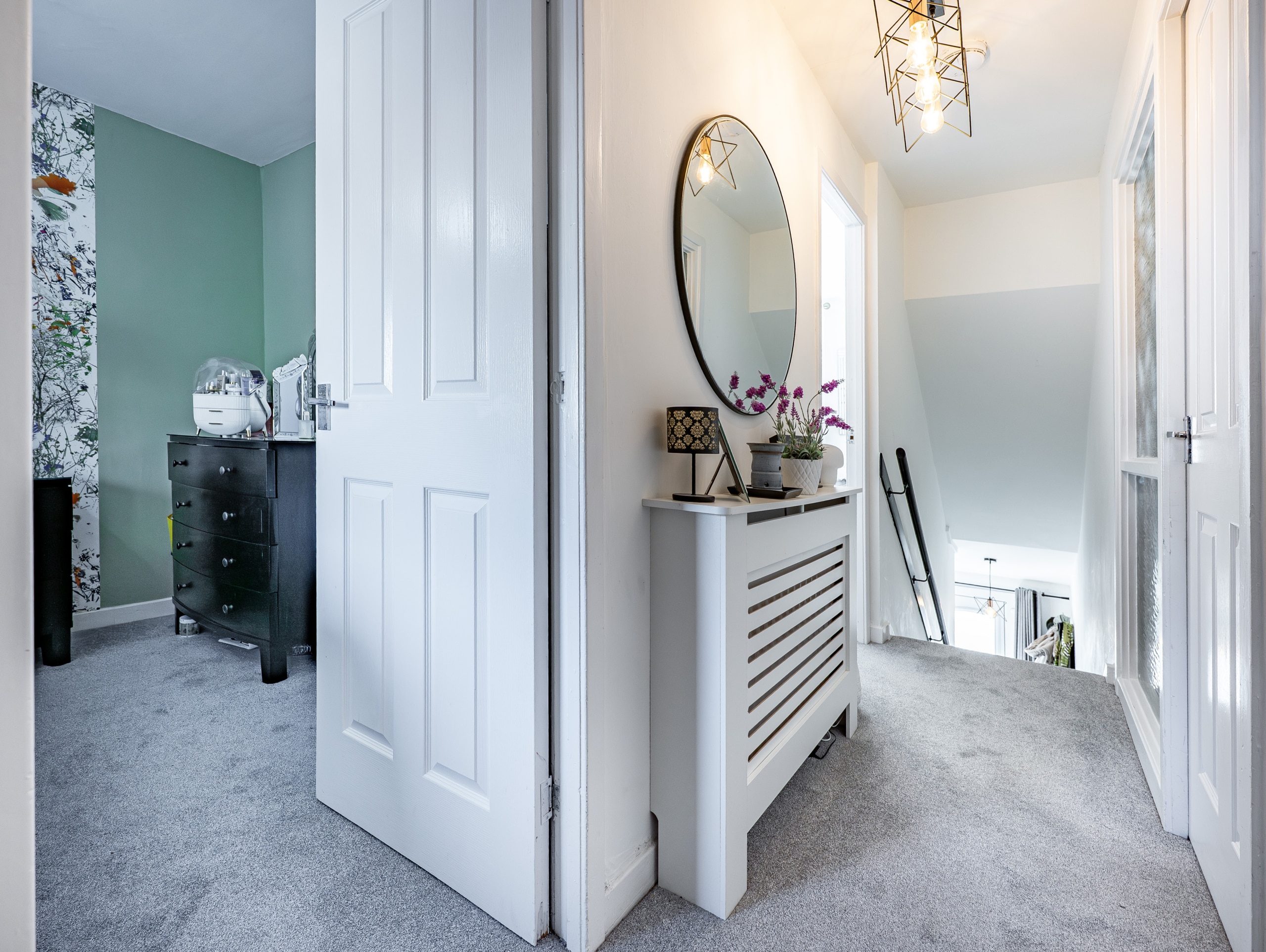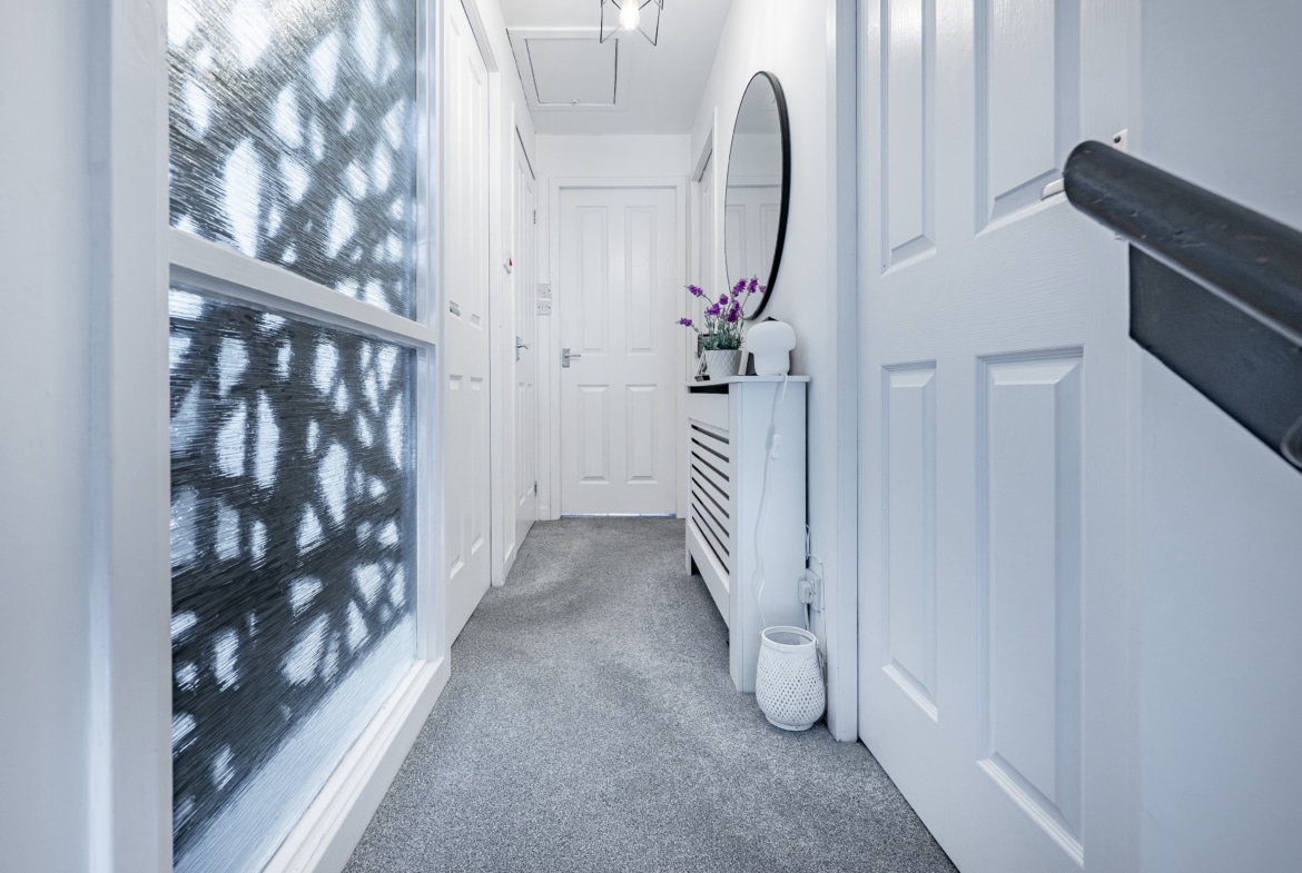 The accommodation comprises a private entrance vestibule at ground floor level with a stairway leading to the upper hallway. The hallway provides access to all apartments and includes a fitted linen cupboard together with an overhead hatch leading to a valuable attic storage area. The bright, south-facing lounge/dining room is an attractive and spacious apartment positioned to the front of the property, with access through to the kitchen at the rear. The kitchen is well appointed with a range of base and wall-mounted units and is equipped with an integrated washing machine, dishwasher, double oven, gas hob, and space for a freestanding fridge freezer.