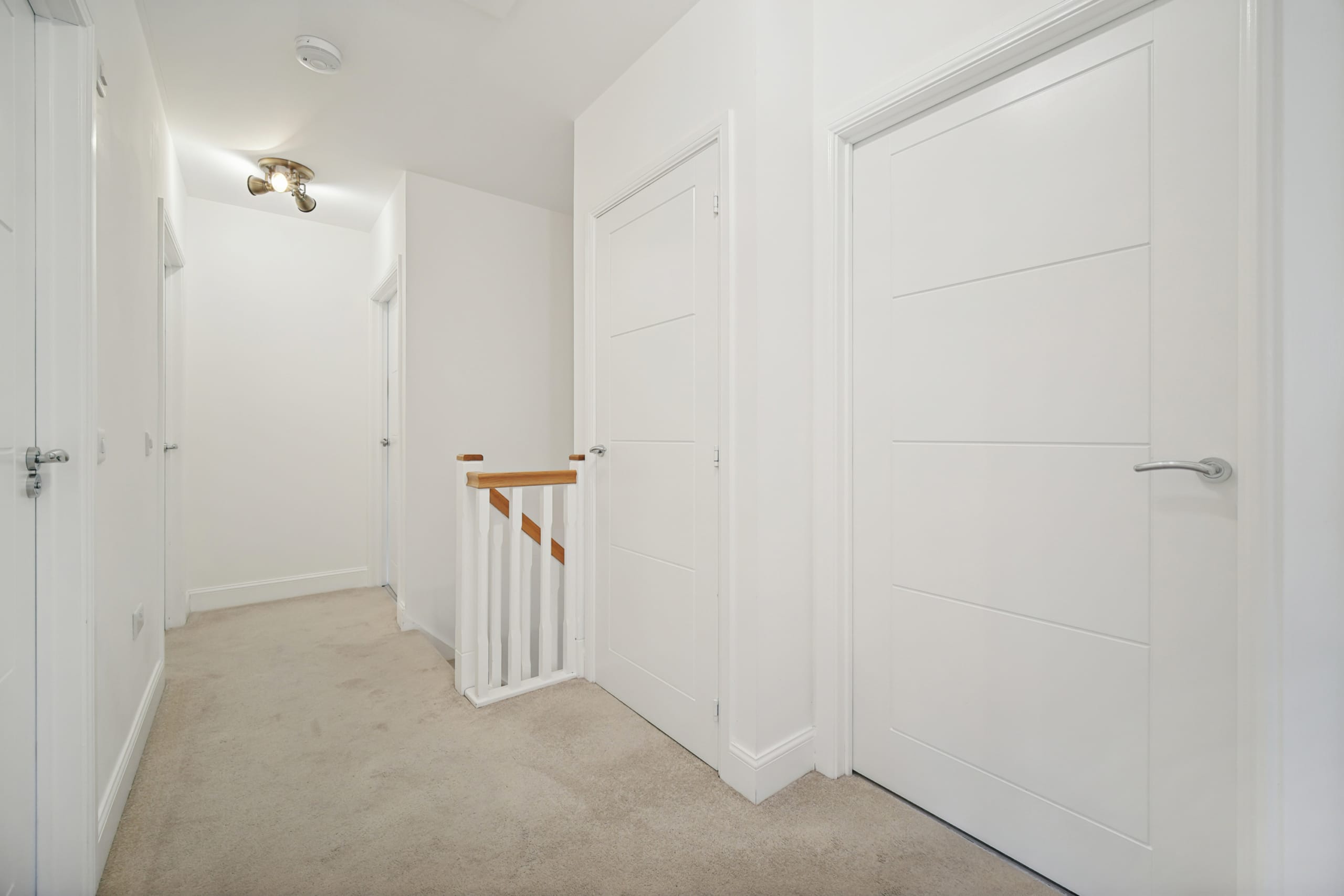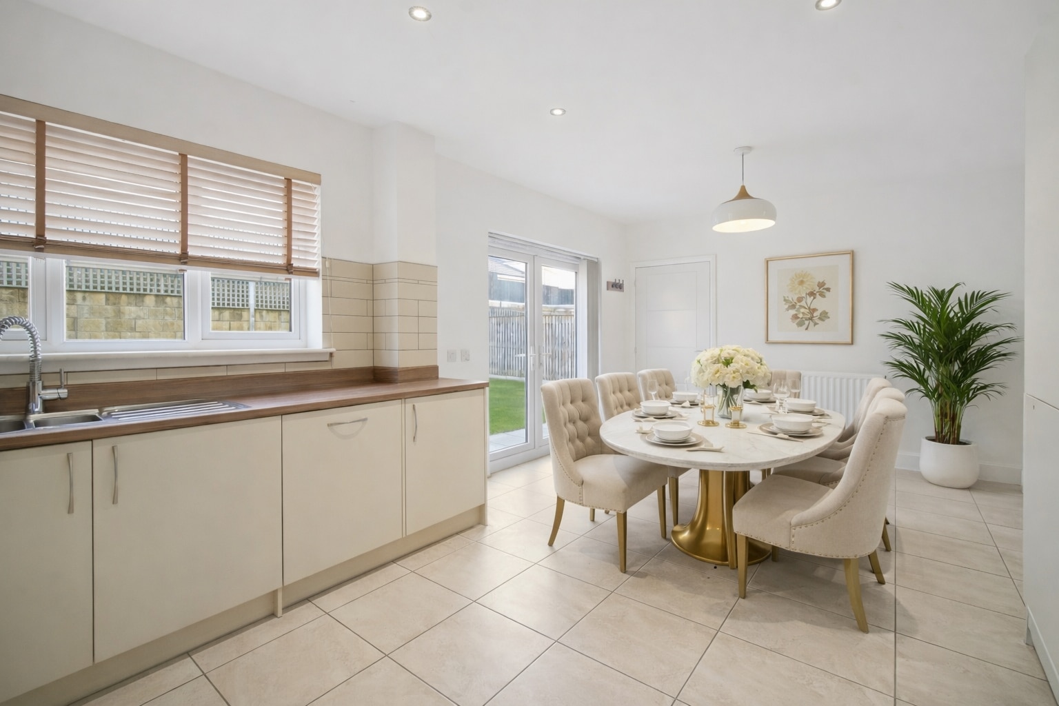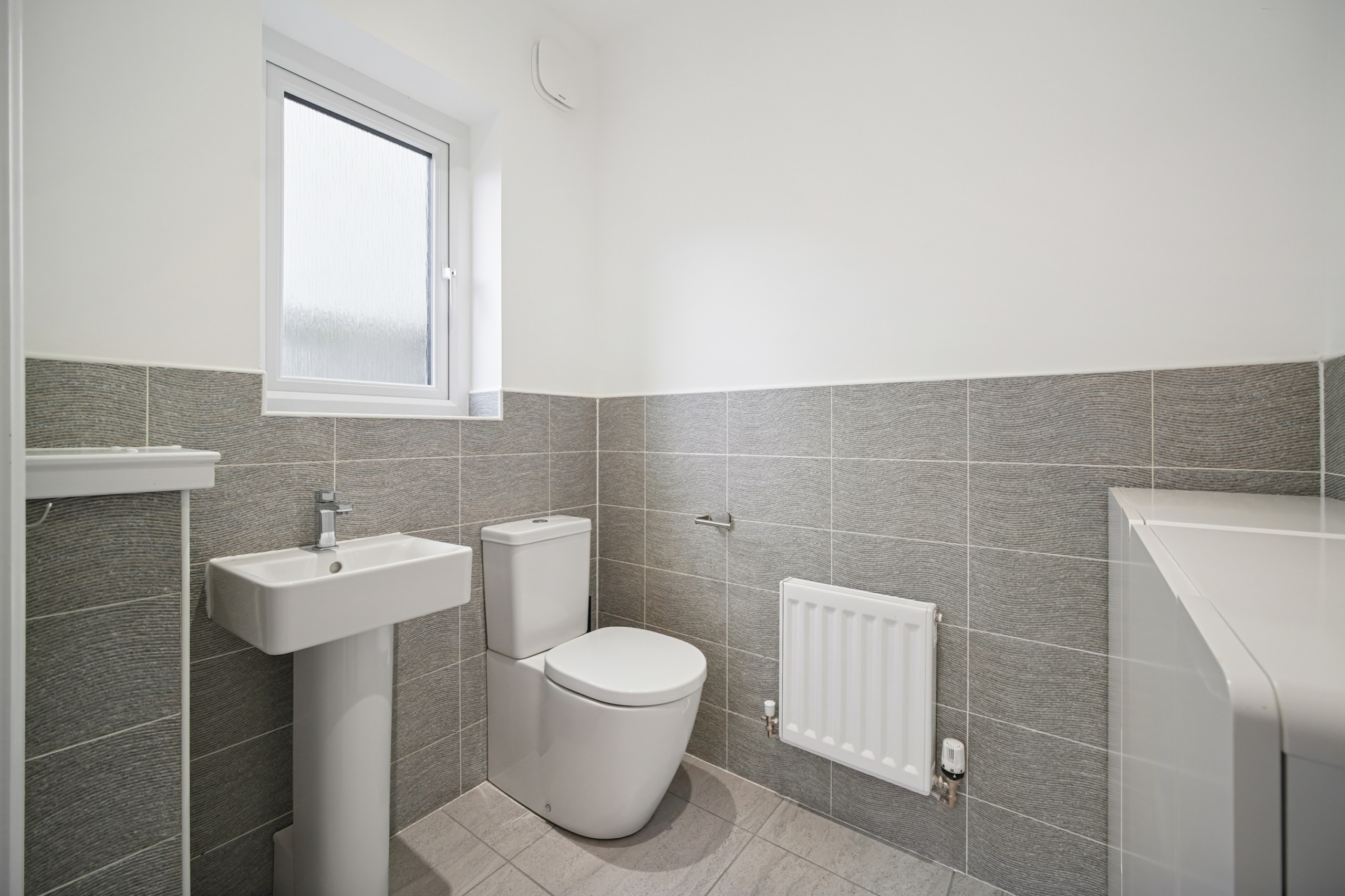 Extending to 1278 sq. ft., this immaculately presented home is thoughtfully laid out and ideal for both family life and entertaining. A welcoming entrance hall with stylish tiled flooring provides access to the ground floor accommodation. On your left you are drawn into the living room, this spacious room boasts neutral décor including a plush carpet, the generous footprint offers ample space for various furniture configurations and extends into a bay window. At the end of the hallway, you step into the impressive open plan kitchen/dining room, the real heart of the home. The kitchen area is fitted with a plethora of cream cabinets framed by a sweep of contrasting work top space and metro tiled splashback, integrated electric oven, gas hob, fridge, freezer, and dishwasher. The dining area offers excellent floor space for a large table and chairs perfect for family meals or entertaining larger groups. The room is flooded with natural light from the kitchen window and French doors which open out to the enclosed, south facing garden. A separate utility room provides additional storage, a washing machine, and space for a tumble dryer. Completing the ground floor is a cloakroom, tiled to dado height with toilet, and sink.