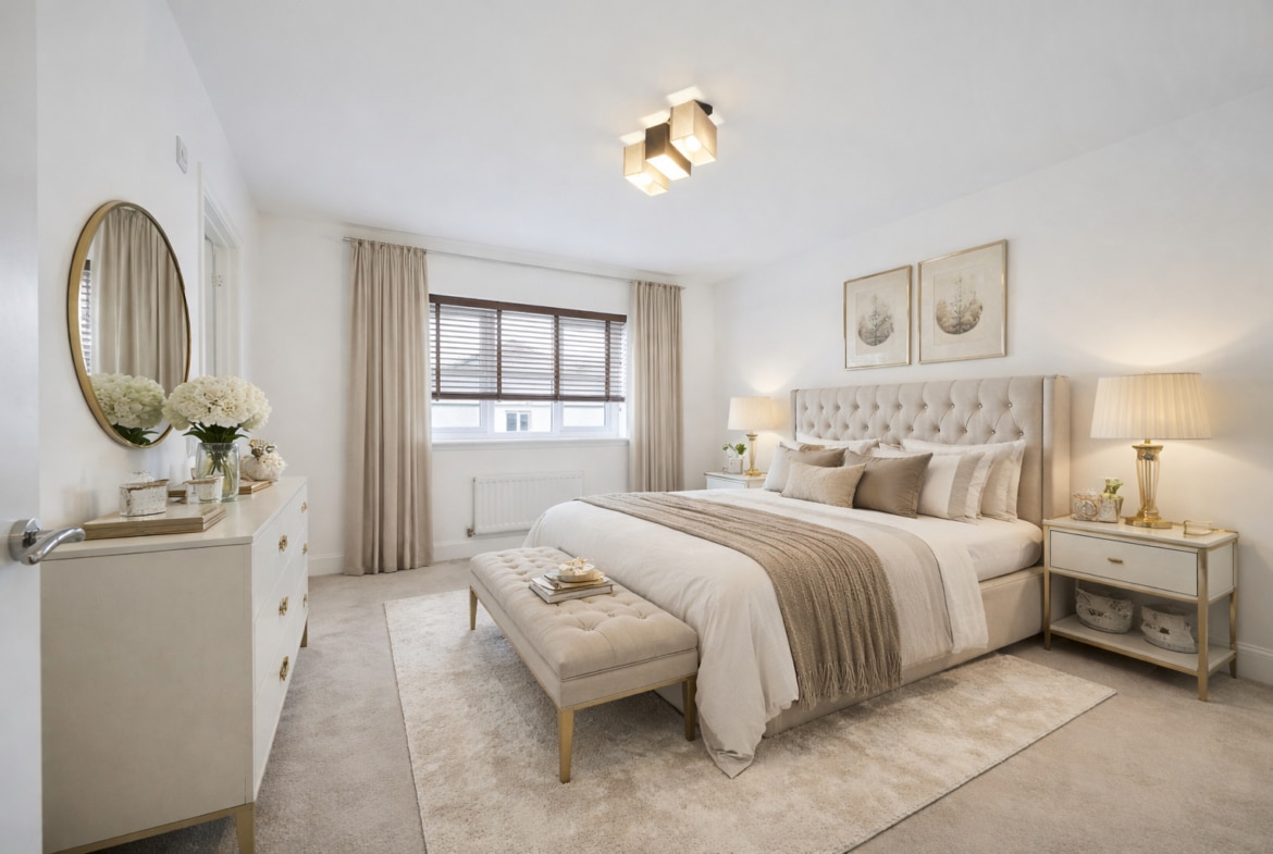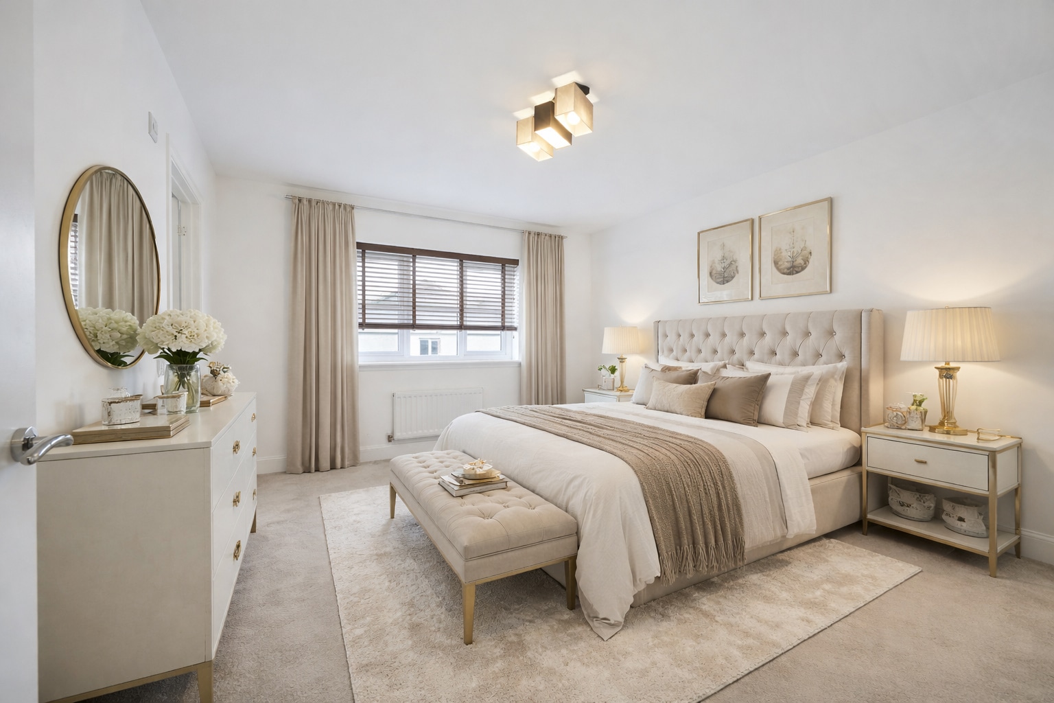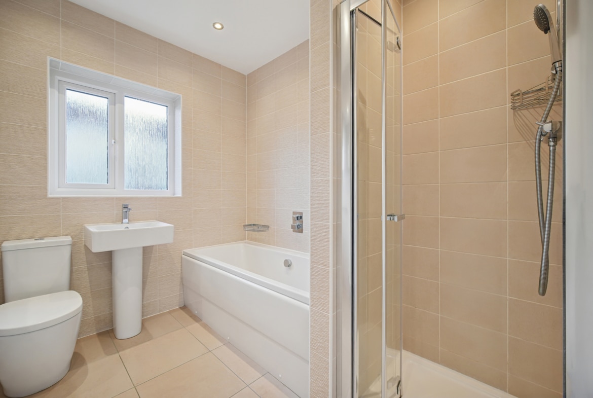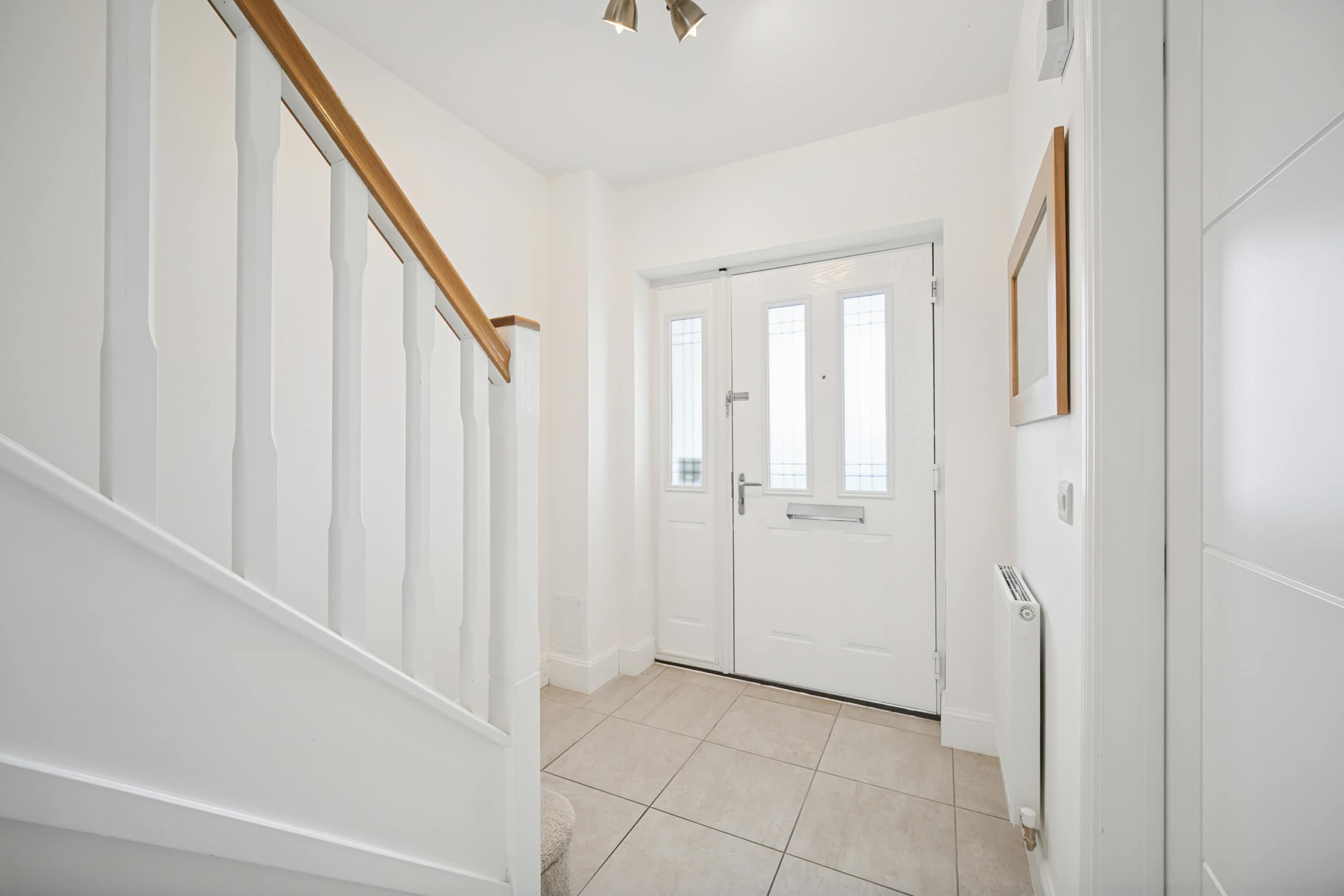 Upstairs, a carpeted staircase and landing provide access to four sizeable bedrooms and the family bathroom. The principal bedroom is posted to the front of the property, it is a spacious suite with space for a king-sized bed, freestanding furniture, two built-in wardrobes and an ensuite shower room. Three further bedrooms provide versatile accommodation for family, guests, or home working, all served by a well-appointed, fully tiled family bathroom with bath, separate shower cubicle with thermostatic shower, toilet, and sink. Gas central heating and double glazing provide year-round comfort.